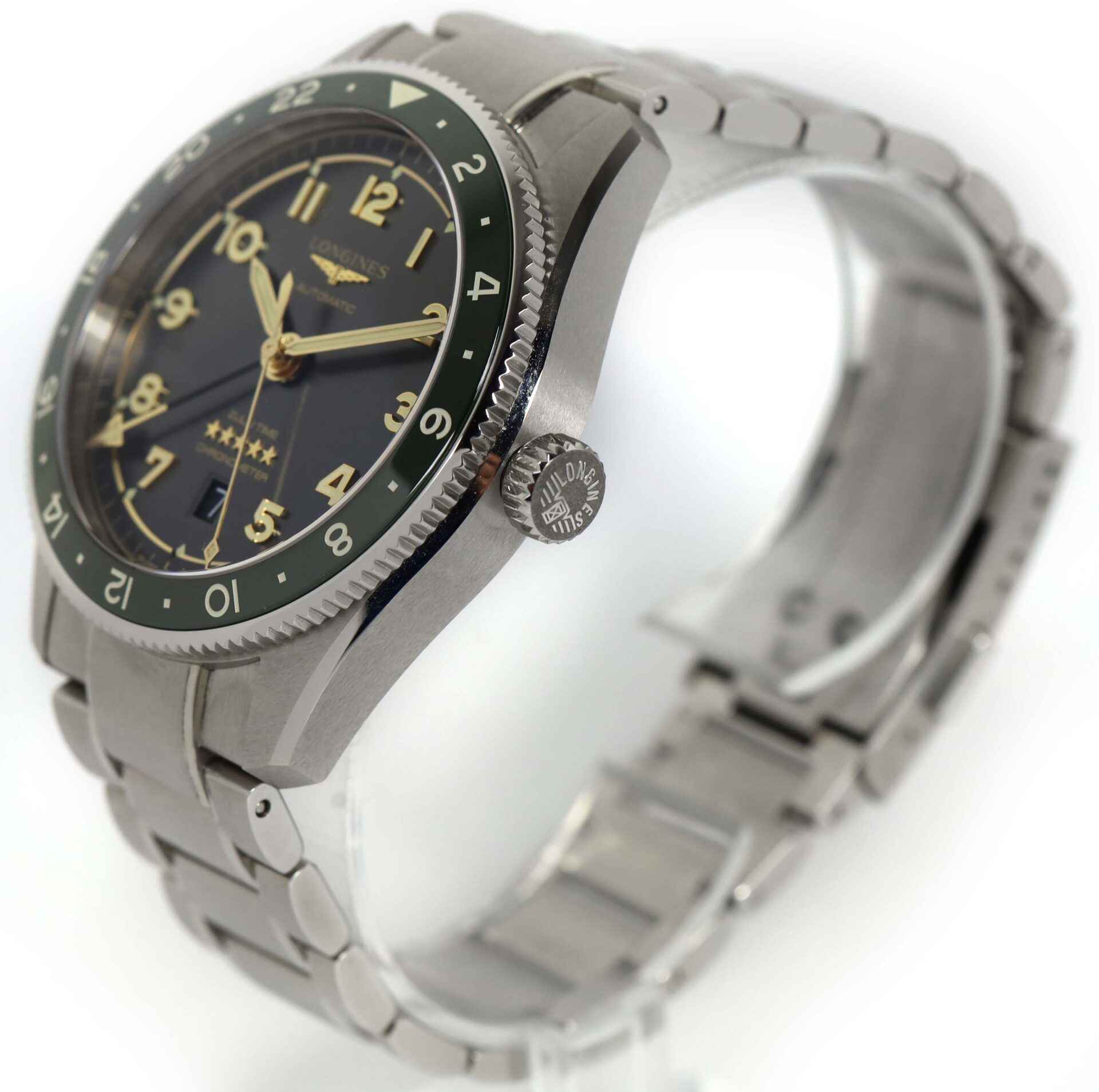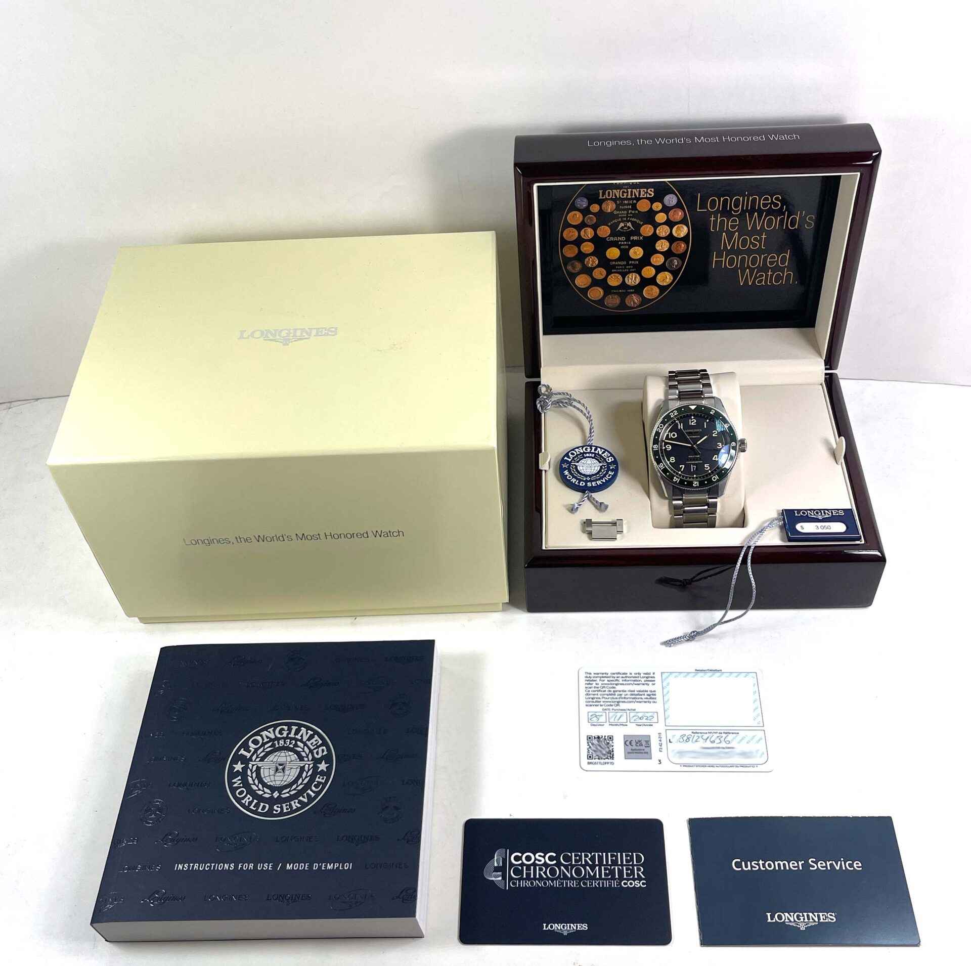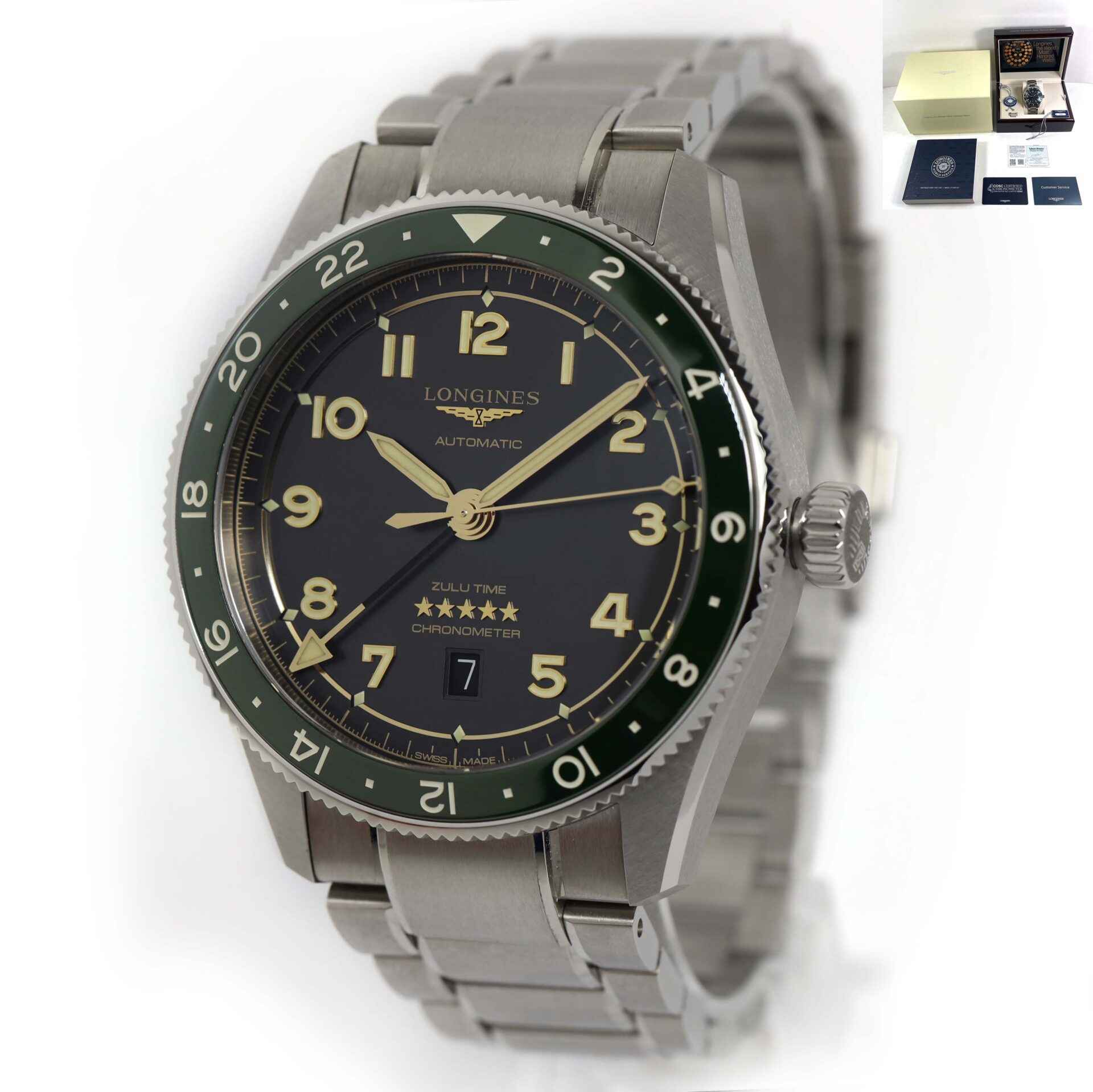 Read Morethis longines watch is in excellent condition and comes with its box, booklets, hang tags, spare link, and warranty card dated november 25th, 2022. This watch features a stainless steel case surrounding a black dial with a green bezel and comes on a steel bracelet as shown in the photos attached. This watch is in stock and available to ship immediately!