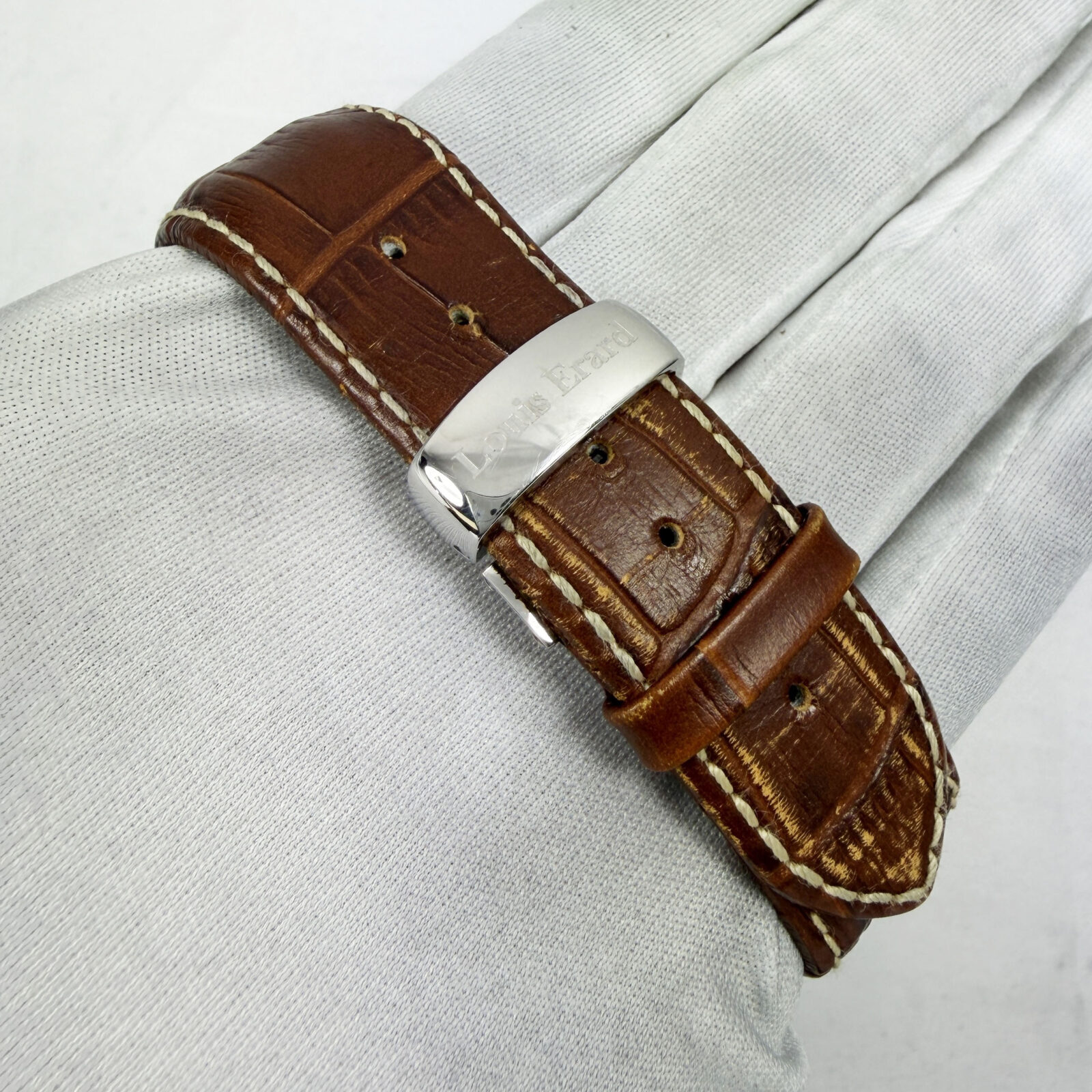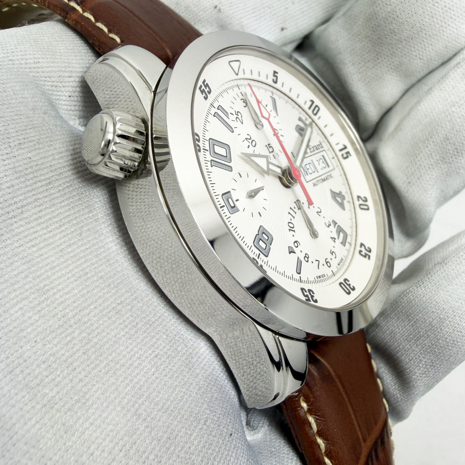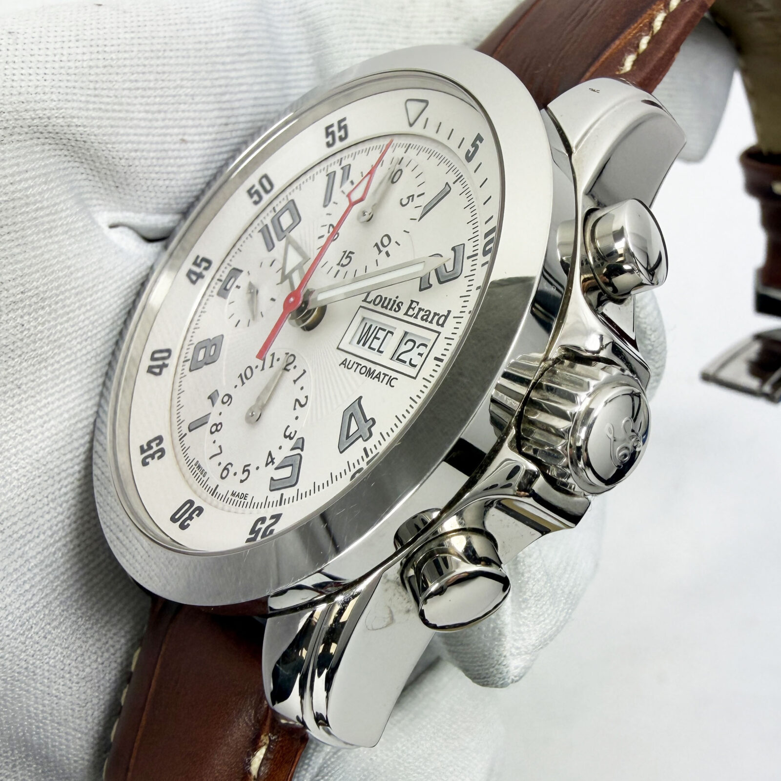 this louis erard watch comes with its box, booklets, and warranty card. The photos shown are of the exact watch being sold and accurately represent its condition. This watch is in stock and ready to ship immediately!