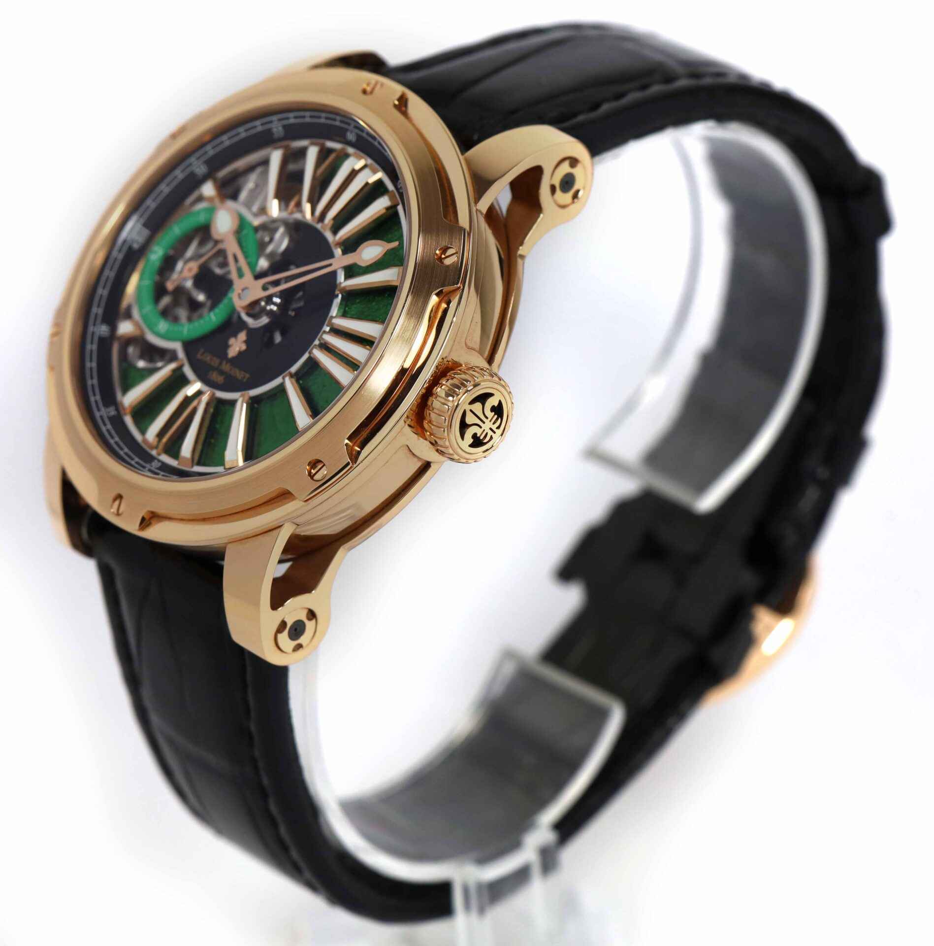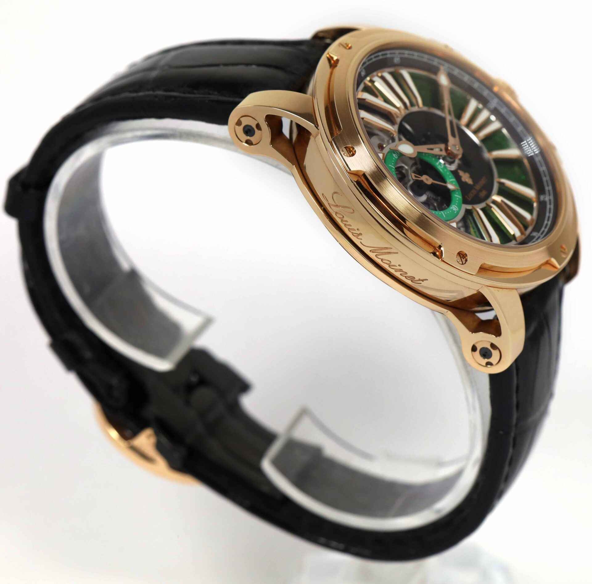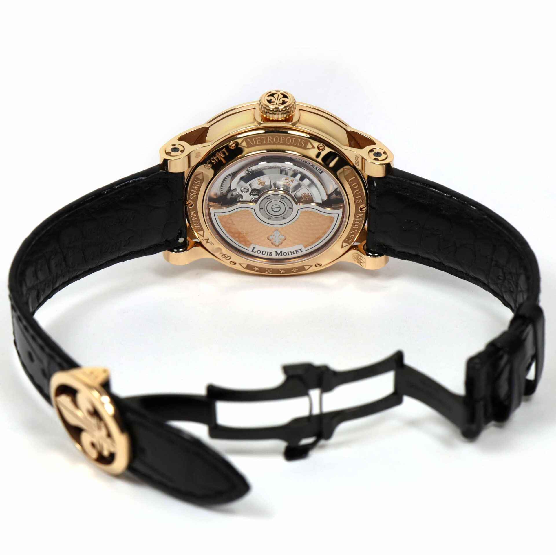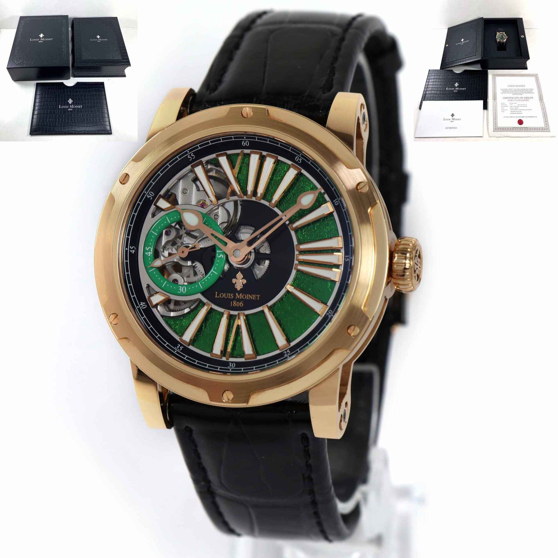 this louis moinet watch is truly a rare timepiece and was part of a limited edition of 60 pieces. This watch comes complete with the box, booklets, and warranty paper as shown in the pictures attached. this watch features an 18k rose gold case equipped with a black leather strap and a gold deployant buckle. The metropolis features three different sets of openwork on the hour markers, the dial, the lugs, and vertical bridges – giving the timepiece a uniquely three-dimensional aspect. This watch is in stock and available to ship immediately!