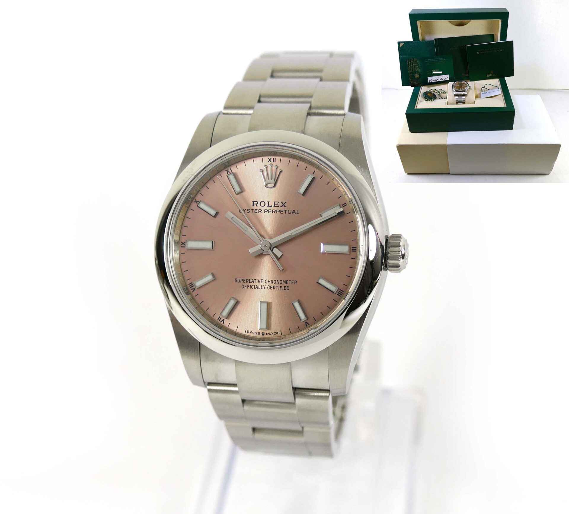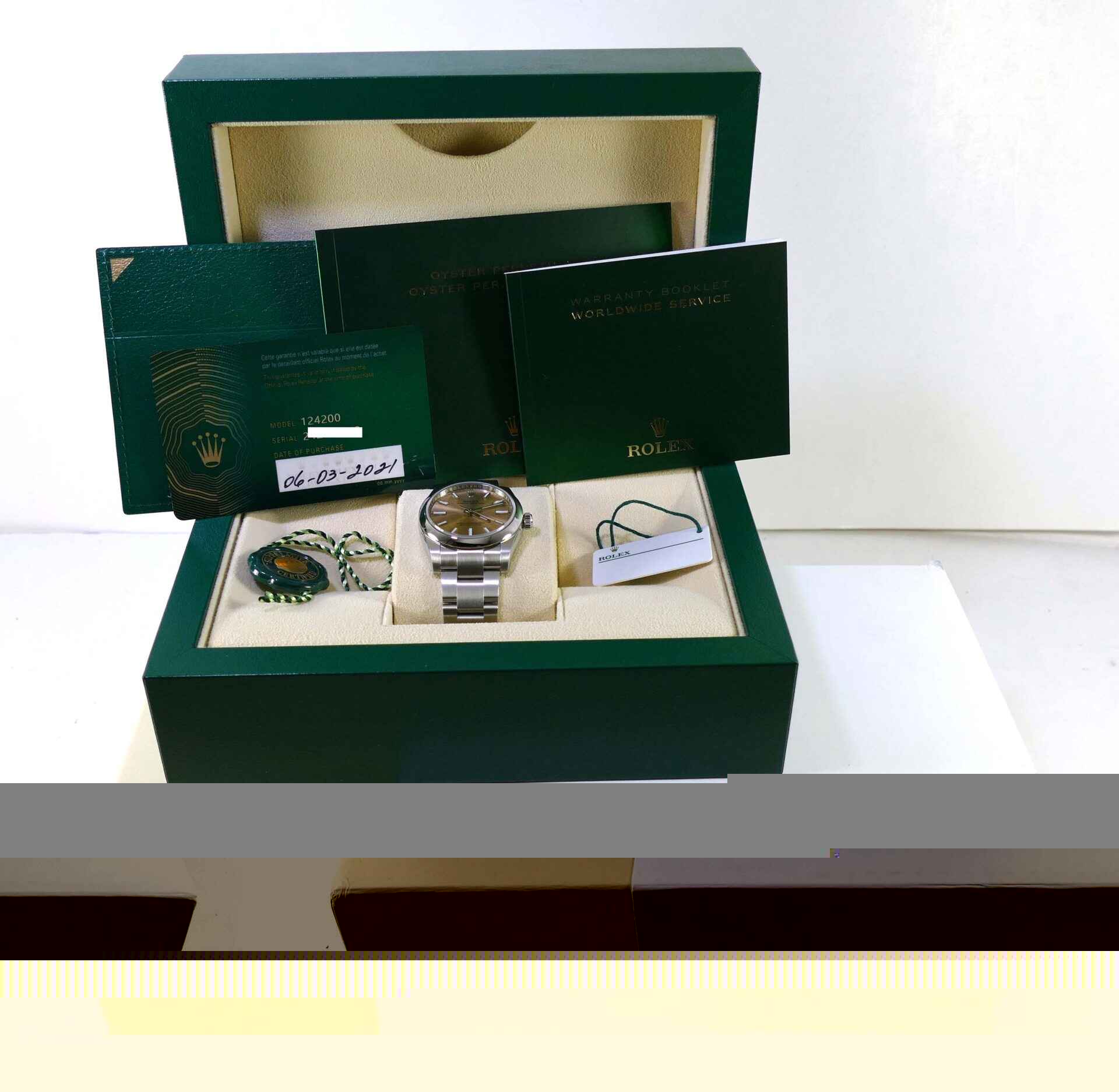 this watch is brand new never worn, and comes with its complete set of box, booklets, hang tags, and warranty card. The warranty card is dated march 6th, 2021, just a few days before this listing was made.