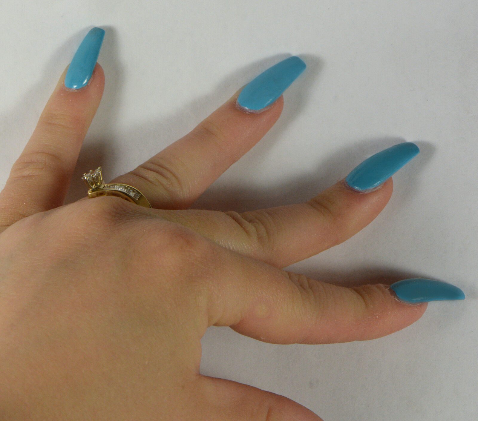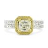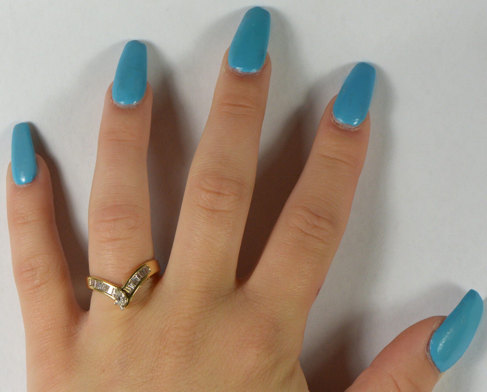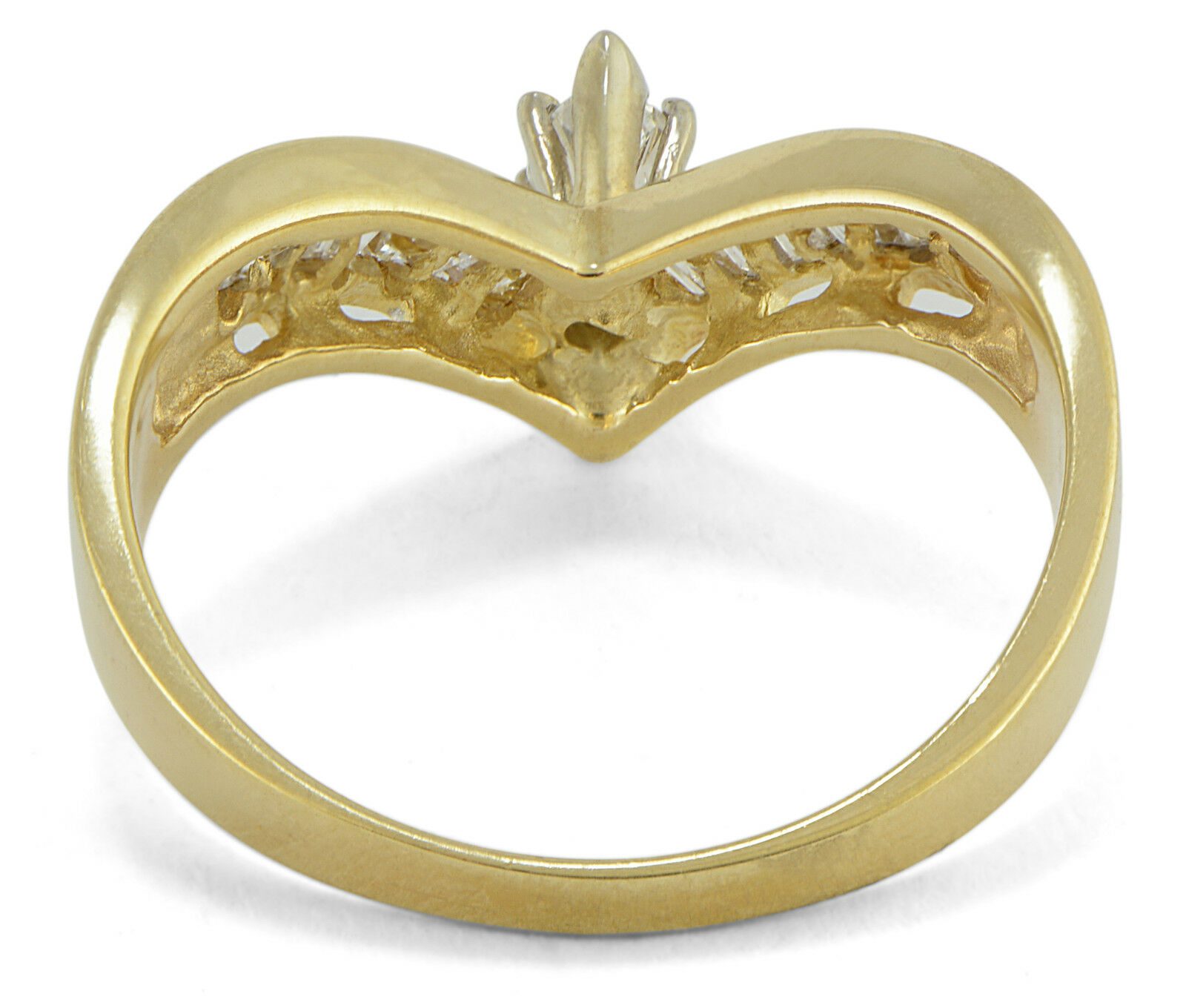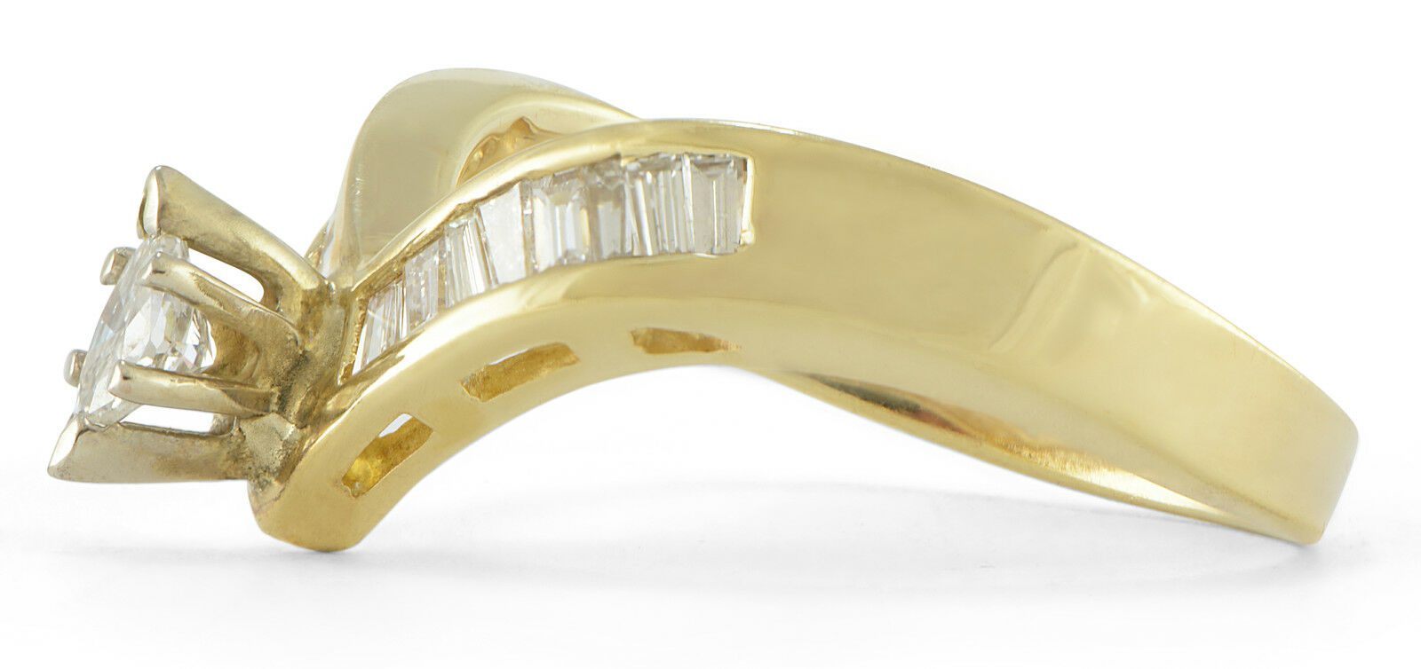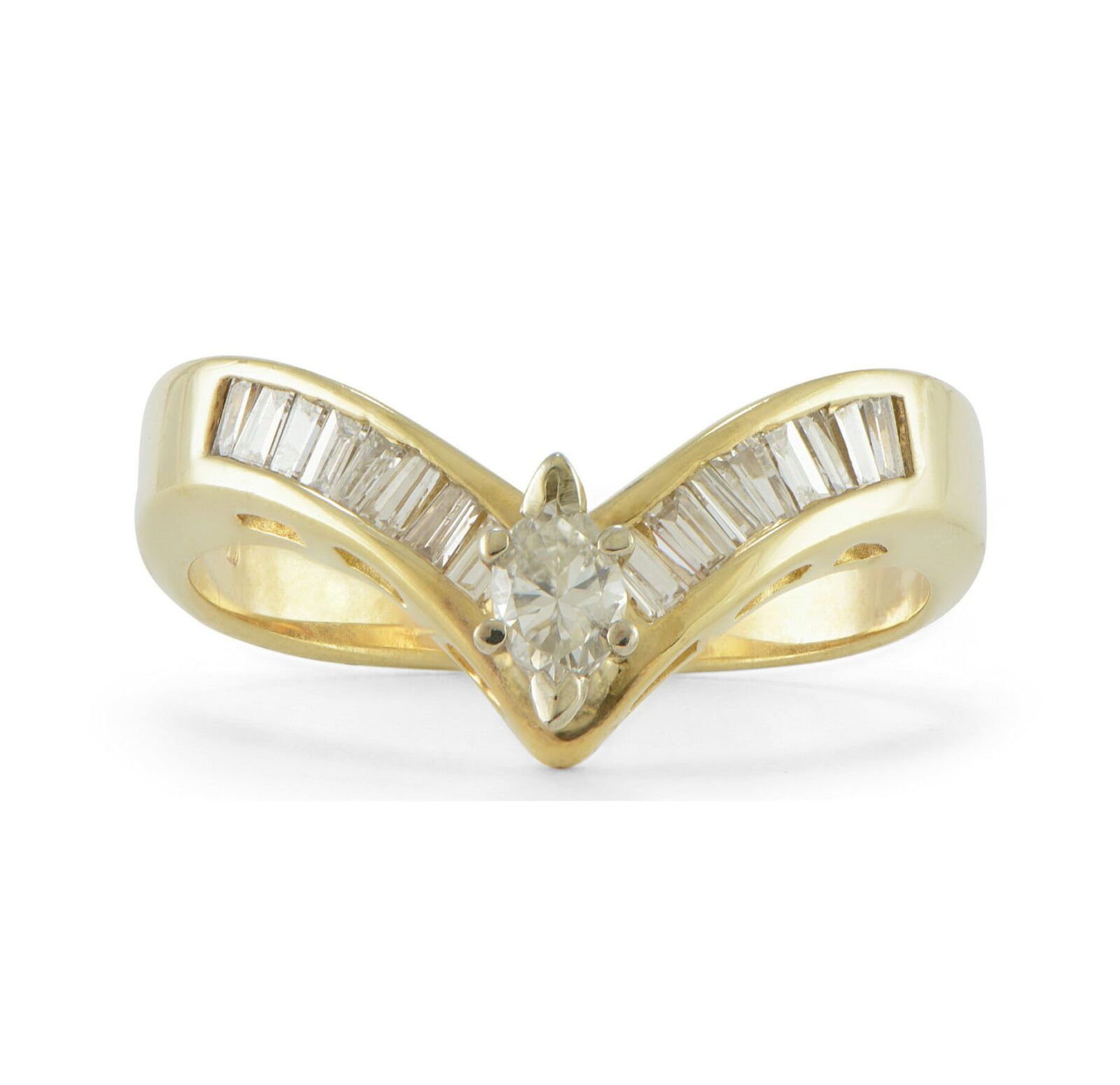 this beautiful 14k yellow gold diamond engagement ring features a marquise diamond in the center setting and has a ‘v’ shape to the front of the ring band. Notice the channel set baguette diamonds along the sides. The diamonds are .75ct tw and si2 clarity.