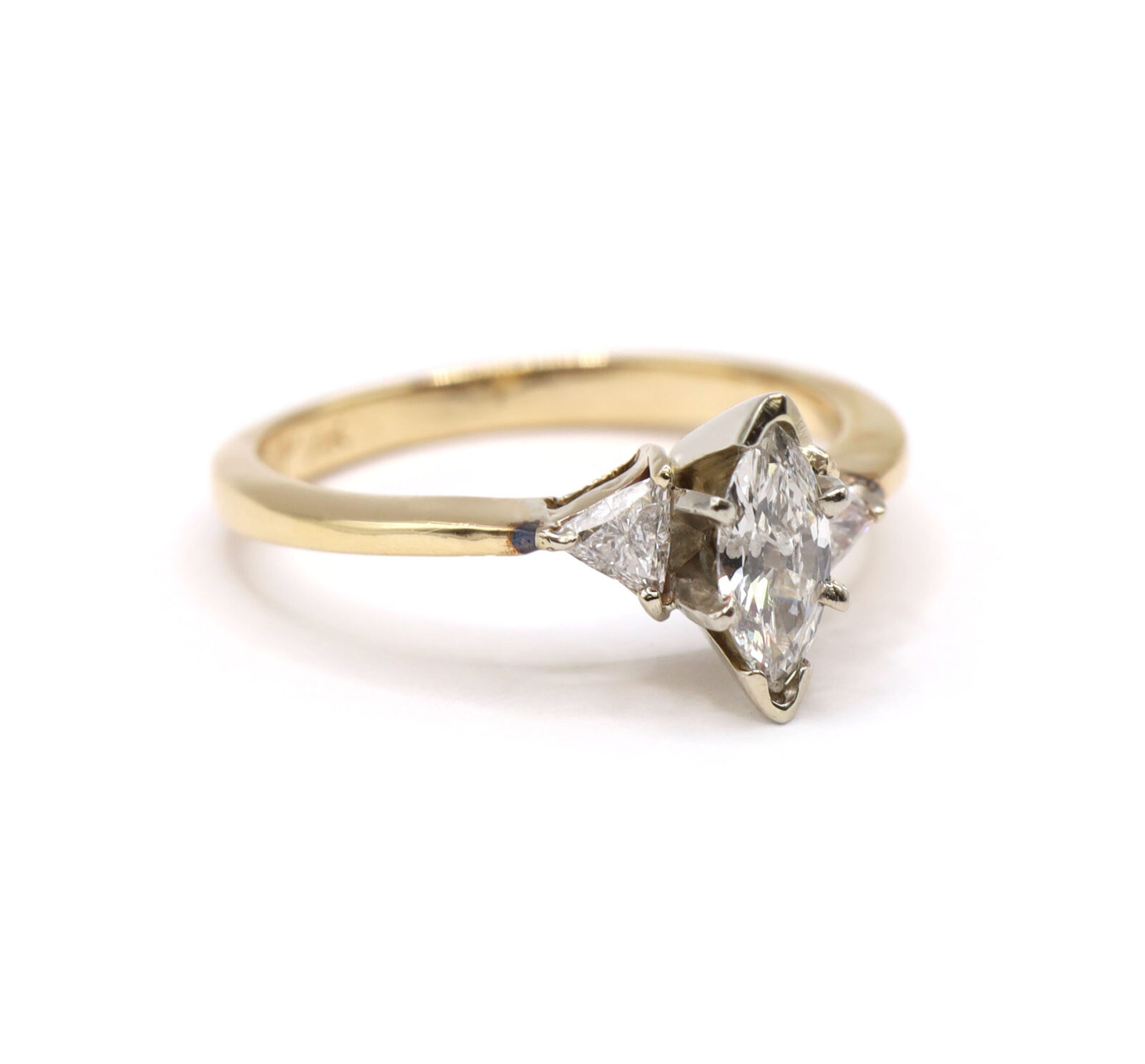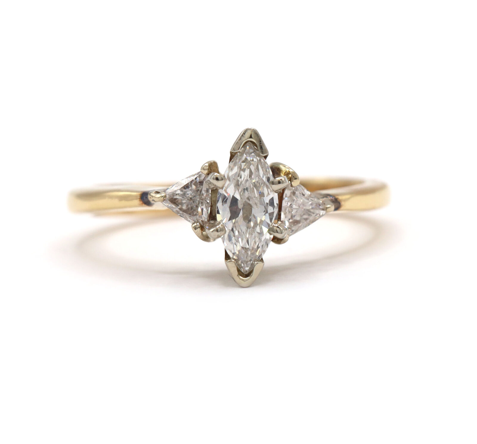 Marquise Trillion Diamond Three Stone 14K Yellow Gold Statement Engagement Ring