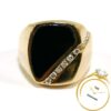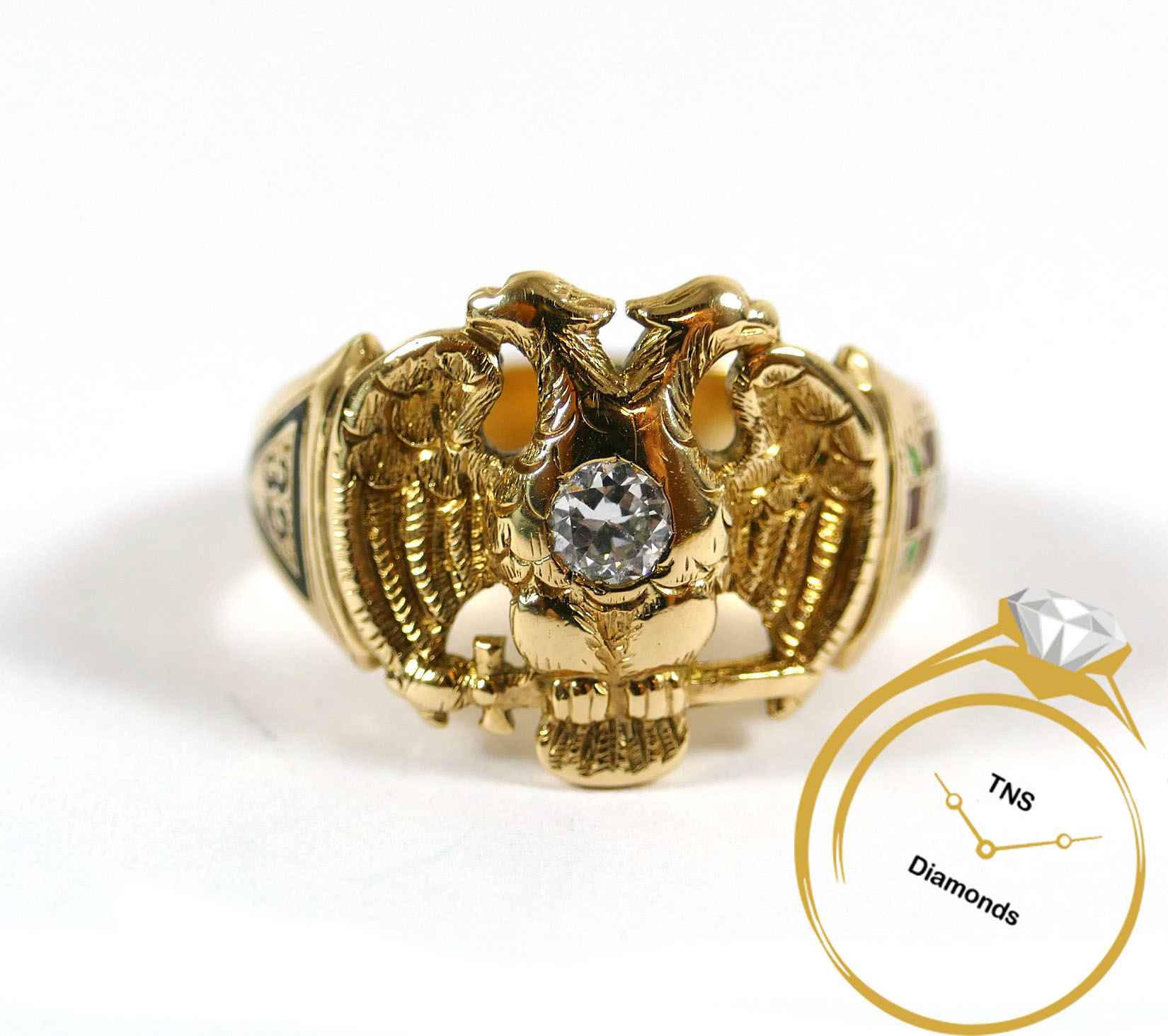 this bold men’s ring is crafted in 14k yellow gold, and features a double-headed masonic eagle that is engraved with lifelike detail. It holds a diamond in the center of the symbol, and accents the whole piece perfectly.
