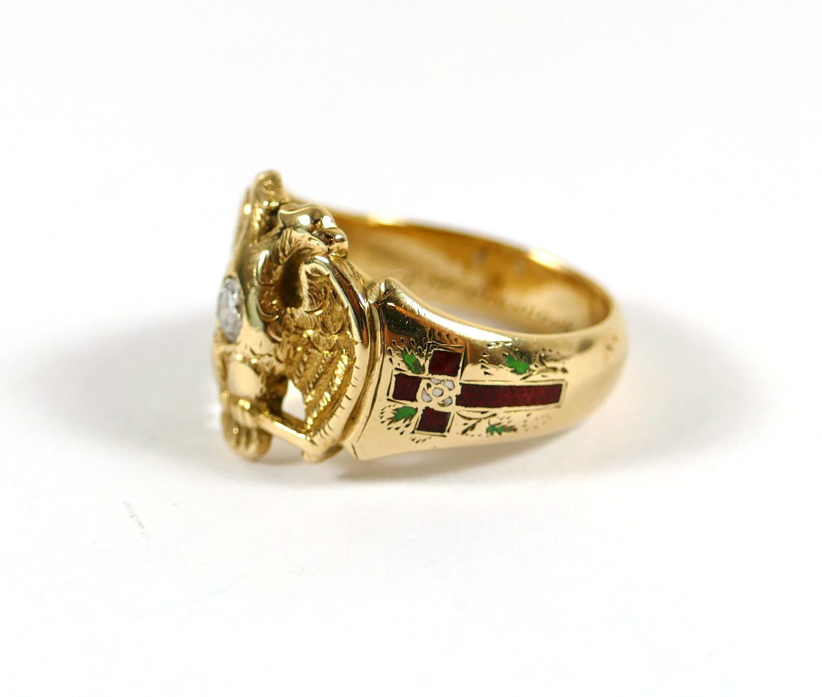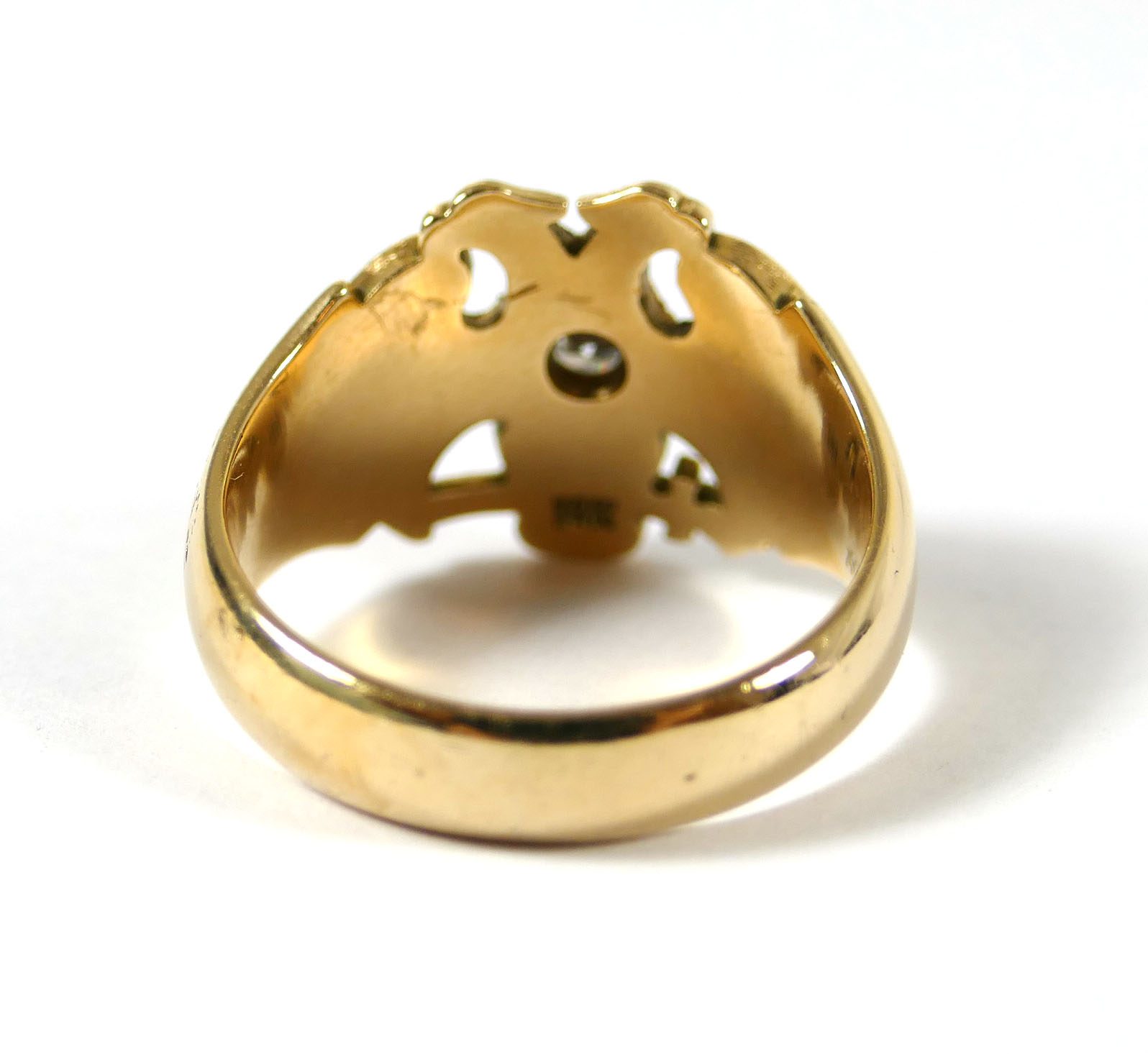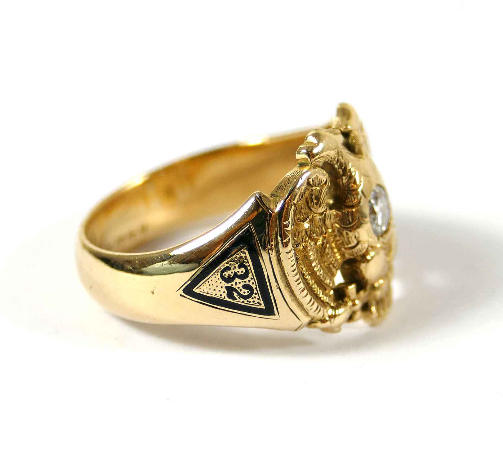 Product Description: This bold men's ring is crafted in 14k yellow gold, and features a double-headed Masonic eagle that is engraved with lifelike detail. It holds a diamond in the center of the symbol, and acce...