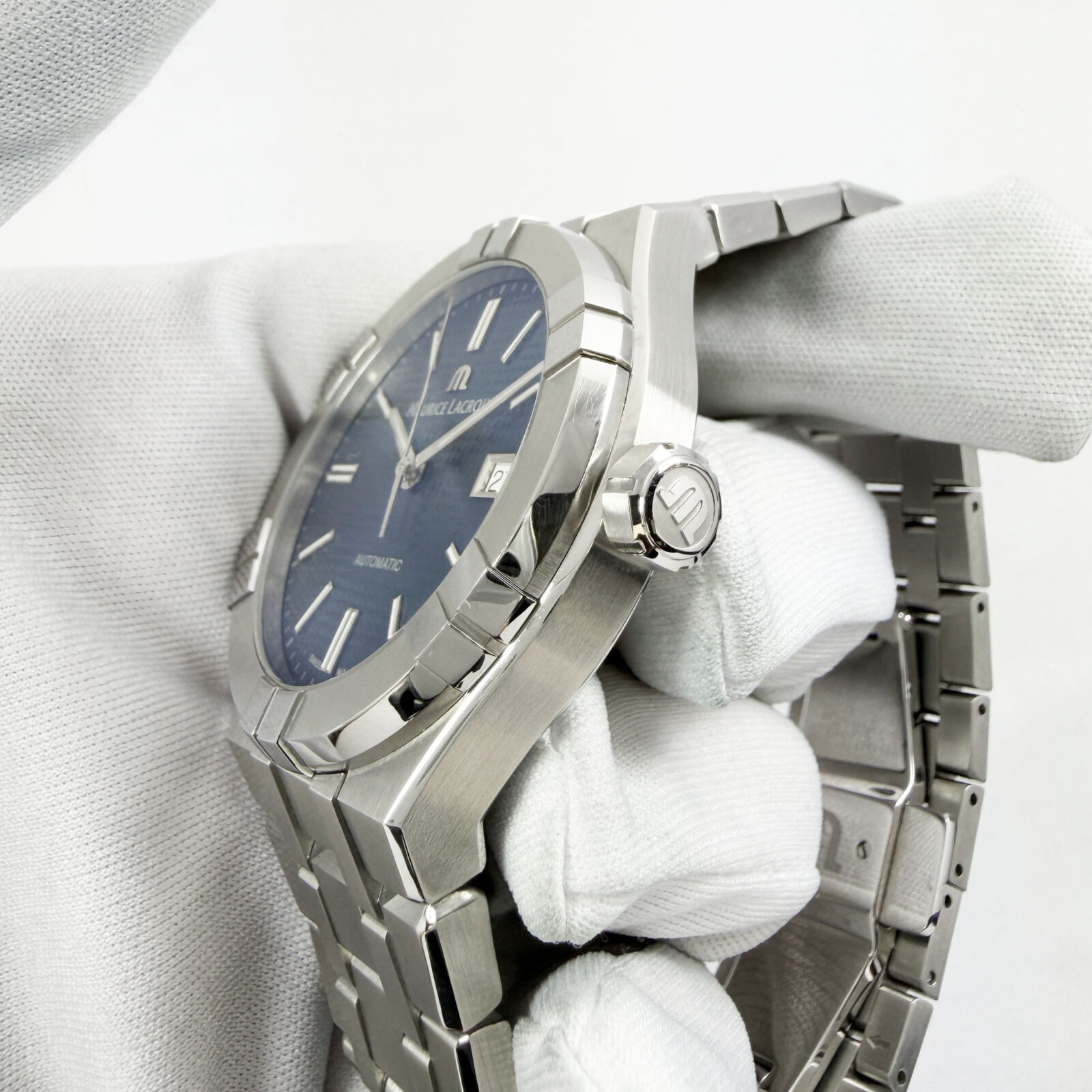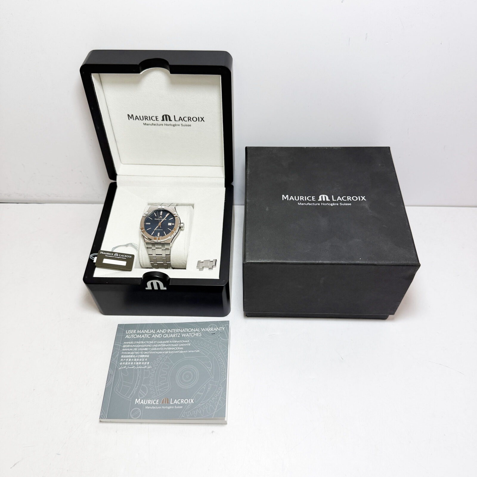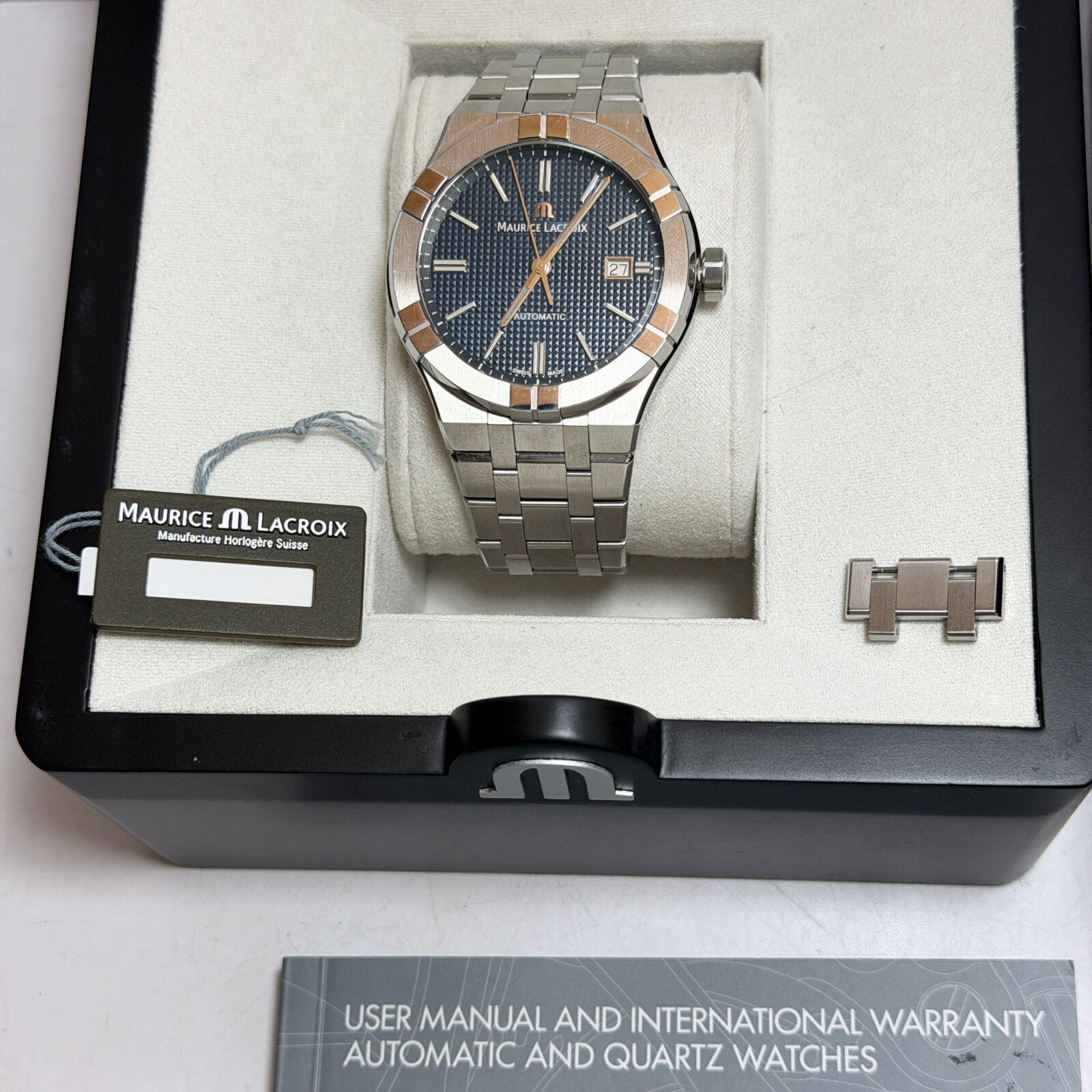 this maurice lacroix watch comes with its box, booklet, hangtag, and extra link. The photos shown are of the exact watch being sold and accurately represent its condition. This watch is in stock and ready to ship immediately!