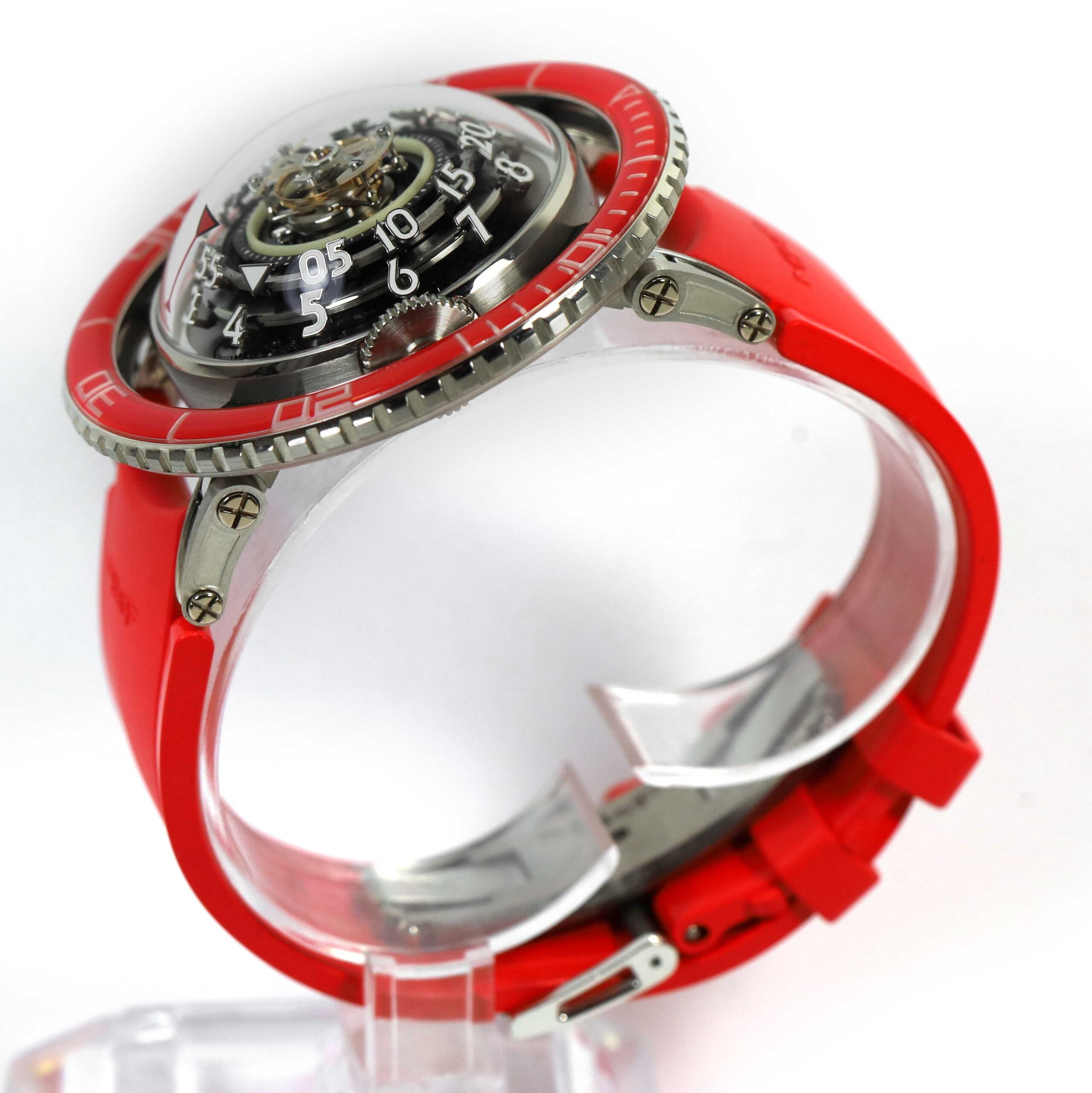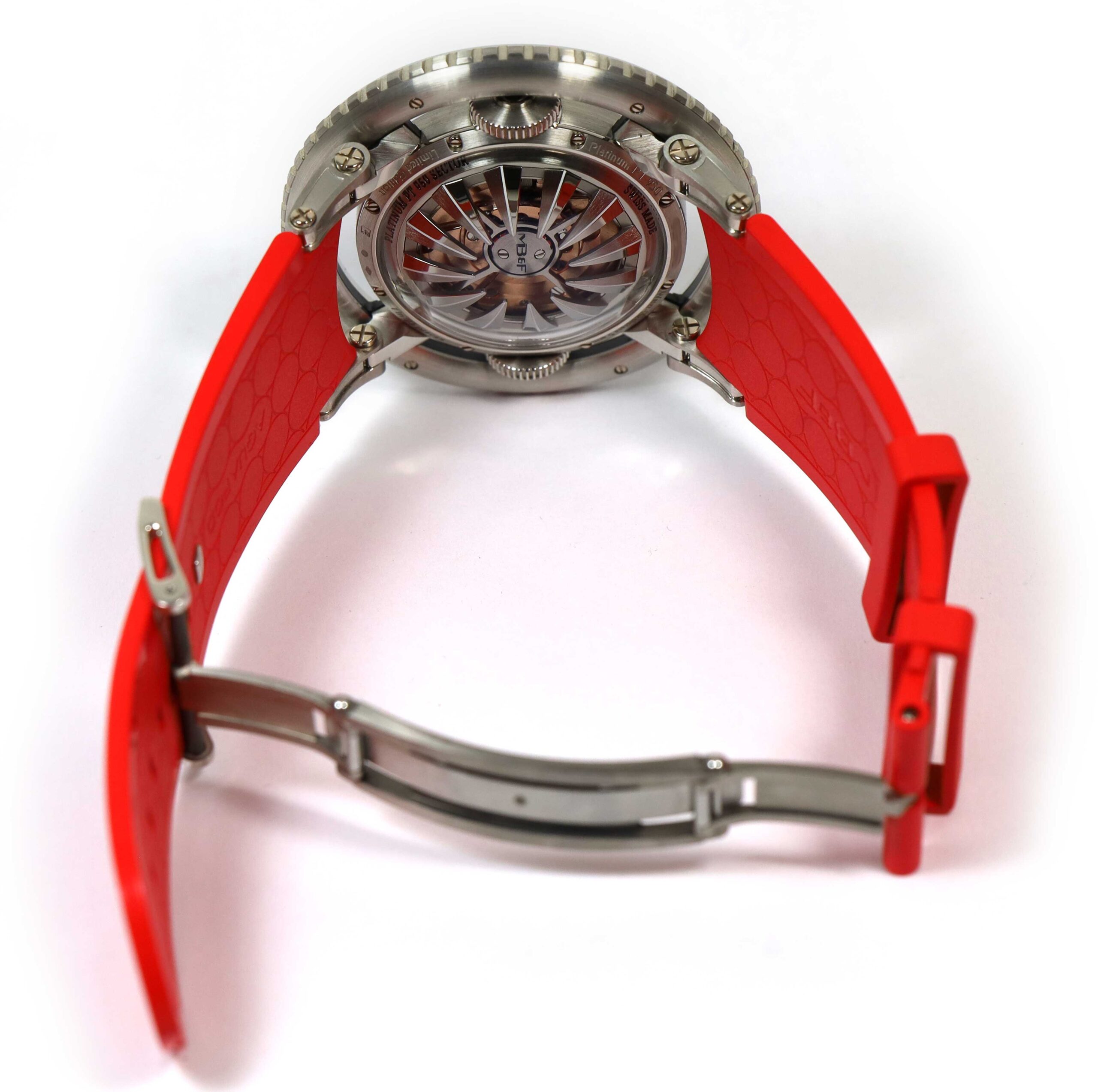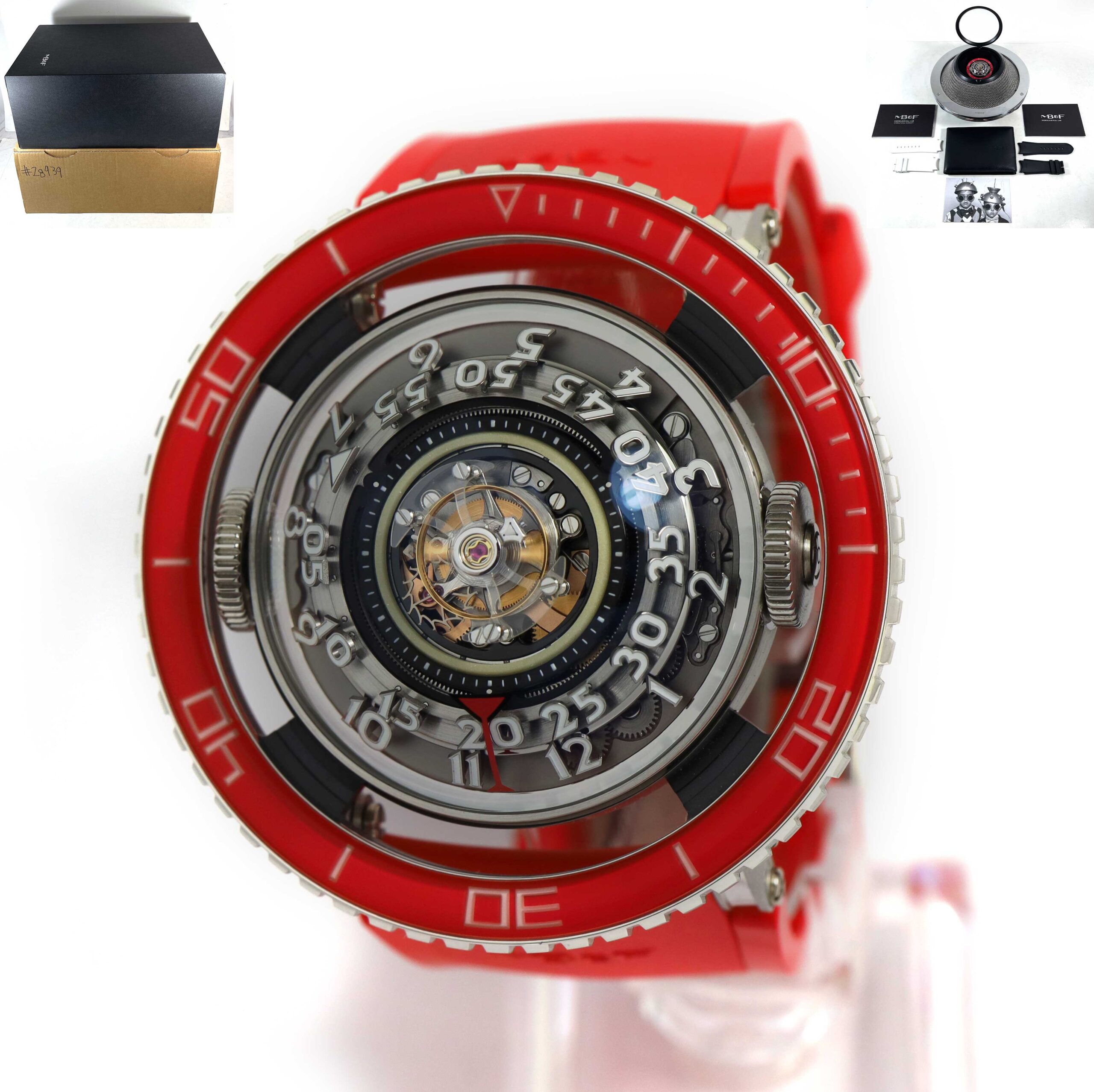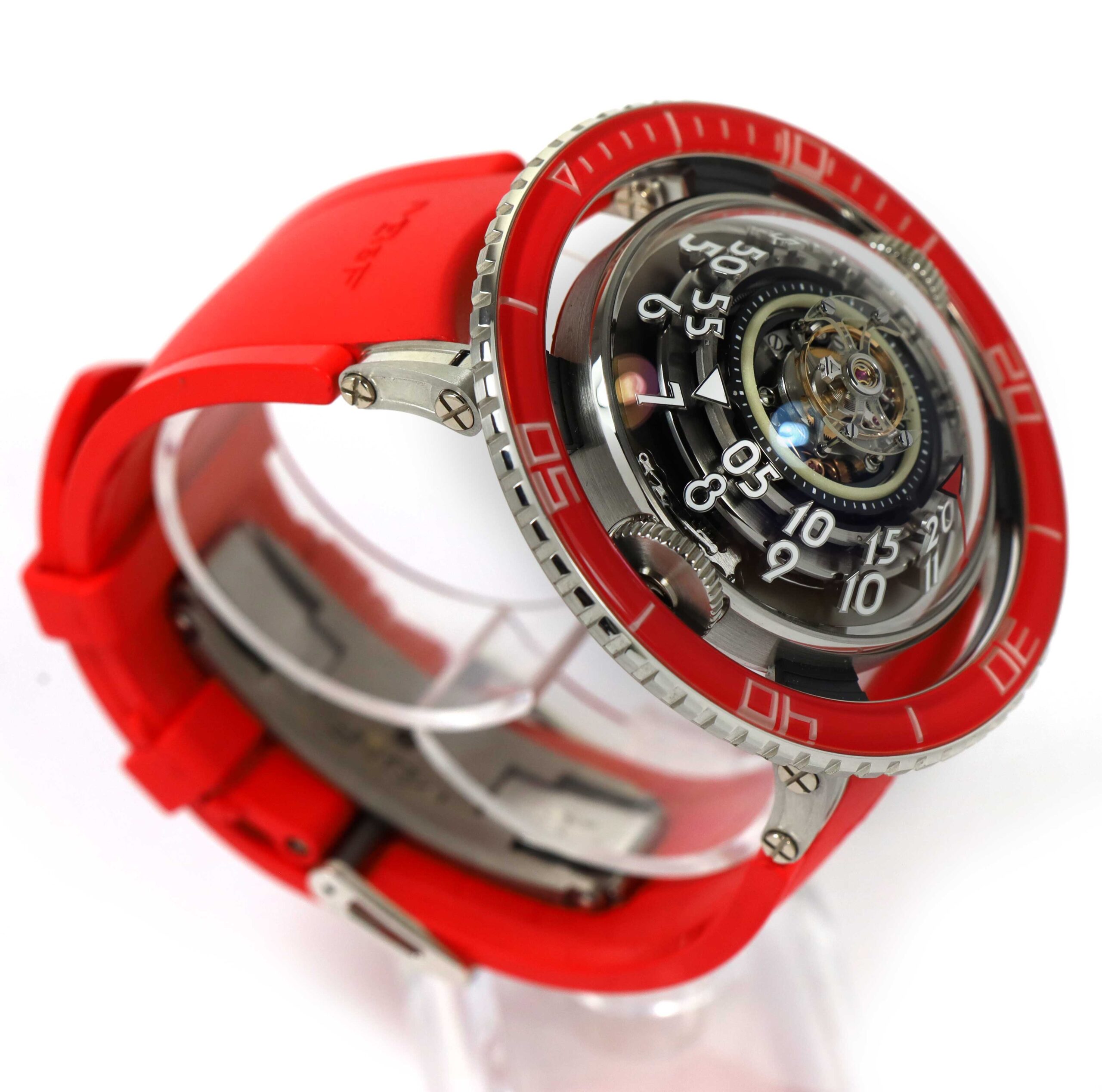 this mb&f hm7 is in super mint condition, appearing to have been worn at the most 5 times. It comes with its box, booklets, two additional rubber straps, and warranty booklet dated may 31st, 2022 as shown in the pictures attached. This platinum version was limited to 25 pieces. The aquapod was released in 2017 (in a titanium with blue bezel version limited to 33 pieces and a rose gold with black bezel version limited to 66 pieces). The following year they made some updated and released it in a titanium version with green bezel, limited to 50 pieces. Then finally in 2019 they released the “final version” in platinum with red bezel. This version has a sapphire tourbillon bridge to show the movement more clearly, as well as a more skeletonized dial and better lume. The $175k msrp of this version is nearly double the prior versions due to the costs to manufacture the updates made in this final version. Here is a rare chance to own this watch at a super discount off of the retail.
