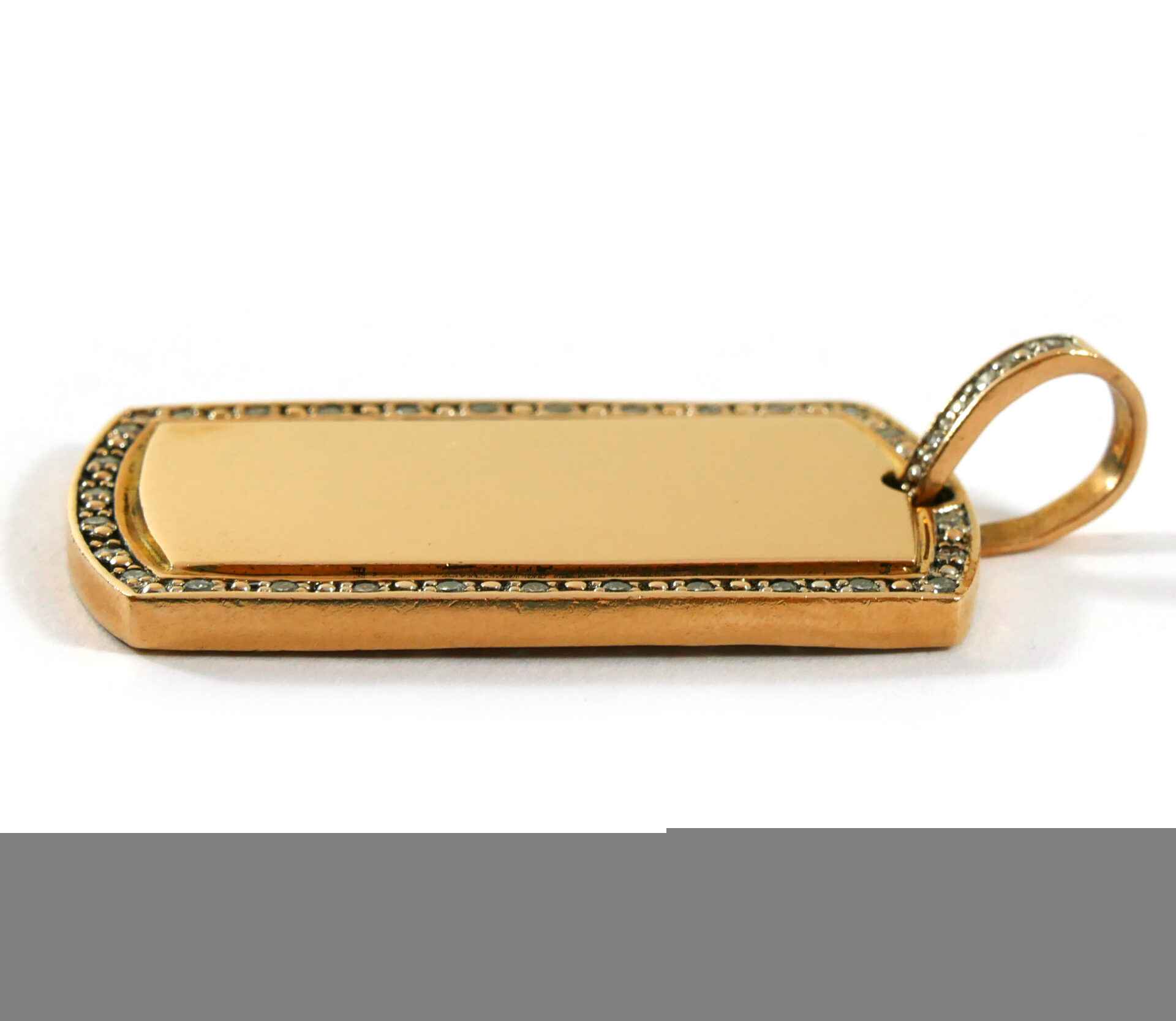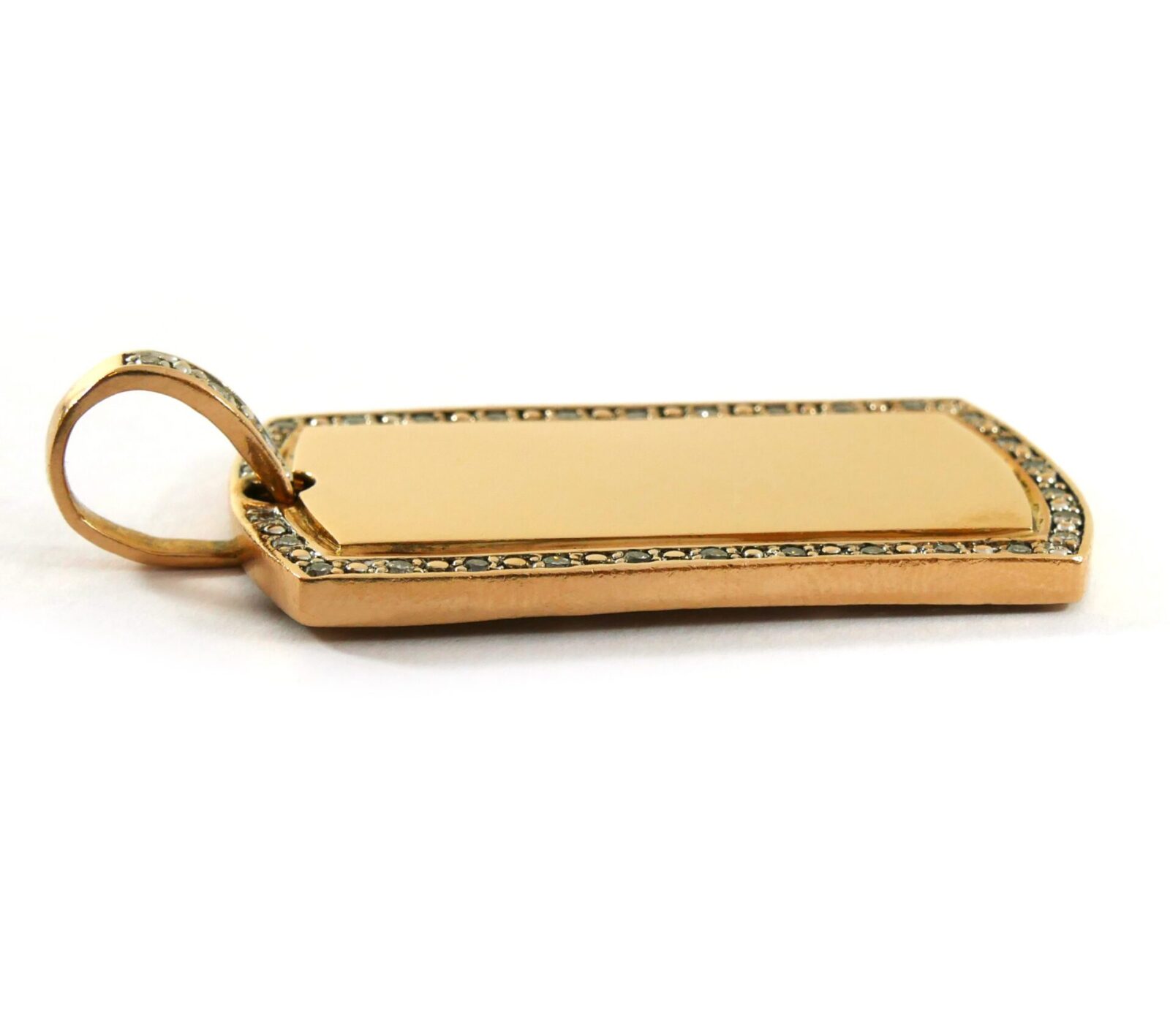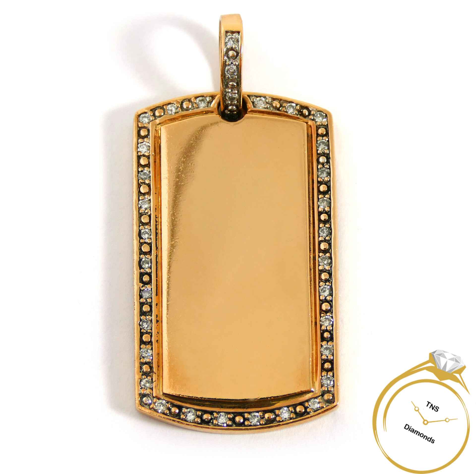 this hefty 18k rose gold and diamond name plate dog tag is encrusted with 1.2 carats of diamonds surrounding the frame of the piece. This is a fancy yet sleek men’s wearable jewelry piece, and can be personalized with any engraving or addition to the center of the pendant.