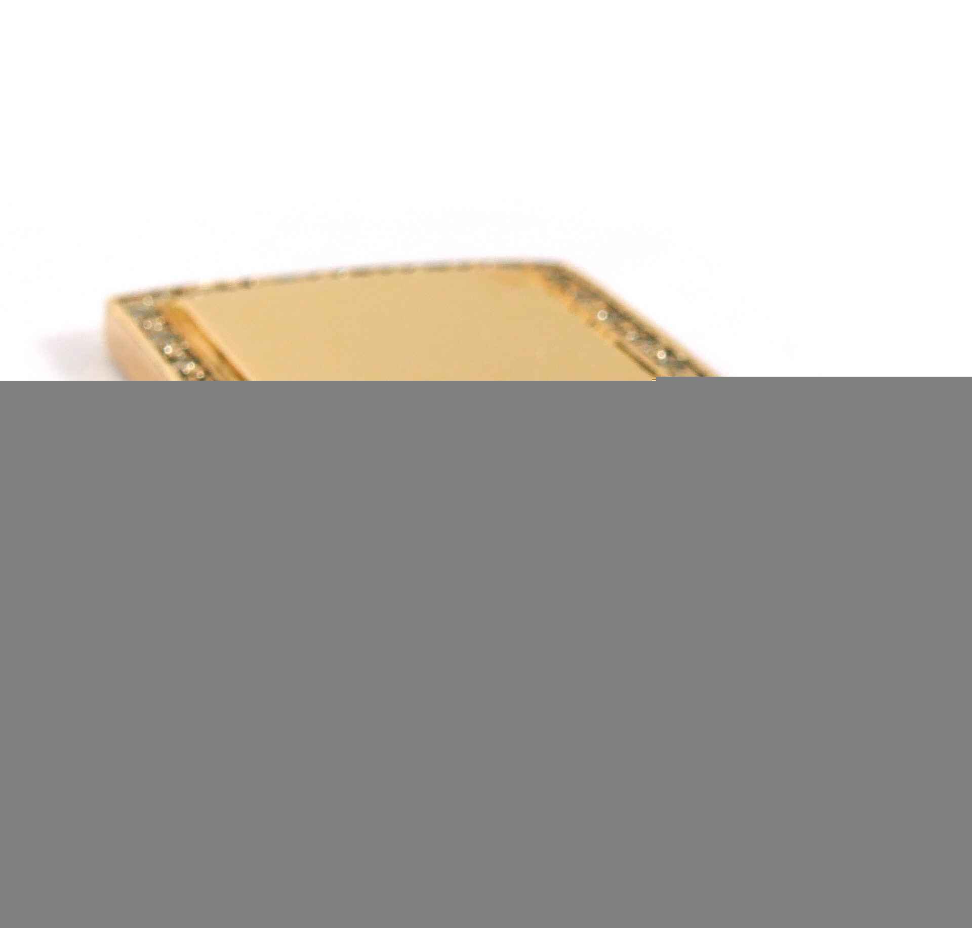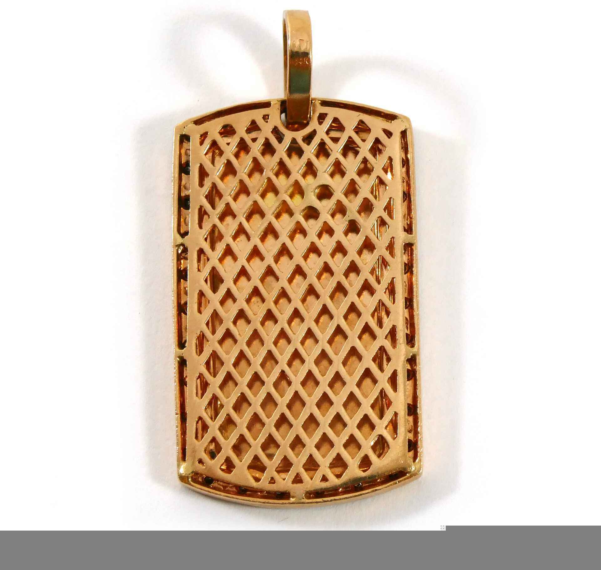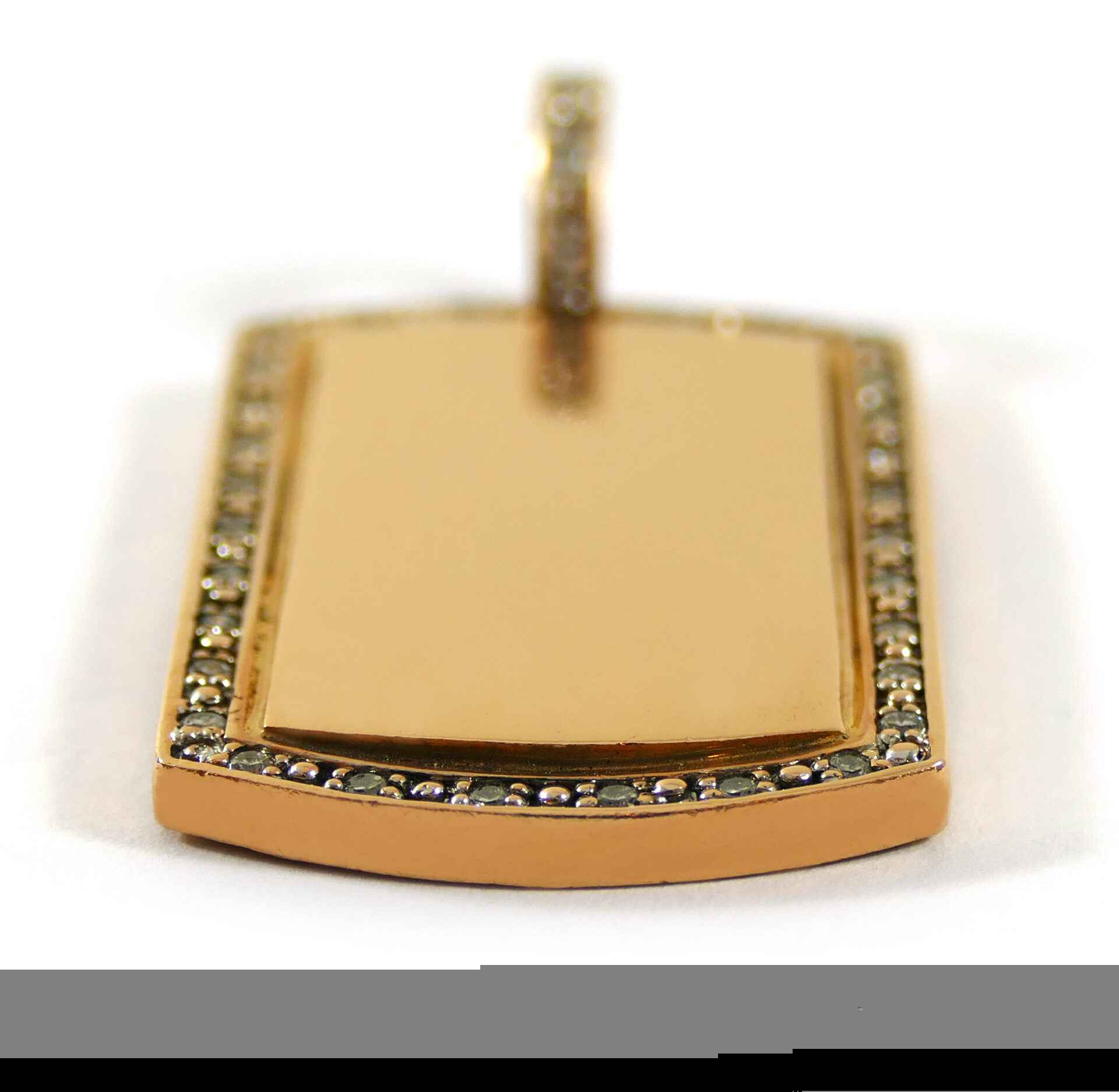 this hefty 18k rose gold and diamond name plate dog tag is encrusted with 1.2 carats of diamonds surrounding the frame of the piece. This is a fancy yet sleek men’s wearable jewelry piece, and can be personalized with any engraving or addition to the center of the pendant.