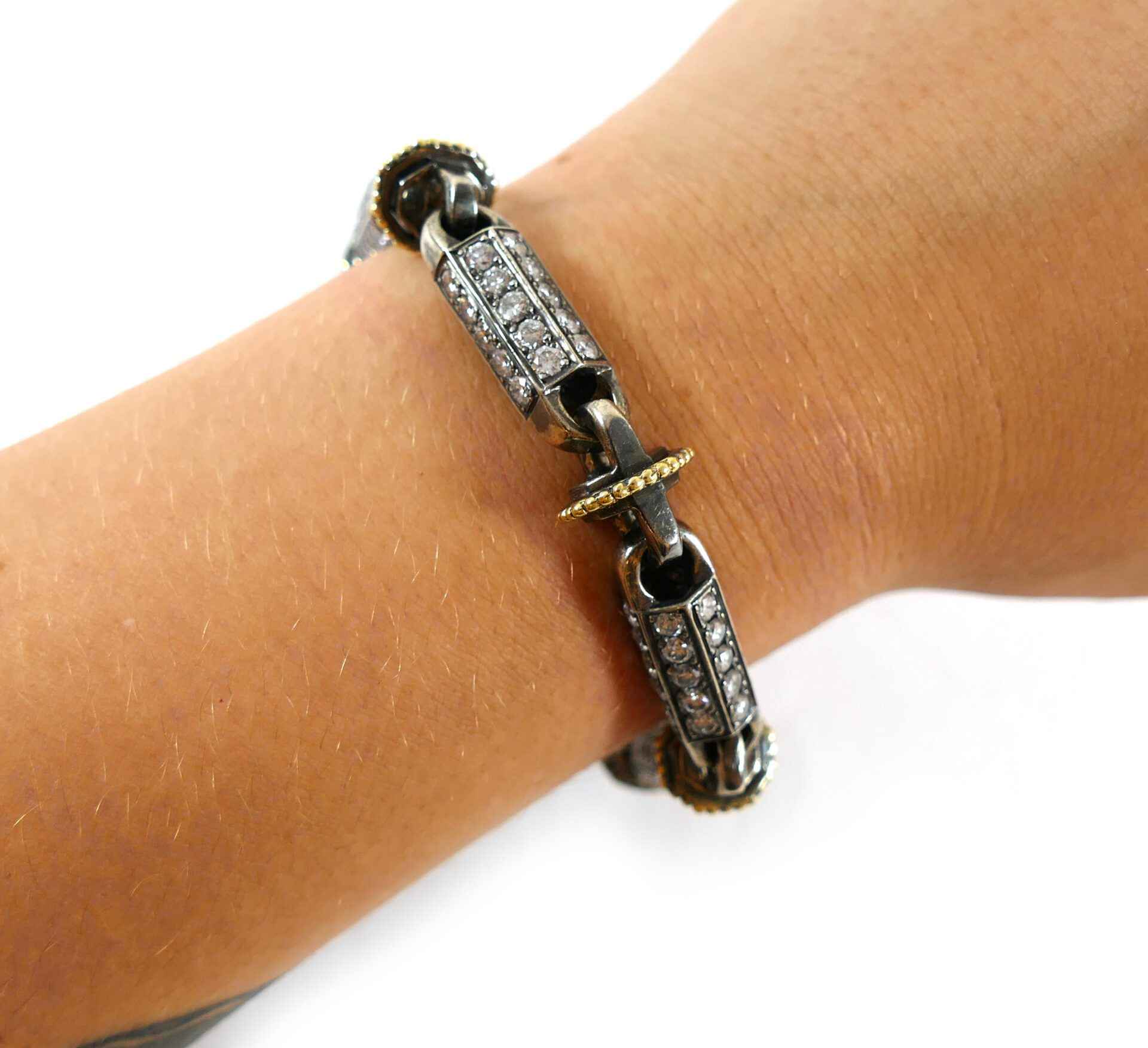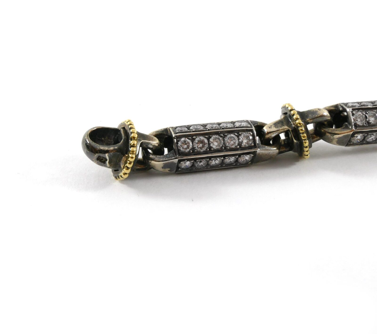 This is a custom made men's link bracelet, crafted in 14k white gold and plated with black rhodium. There are 12 carats of diamonds encrusted in this bracelet, with VS2 clarity and G color quality. ...