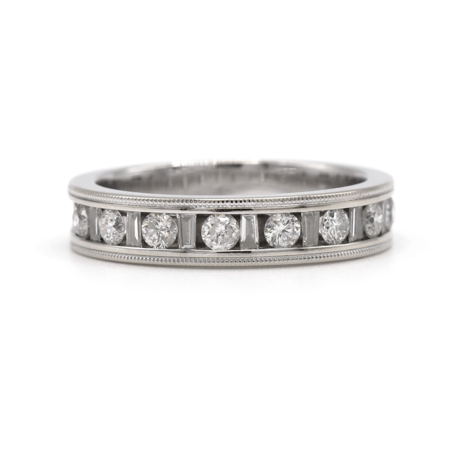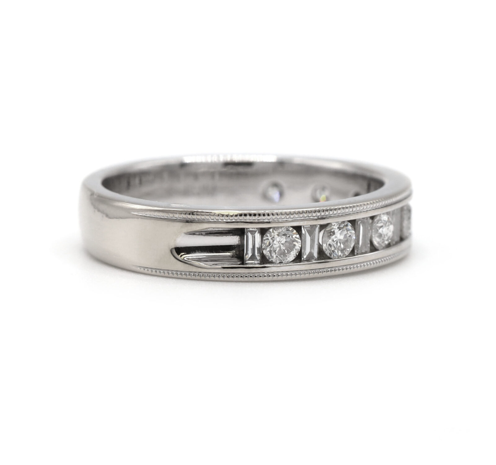 Material: 14k White Gold Size: 10.5 Stone: Diamond Total Diamond Weight: Approximately 1.00 Carat Clarity: SI1 Color: G/H Cut: Round Brilliant and Baguette Width: 5.1mm Weight: 7.7 Grams