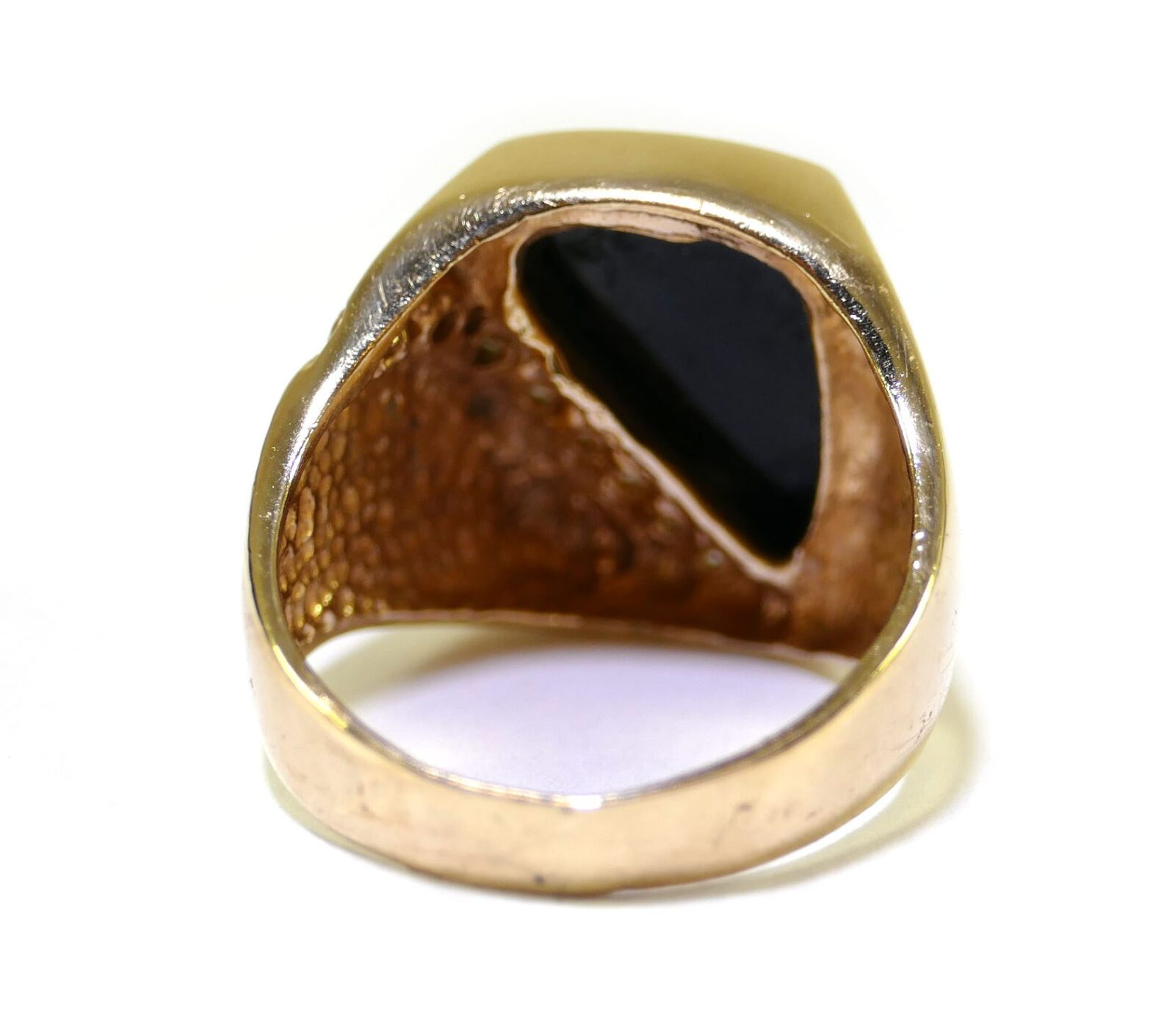 clean lines and a cool design, this ring is retro and slick. The shape of the onyx is followed by a strip of diamonds that extends to the side of the ring as well.