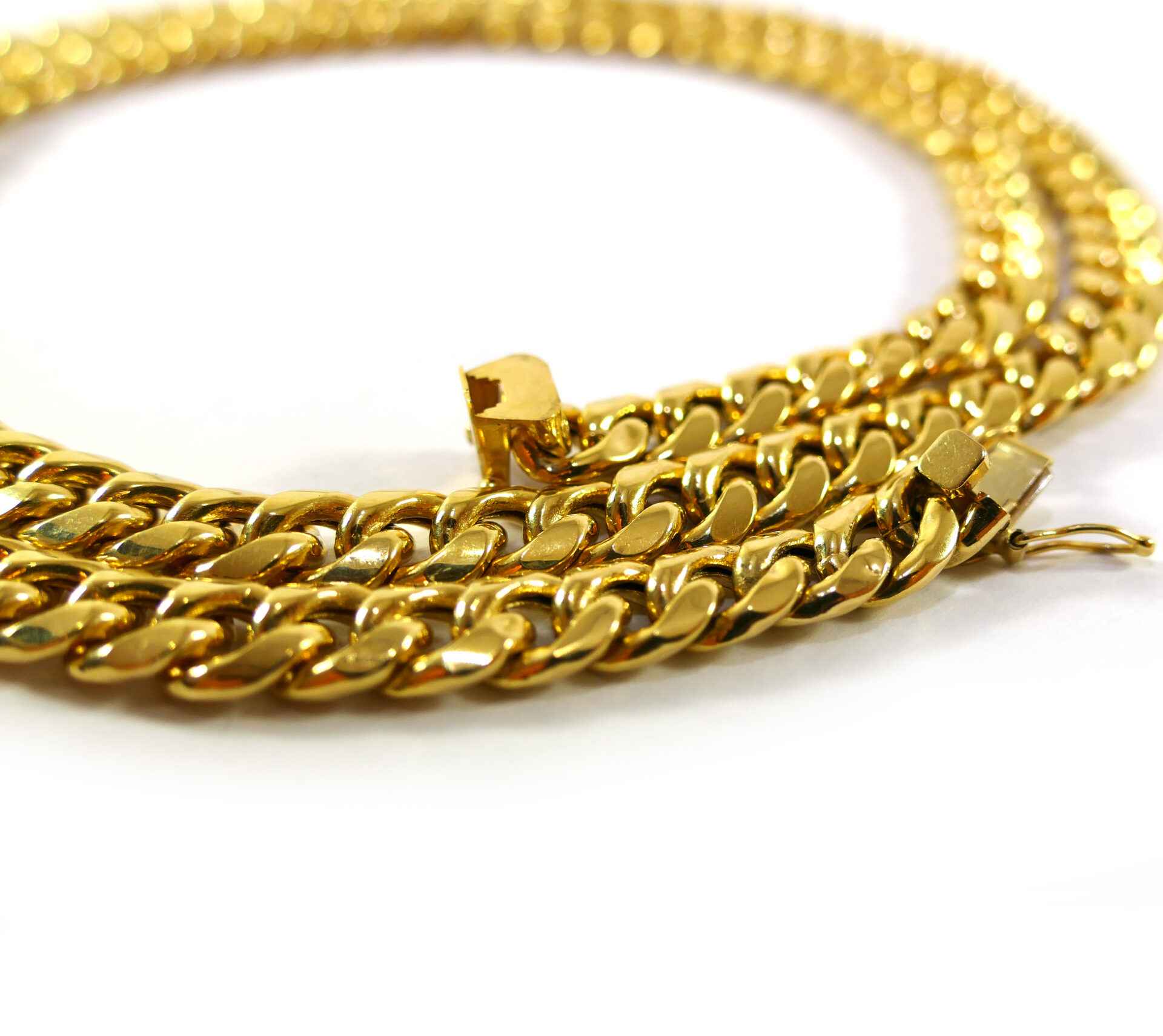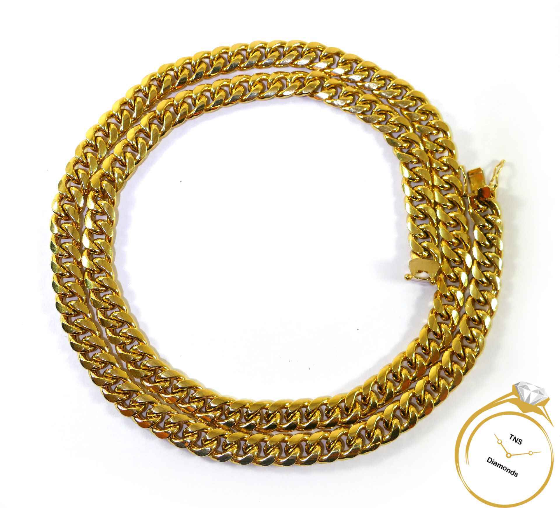Product Description: This bold and hollow cuban link chain necklace is made of complete 10k yellow gold. It has two safety features on the clasp to ensure it sitting safely and securely. It's 30.5 inches long an...