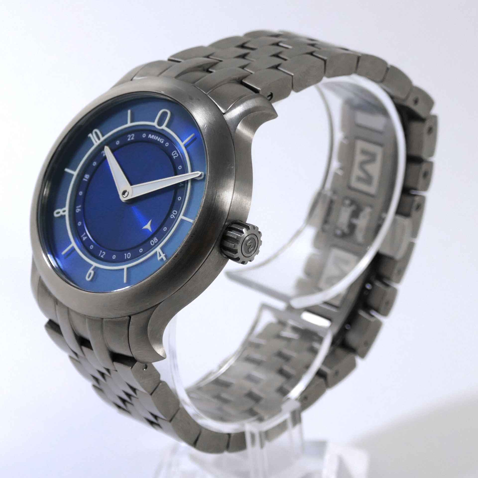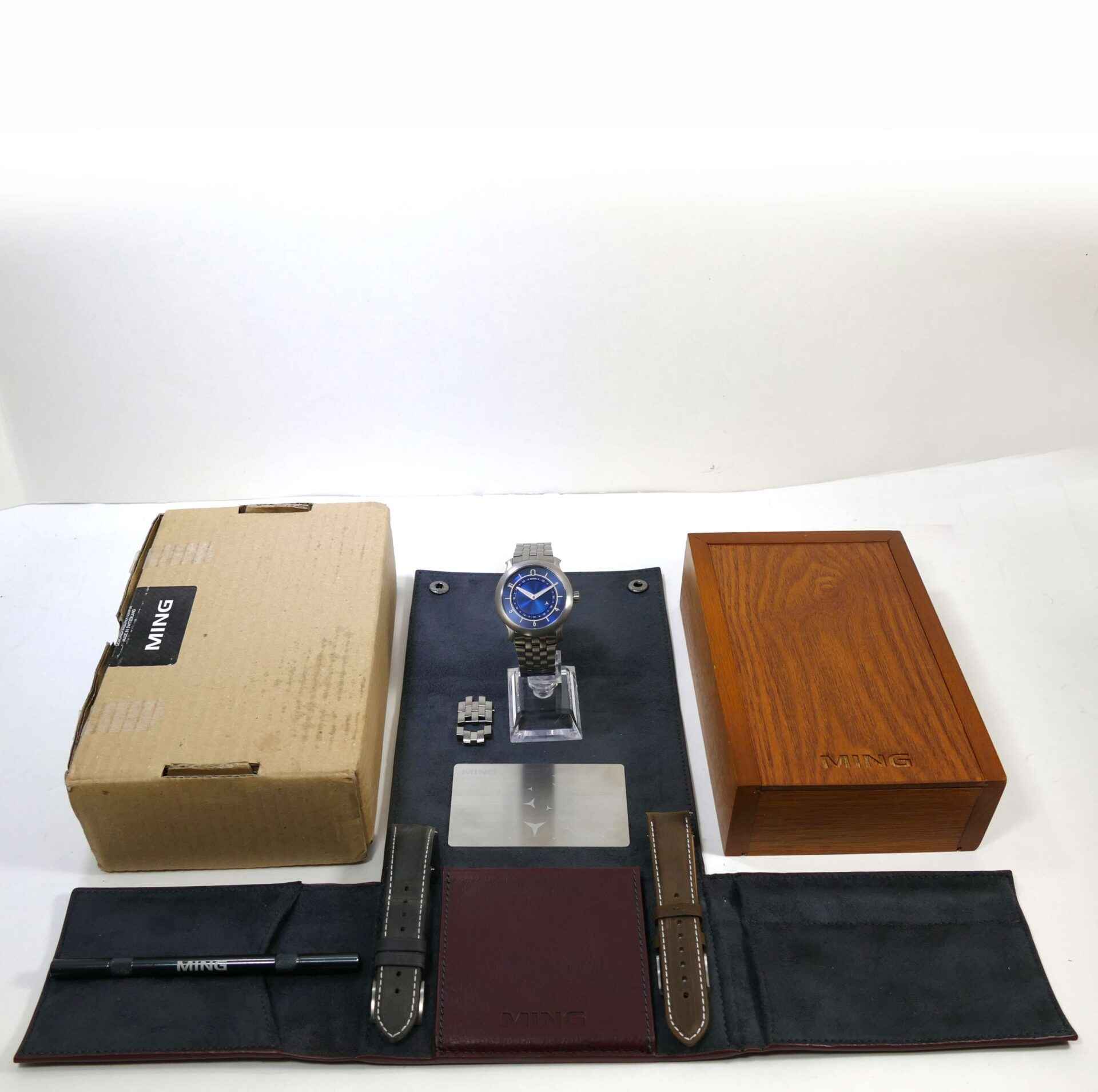 Read Morethis ming watch is in excellent condition but shows signs of wear from regular use. This watch comes complete with the box, papers, 2 extra straps, extra links, strap change tool, and warranty card dated september 1st, 2018. This watch features a unique three-part sapphire textured blue dial, sapphire rings and hands, flared lugs, and a grade 2 titanium-nitrogen filled case. this watch is in stock and ready to ship immediately!
