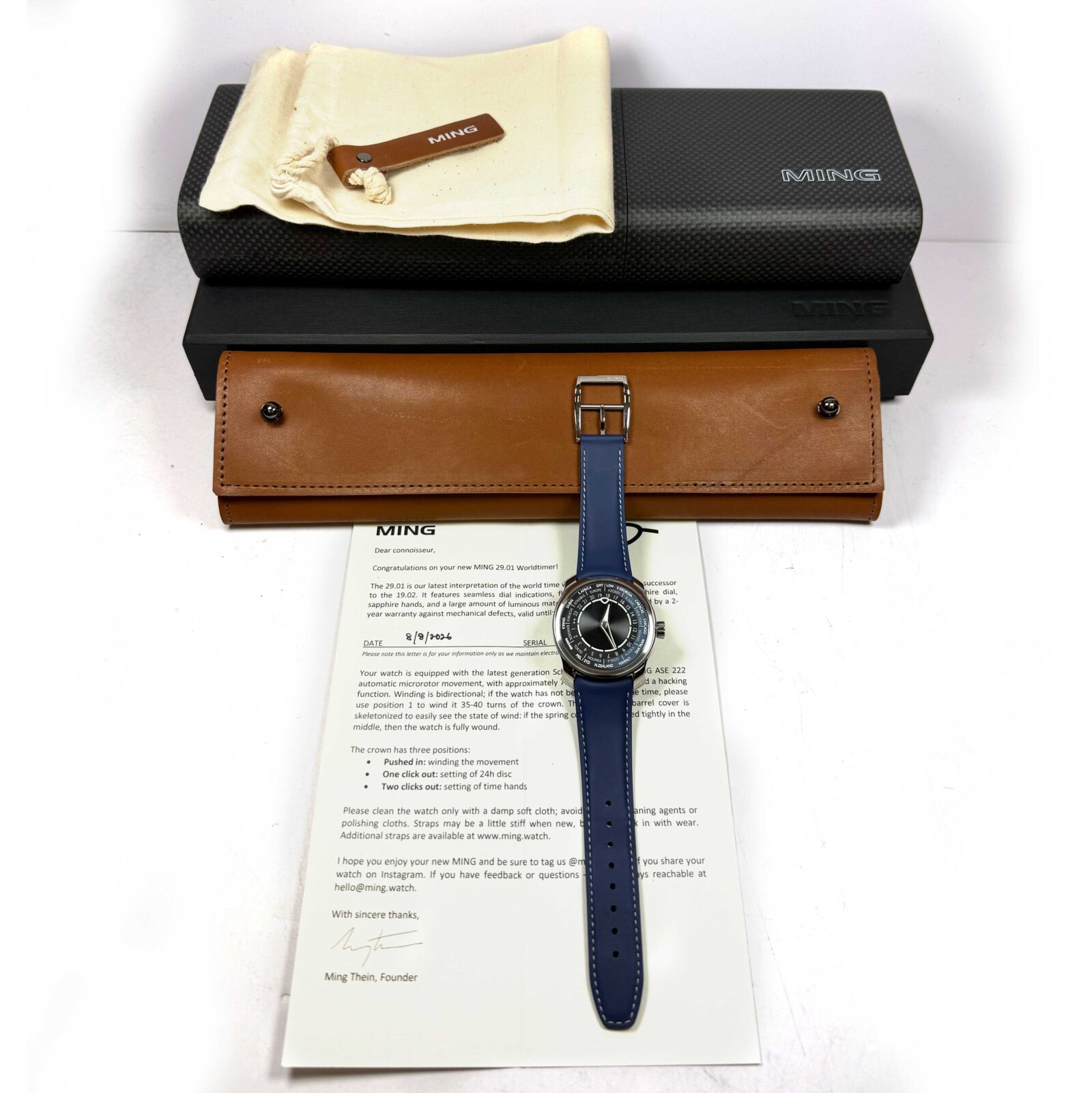 this ming watch is in amazing condition and comes with its box and warranty paper dated august 8th, 2026 for the 2 year warranty dating the production year to be 2024. This watch is in stock and available to ship immediately!