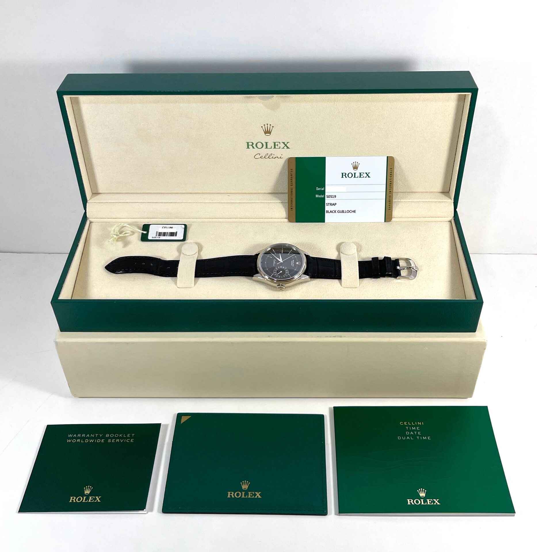 Read Morethis rolex is in mint condition and comes with its box, papers, and warranty card dated may 19th, 2015. This watch features a white gold case that surrounds a black guilloche dial on a black genuine alligator leather strap. This watch is in stock and available to ship immediately!