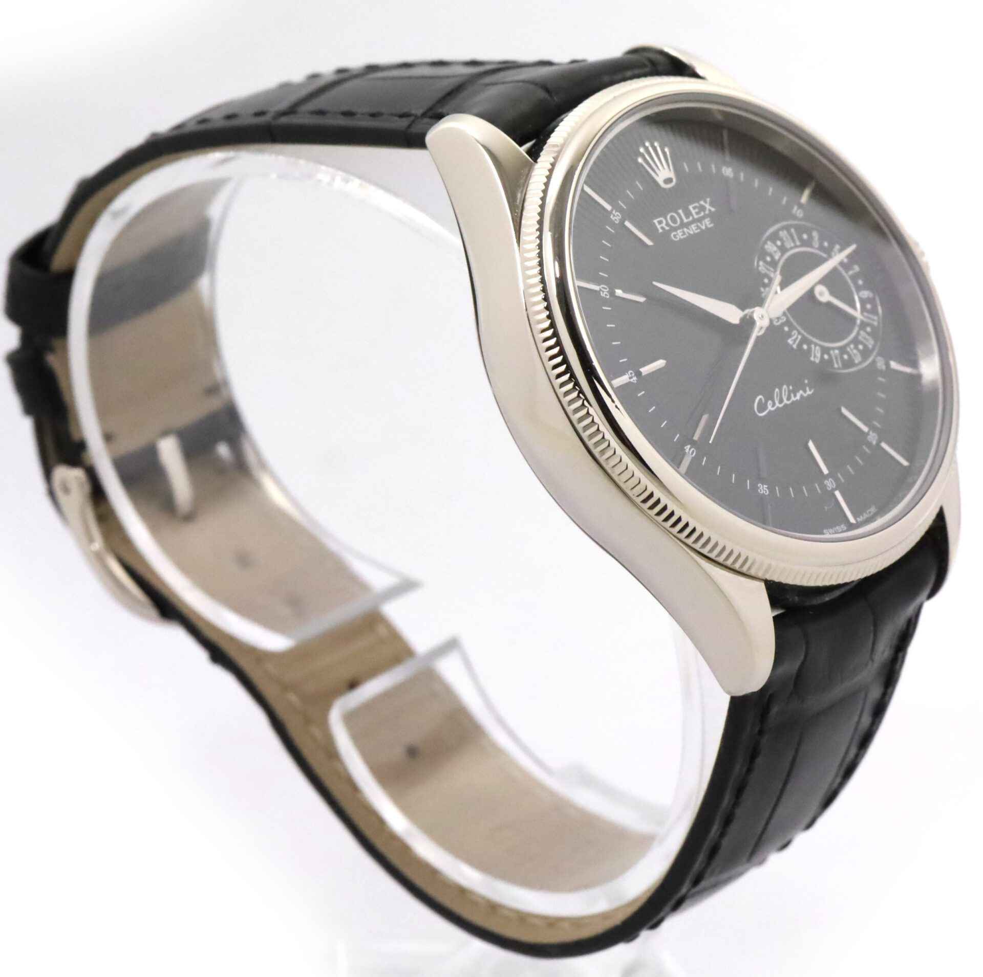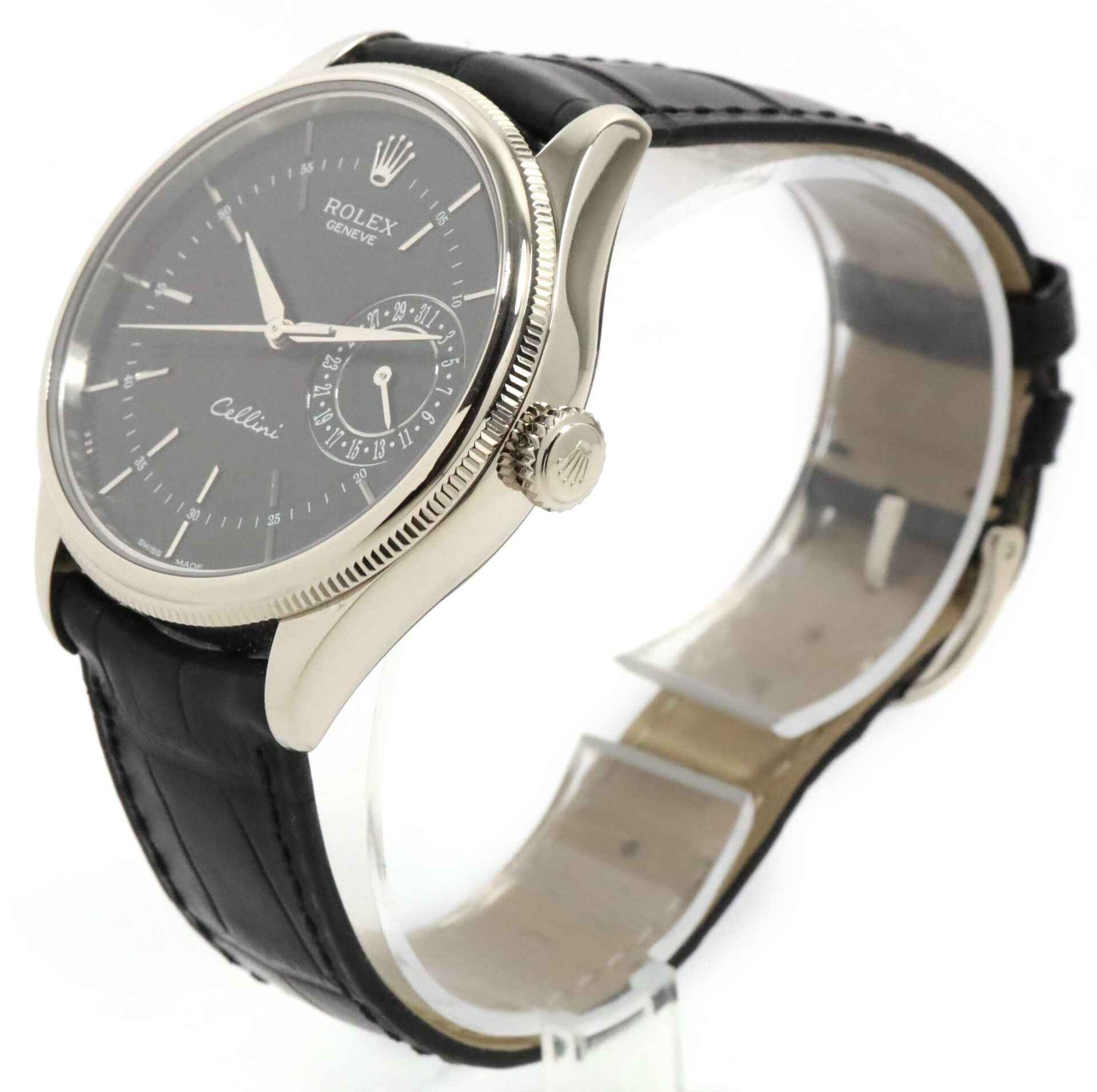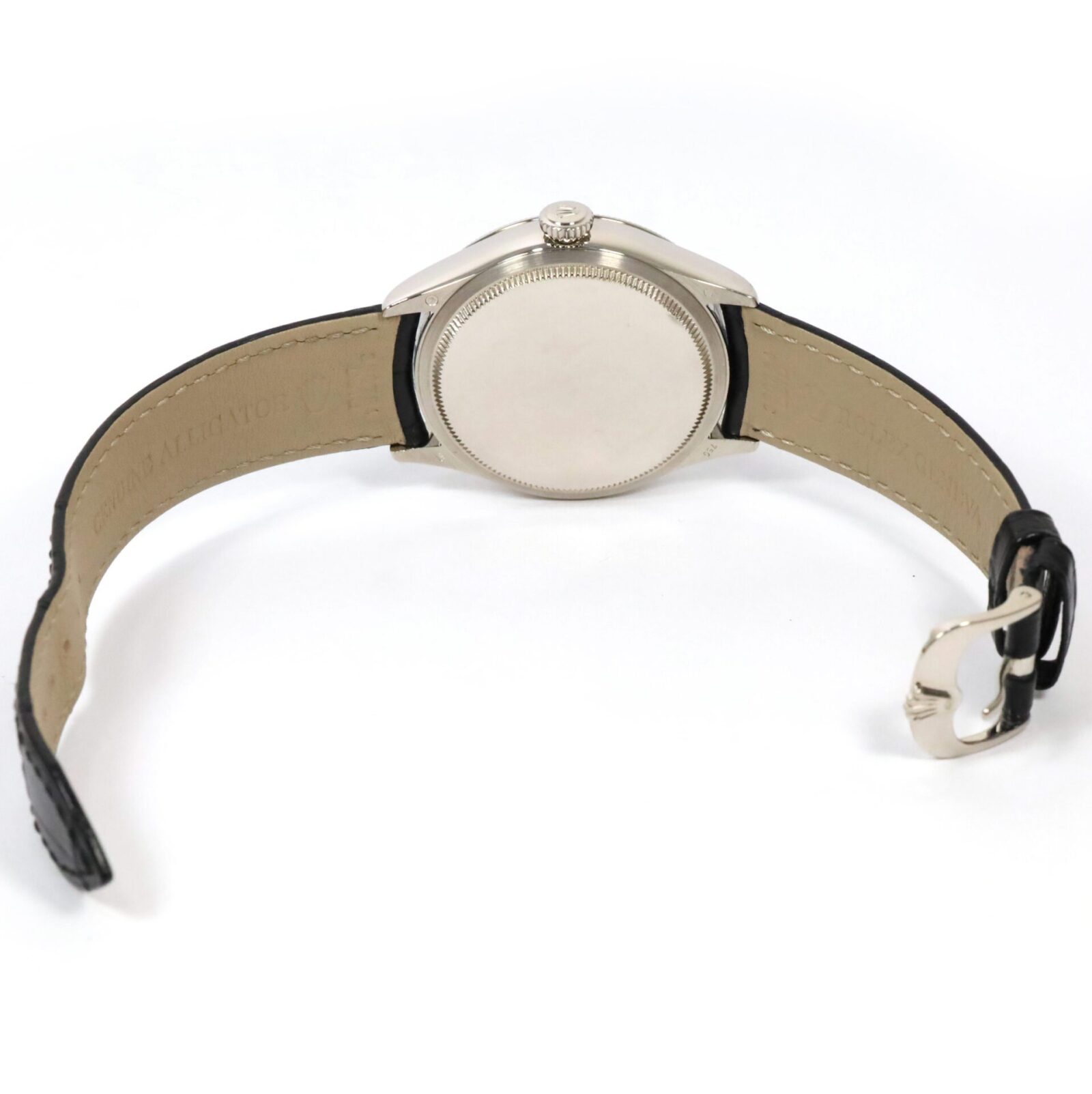 This Rolex is in mint condition and comes with its box, papers, and warranty card dated May 19th, 2015. This watch features a white gold case that surrounds a black guilloche dial on a black genuine alligator leather stra...