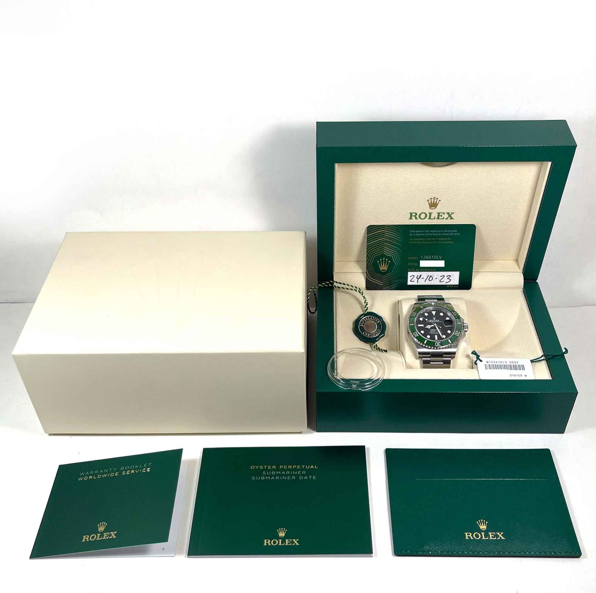 THIS ROLEX SUBMARINER IS IN MINT CONDITION AND WAS ONLY WORN ONCE FROM THE ORIGINAL OWNER. THIS WATCH COMES WITH ITS BOX, BOOKLETS, BEZEL PROTECTOR, BOTH HANG TAGS, AND WARRANTY CARD DATED OCTOBER 24TH, 2023 AS SHOWN IN THE PICTURES ATTACHED. THIS WATCH FEA...