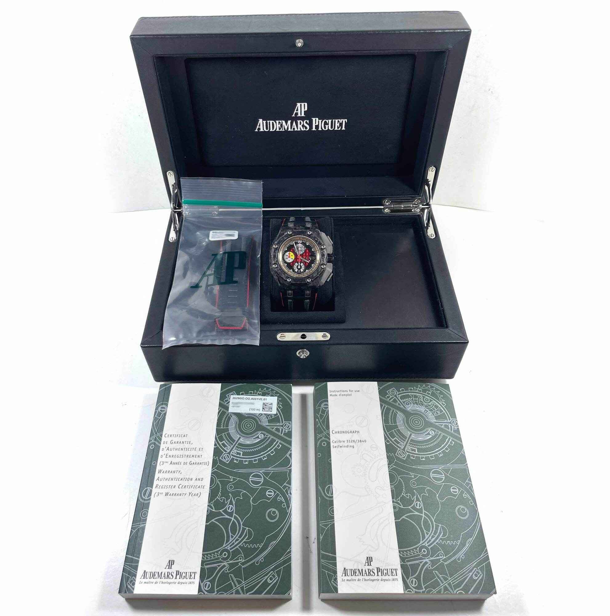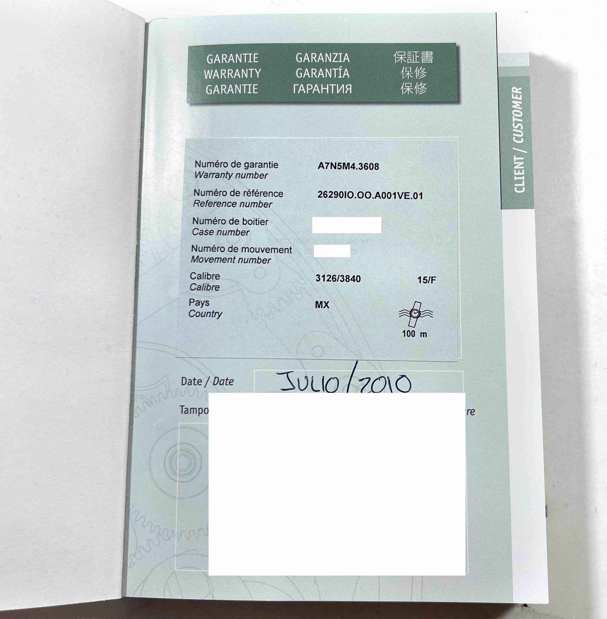 WE BOUGHT THIS WATCH FROM THE ORIGINAL OWNER AND HE BARELY WORE THE WATCH, IT IS IN MINT CONDITION AND COMES WITH ITS BOX, BOOKLETS, ONE ADDITIONAL NEW AP BLACK STRAP, AND WARRANTY PAPER DATED JULY, 2010 AS SHOWN IN THE PICTURES ATTACHED. THIS WATCH IS IN S...