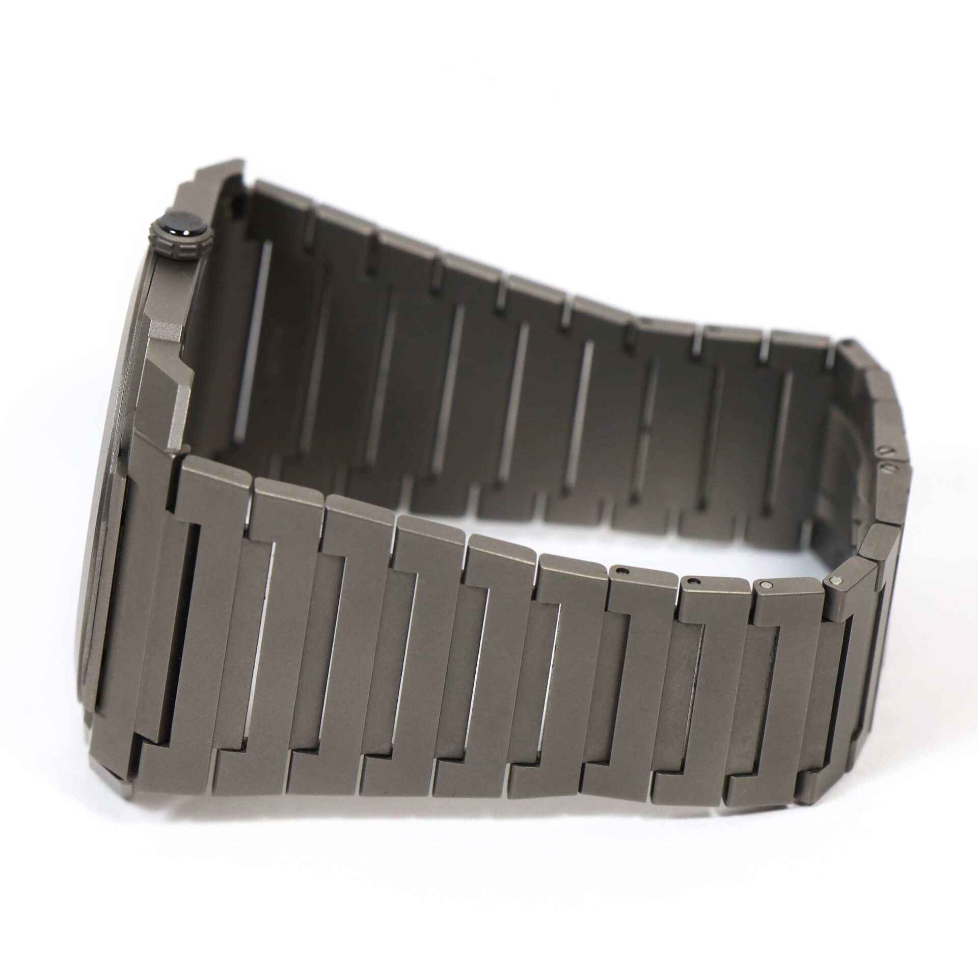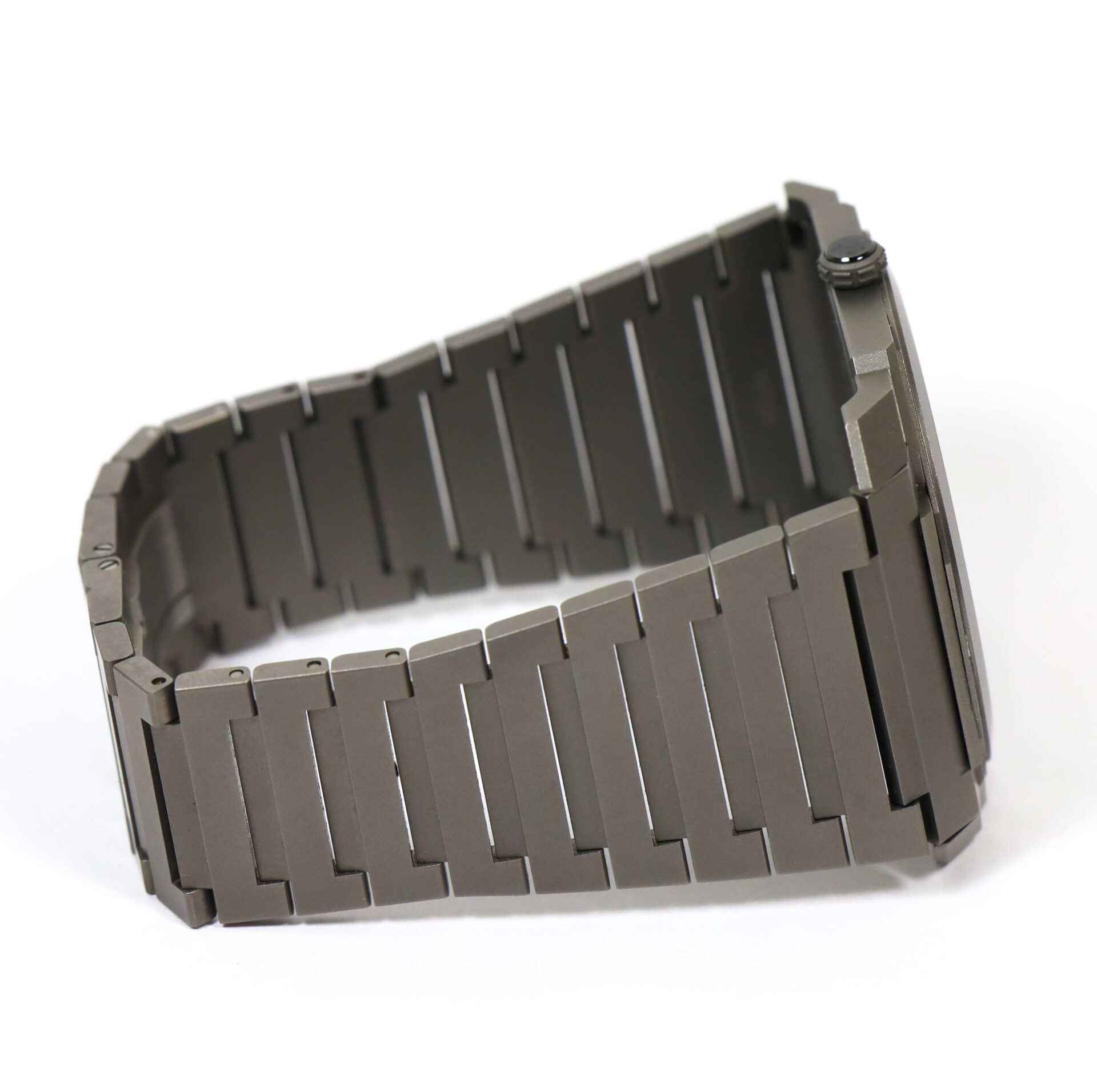 this bulgari is in super mint condition and comes with its box, spare links, bulgari microfiber cloth, and warranty card dated may 13th, 2021. This watch features an ultra-thin titanium case and bracelet and surrounds a titanium dial. This bulgari wears extremely light and comfortable on the wrist! this watch is in stock and available to ship immediately!