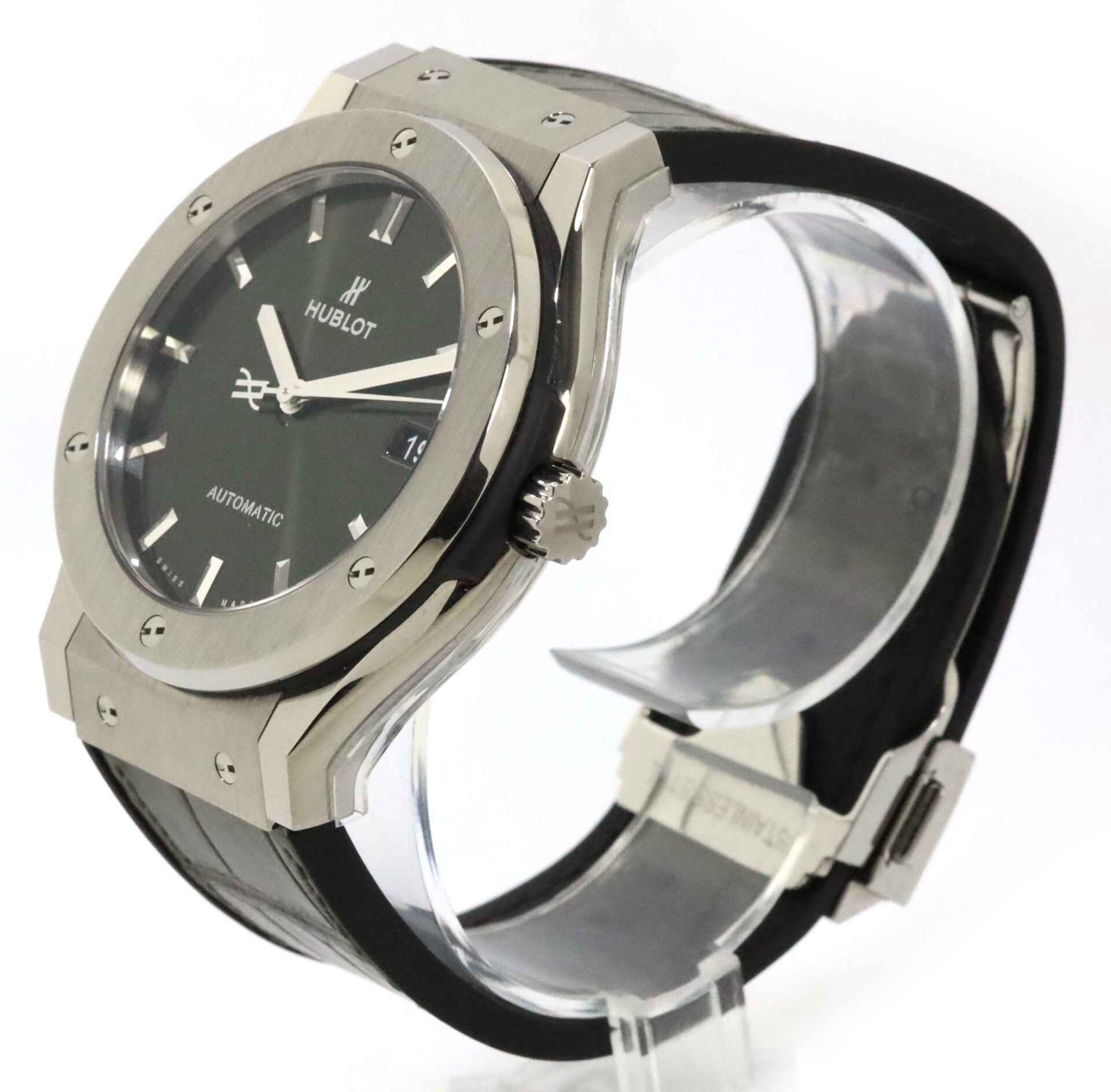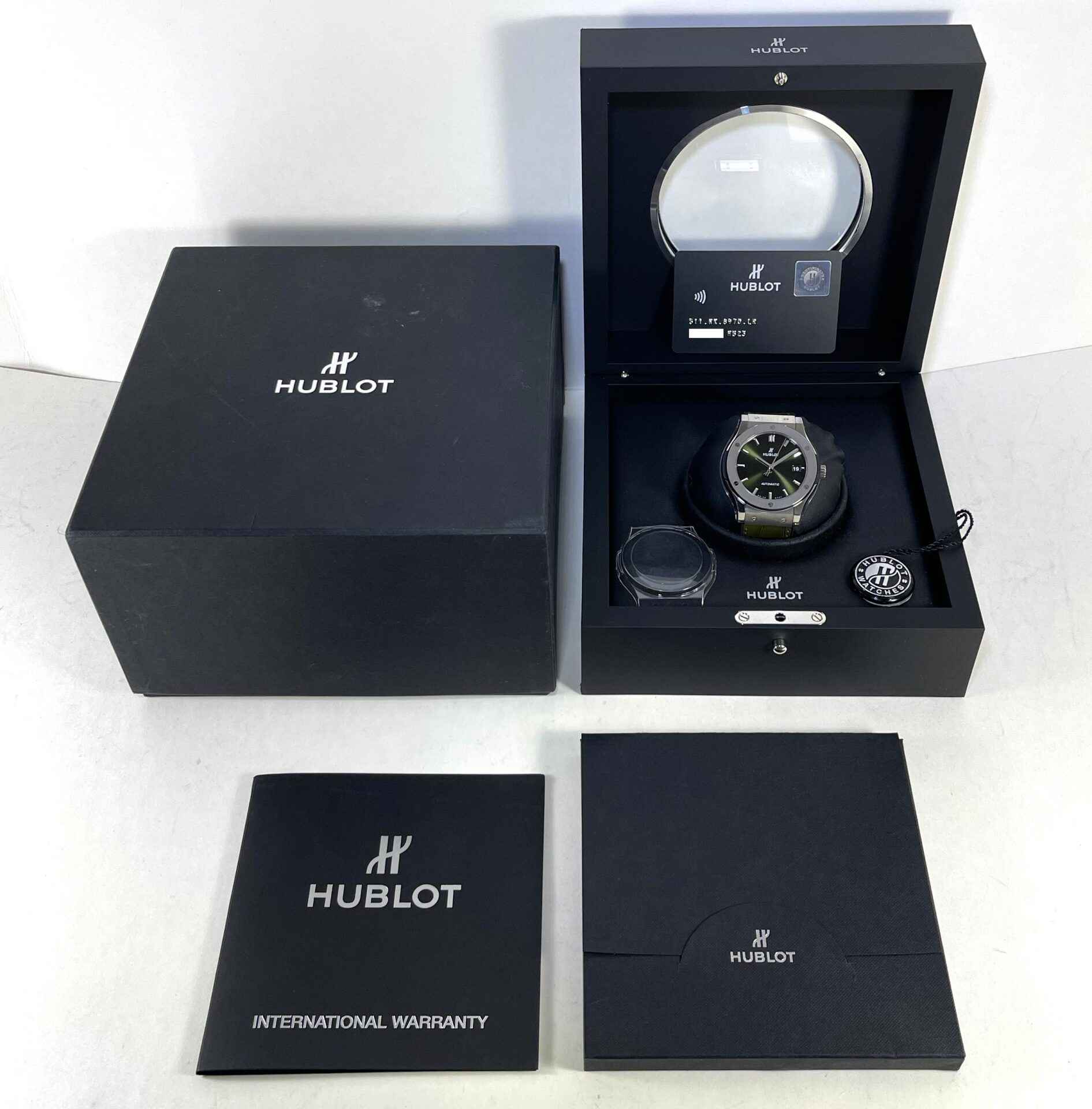 Read Morethis hublot is in mint condition and comes with box, papers, hang tag, plastic case protector, and warranty card. This watch still has a blue sticker on the clasp as shown in the photos attached. This watch is in stock and available to ship immediately!