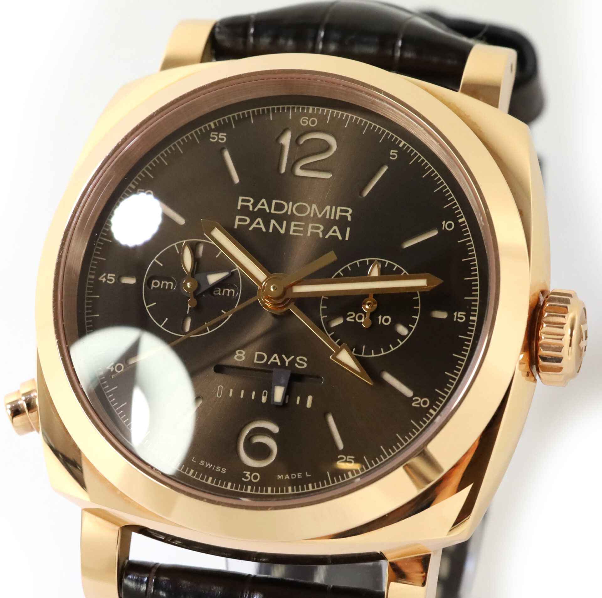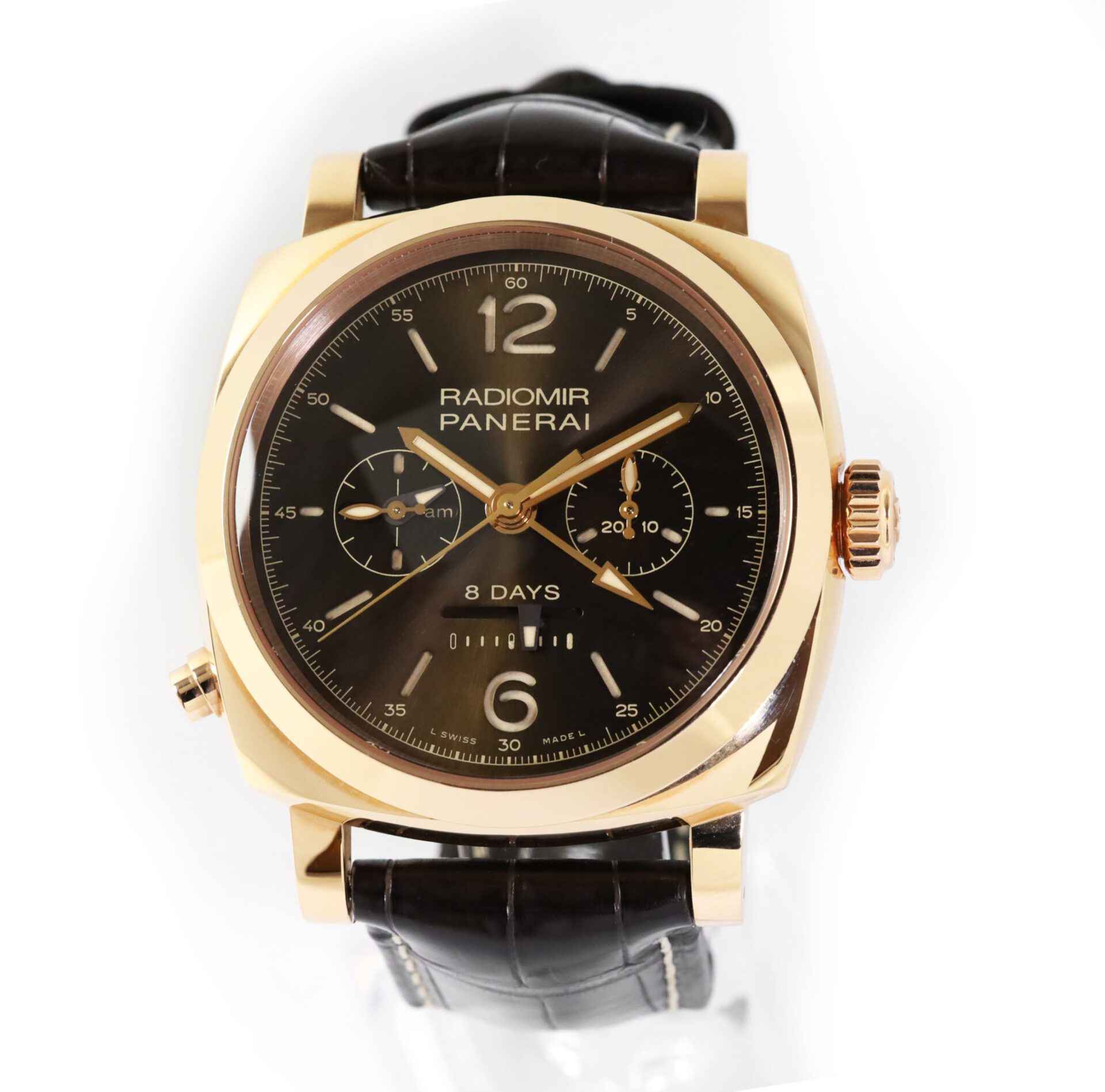 this panerai watch is in mint condition and was part of a limited edition of only 300 pieces produced. The original msrp for the watch is $41,000 but we have it available at a great discount price. as shown in our pictures attached, this watch features 18k rose gold case with a brown dial on a brown leather strap. This watch does not come with box and papers.