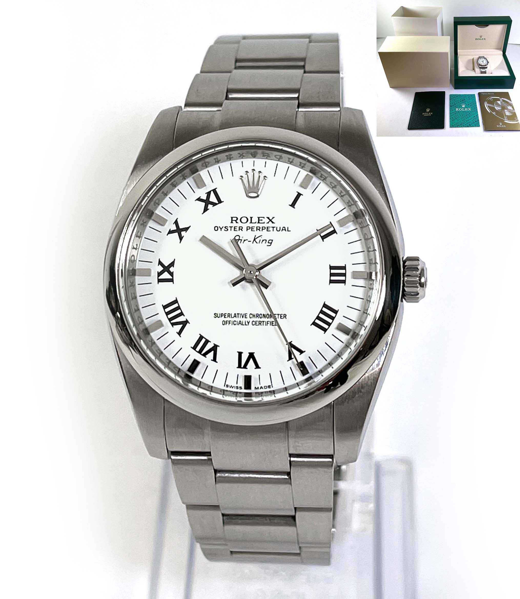 Read Morethis watch is in superb condition and is keeping accurate time. It comes with a rolex presentation box and booklets, the original warranty card is not included. The bracelet has all of its original links and will fit up to an 8 inch wrist.