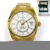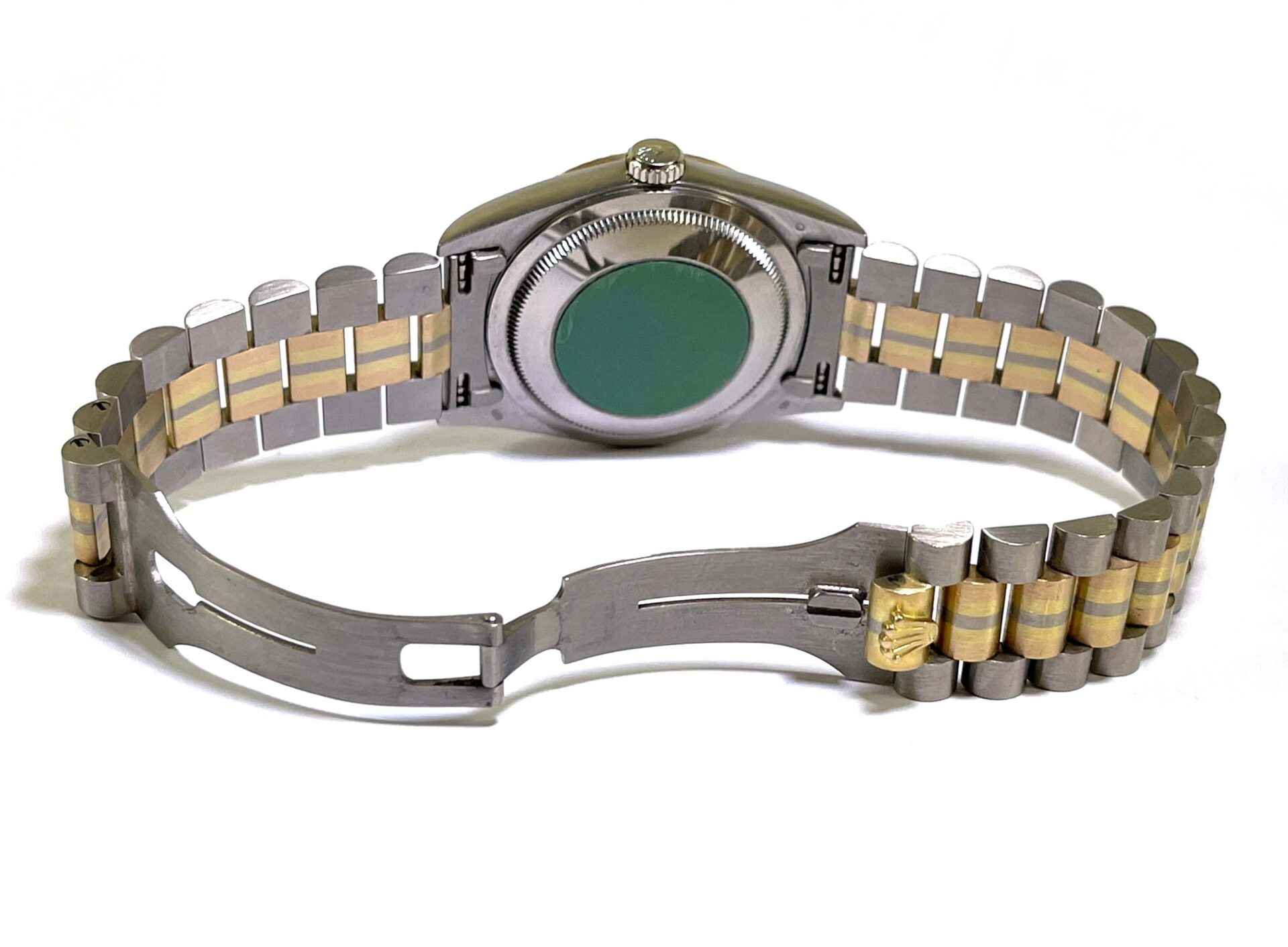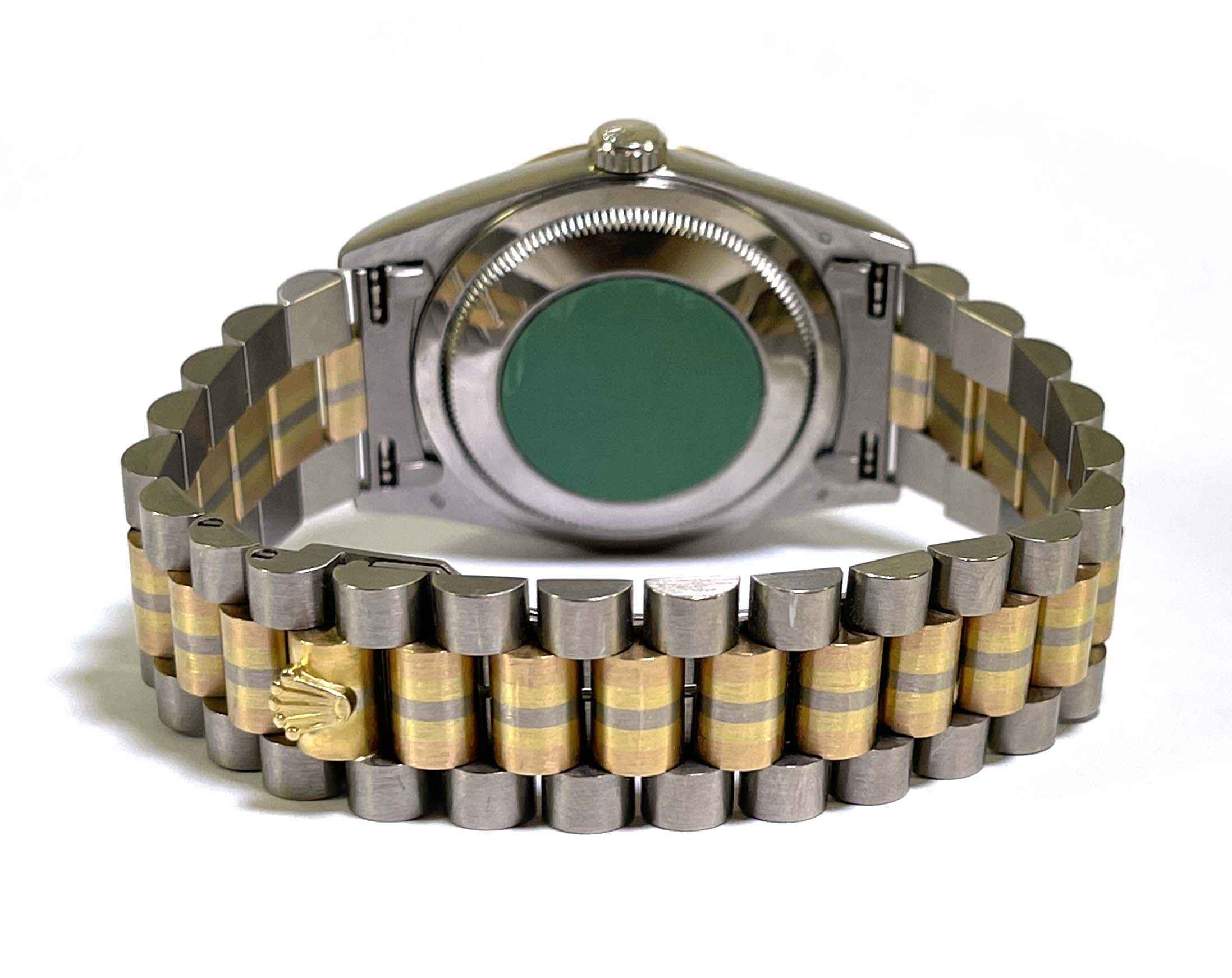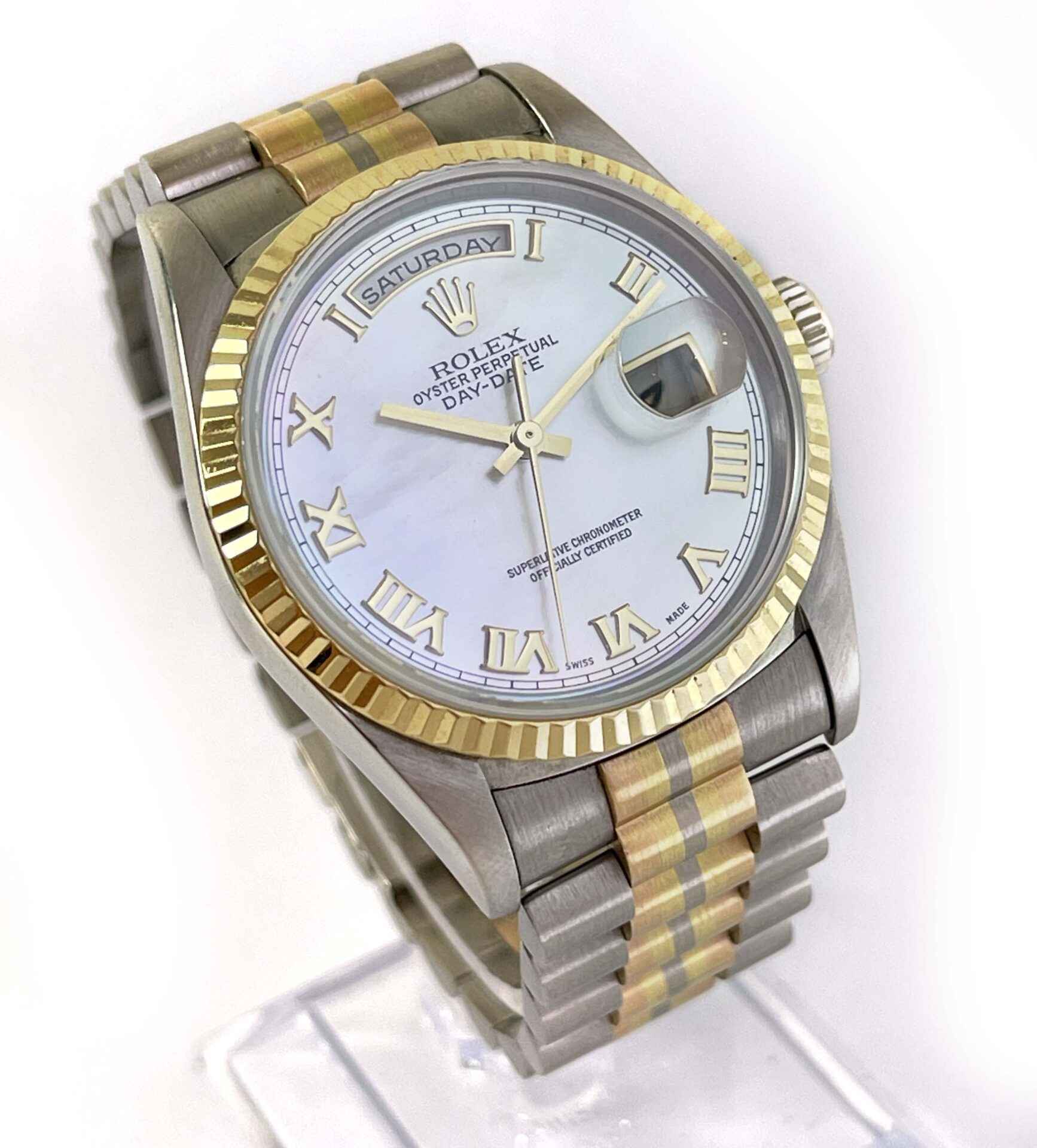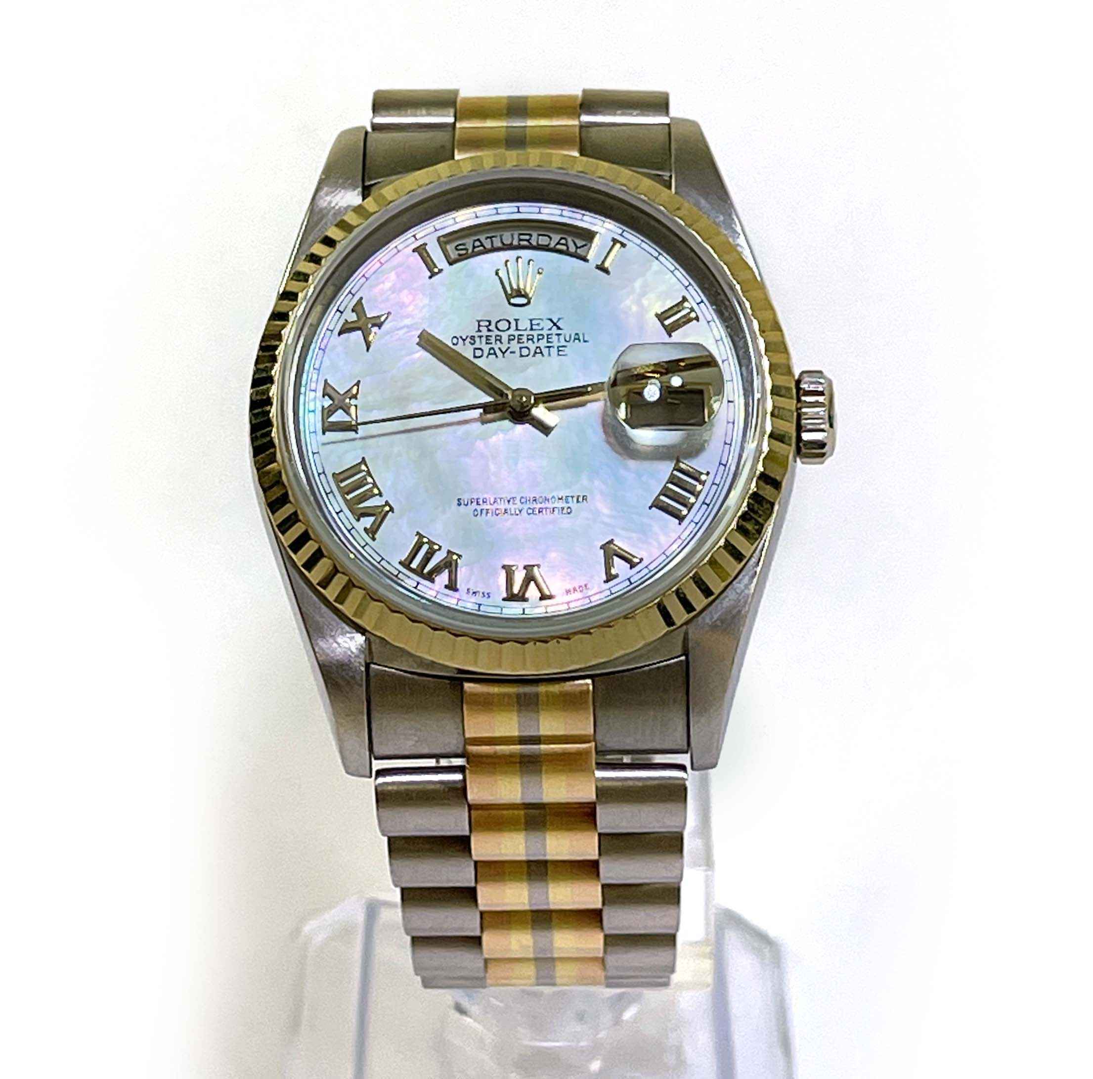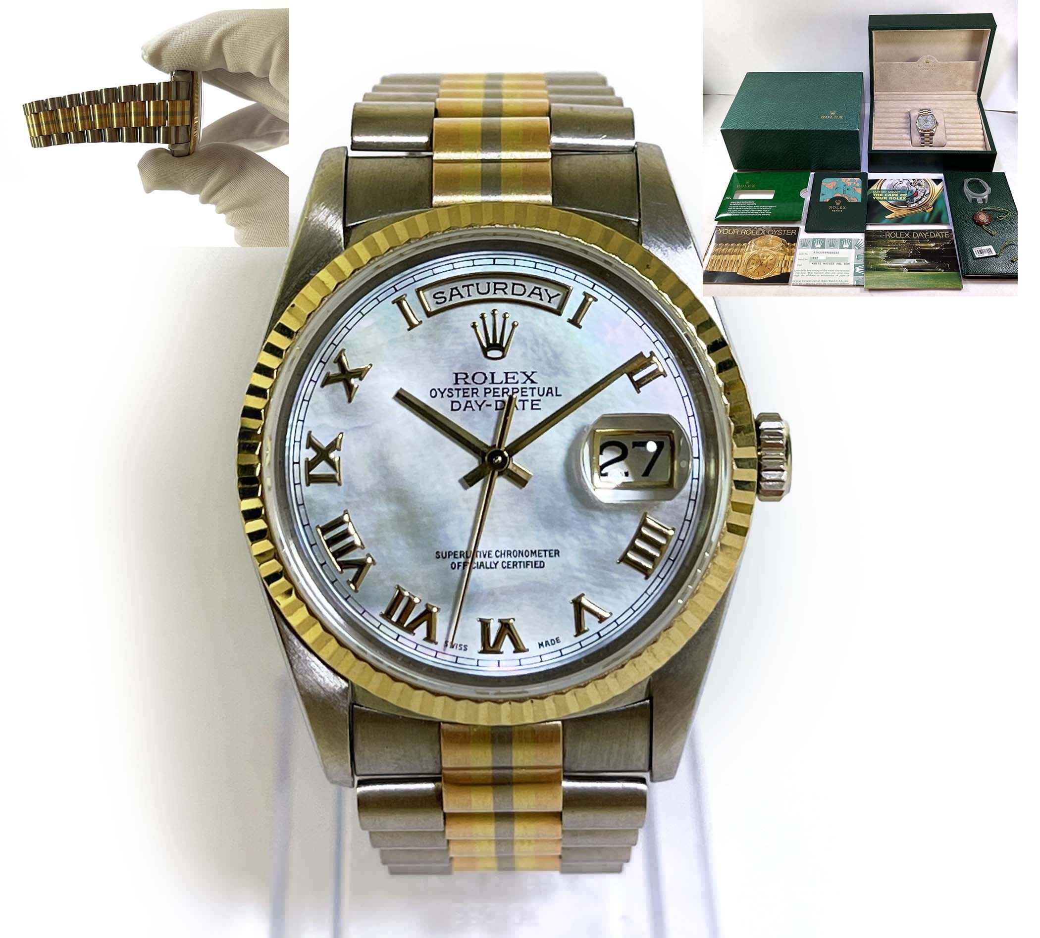 Read Morethis watch is in amazing condition and has never been polished, a true safe queen! it comes with its complete set of box, guarantee certificate dated march 7th 2000, hang tags, booklets, and bezel protector. The bracelet will fit up to approximately a 7.5 inch wrist. The bracelet shows little to no stretch. The watch features a factory white mother of pearl roman dial. We searched the internet extensively and could not find 1 single watch ever posted for sale featuring this combination (tridor with mop roman dial), this is a true investment piece that will surely appreciate in value over time.