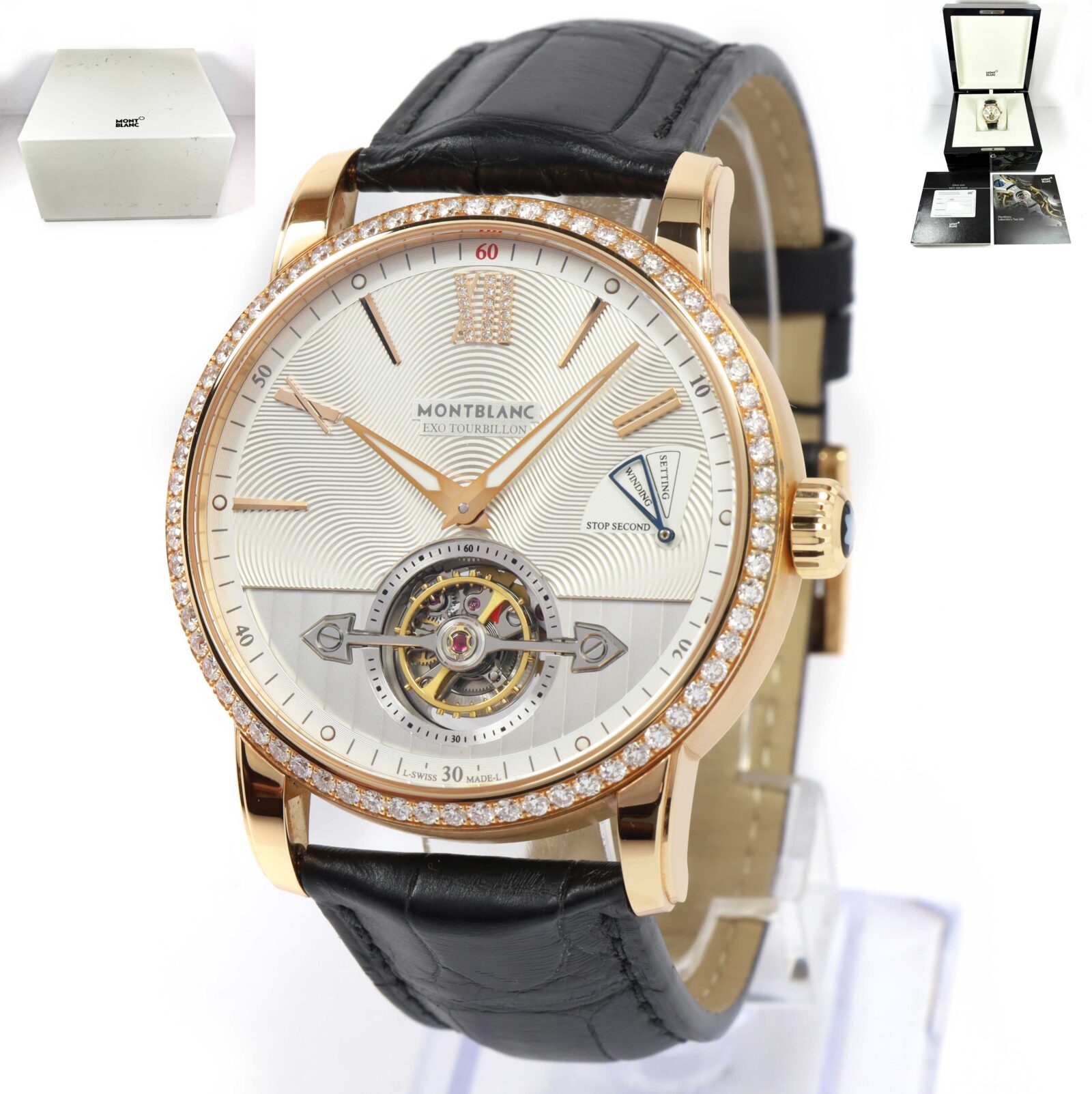 this montblanc watch is in new condition and comes with its box, booklet, and warranty card as shown in the pictures attached. This watch is in stock and available to ship immediately!