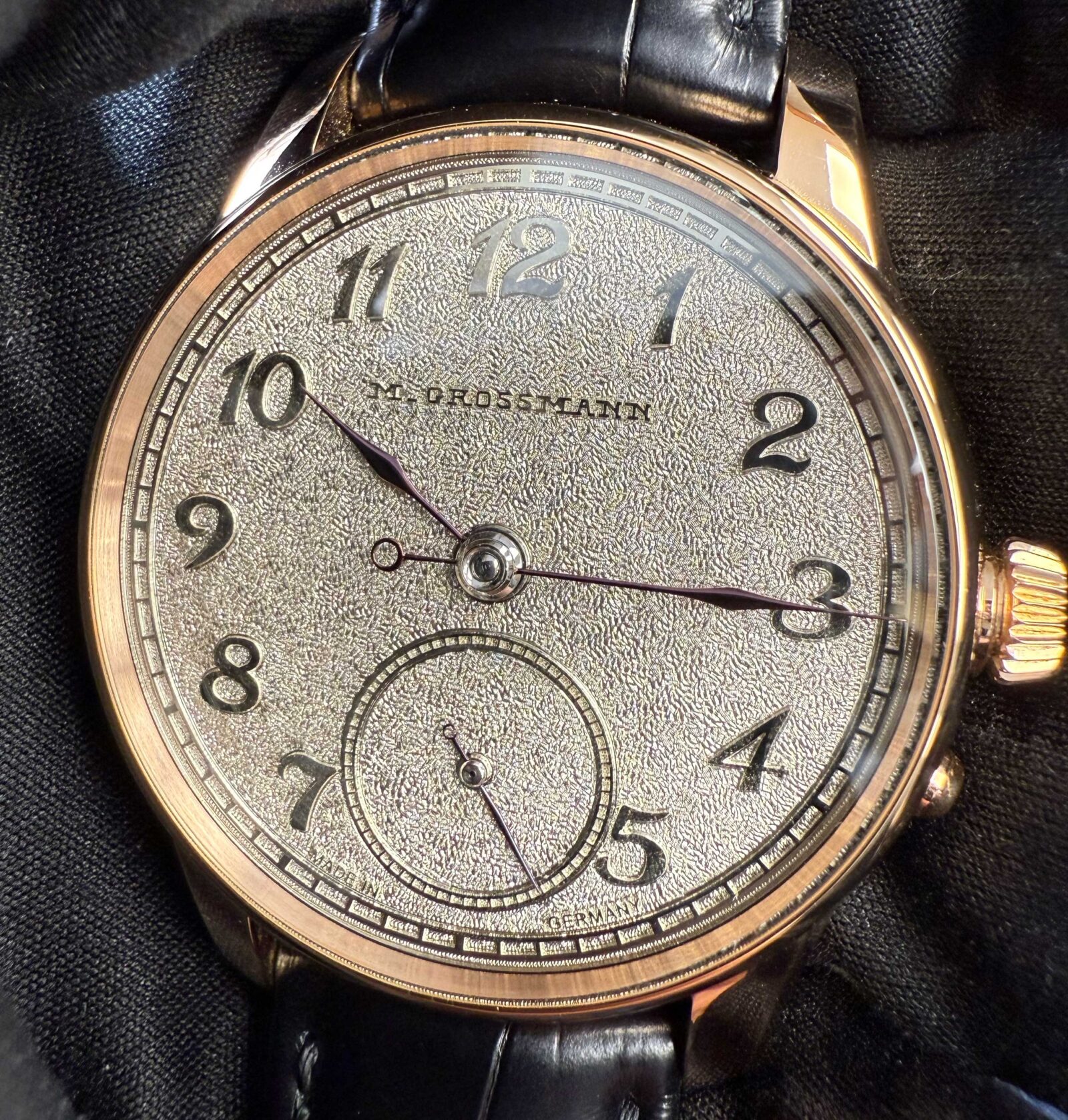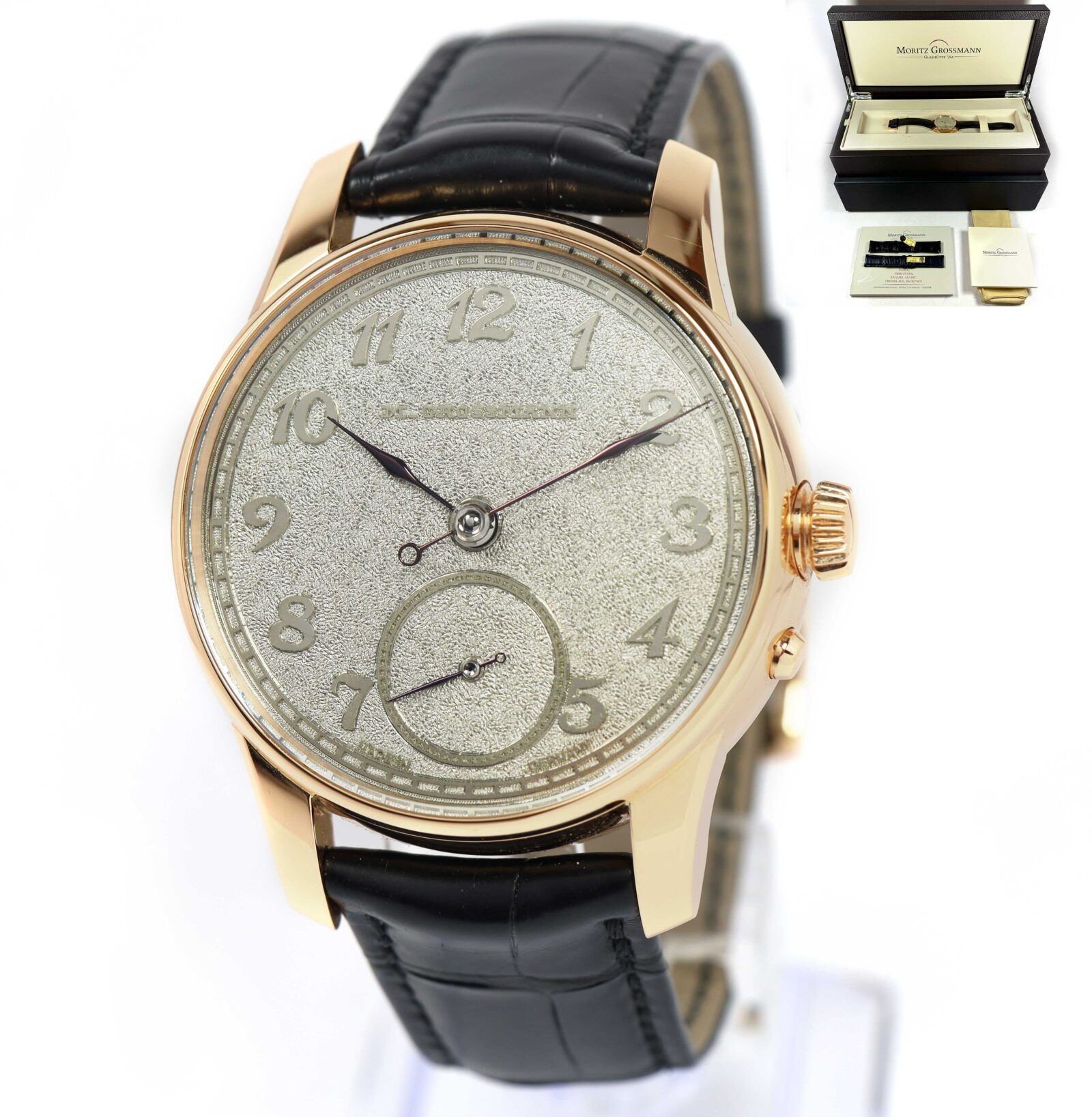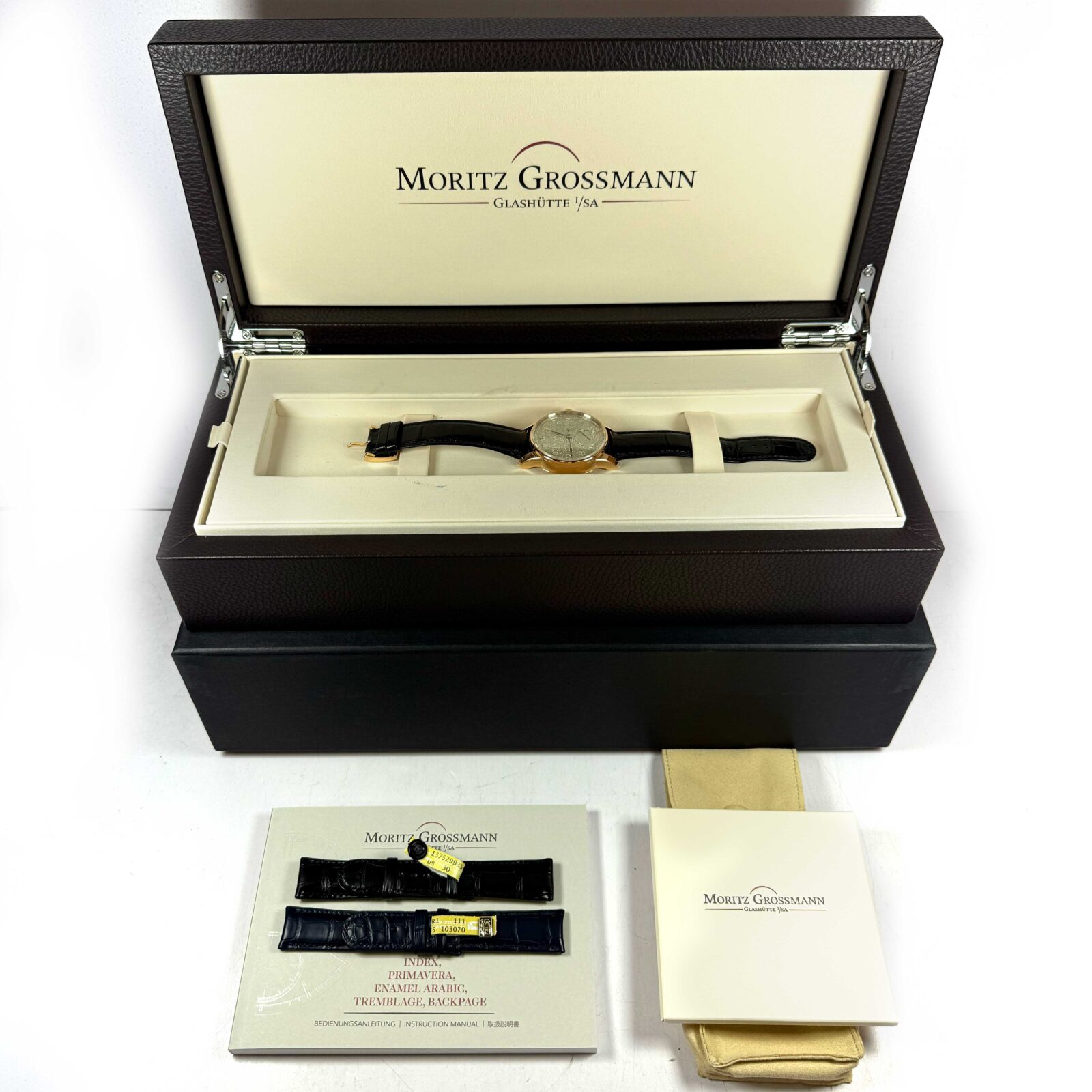 this moritz grossman watch is in excellent condition and comes with its box, booklets, 2 additional leather straps (1 black & 1 blue), and warranty paper dated december 2024 as shown in the pictures attached. This watch is in stock and available to ship immediately!