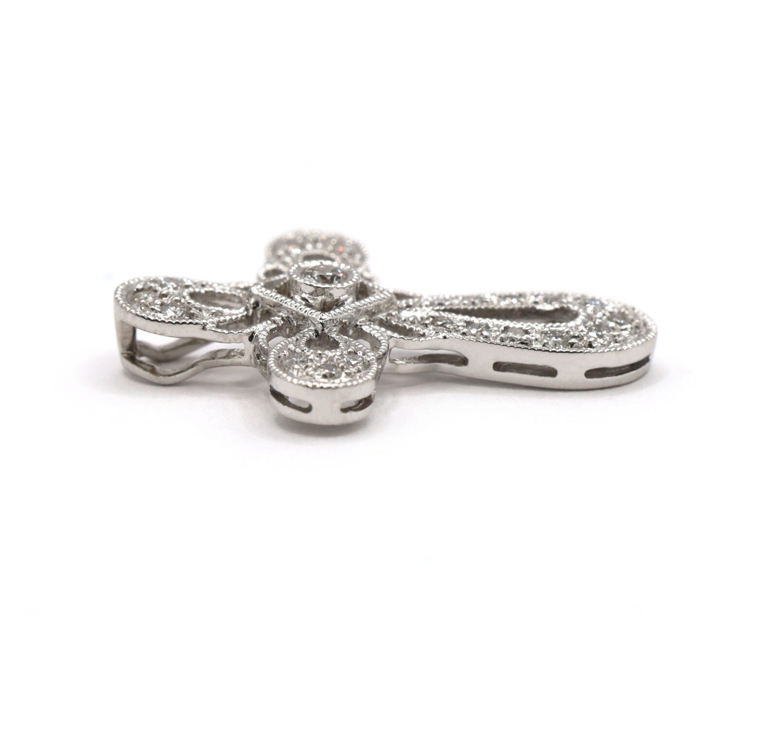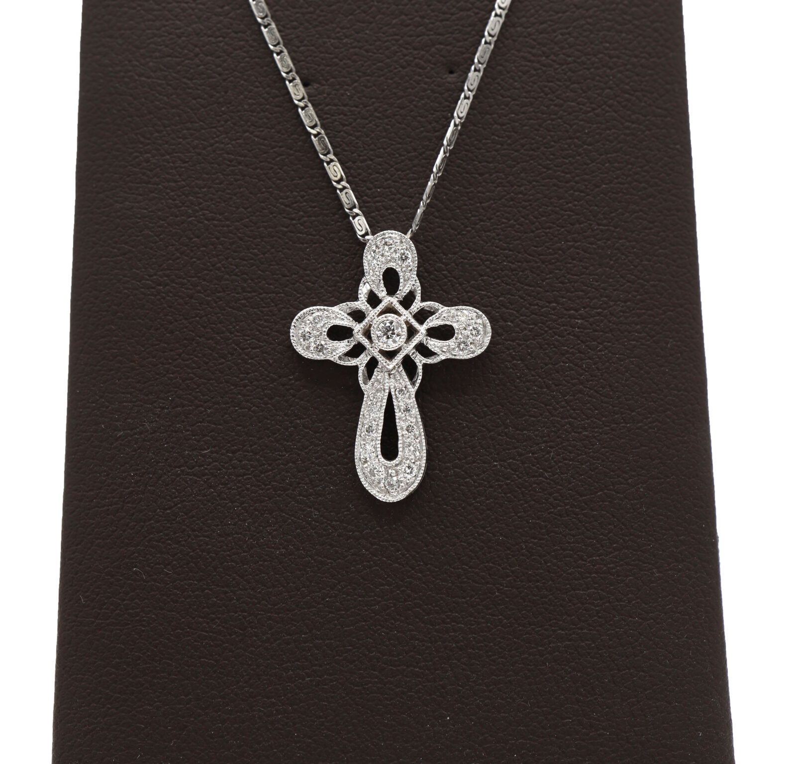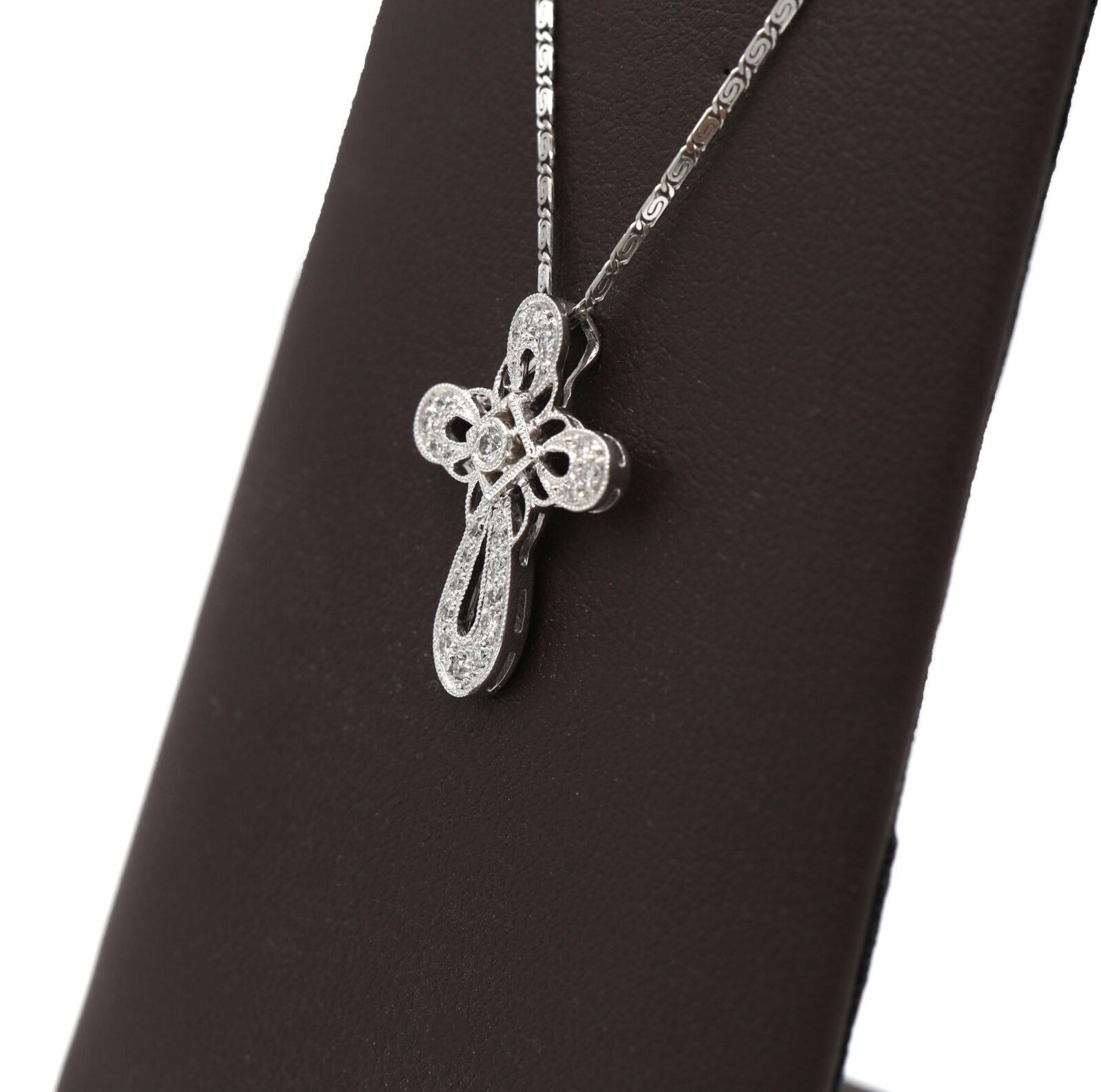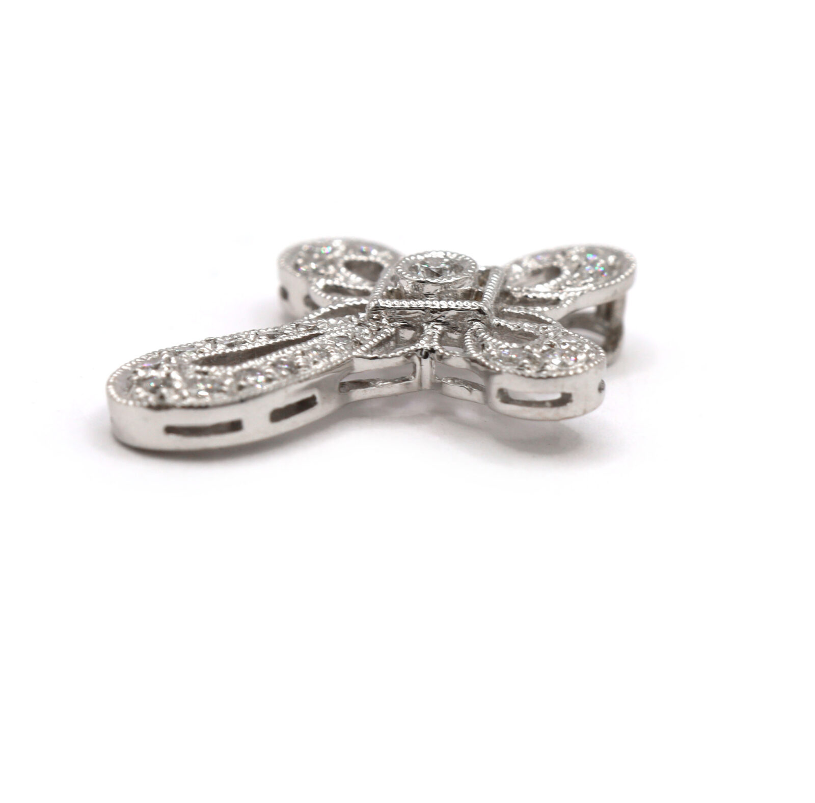 Material: 18k White Gold Gemstone: Natural Diamond Carat Weight: Approximately 0.27 Carat Clarity: VS2 Color: E/F Cut: Round Type: Cross Pendant Measurements: 22 x 17mm Weight: 2.2 Grams