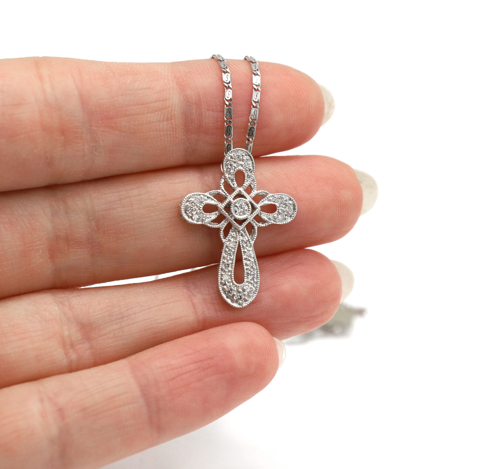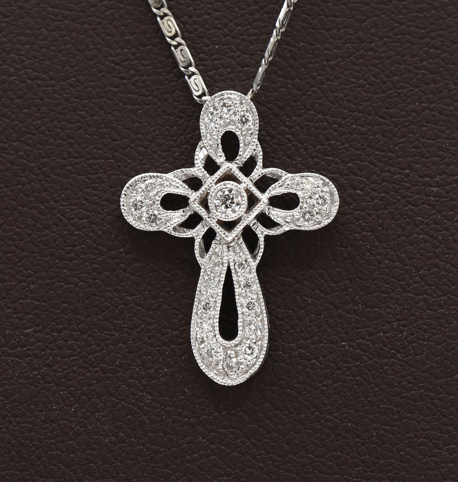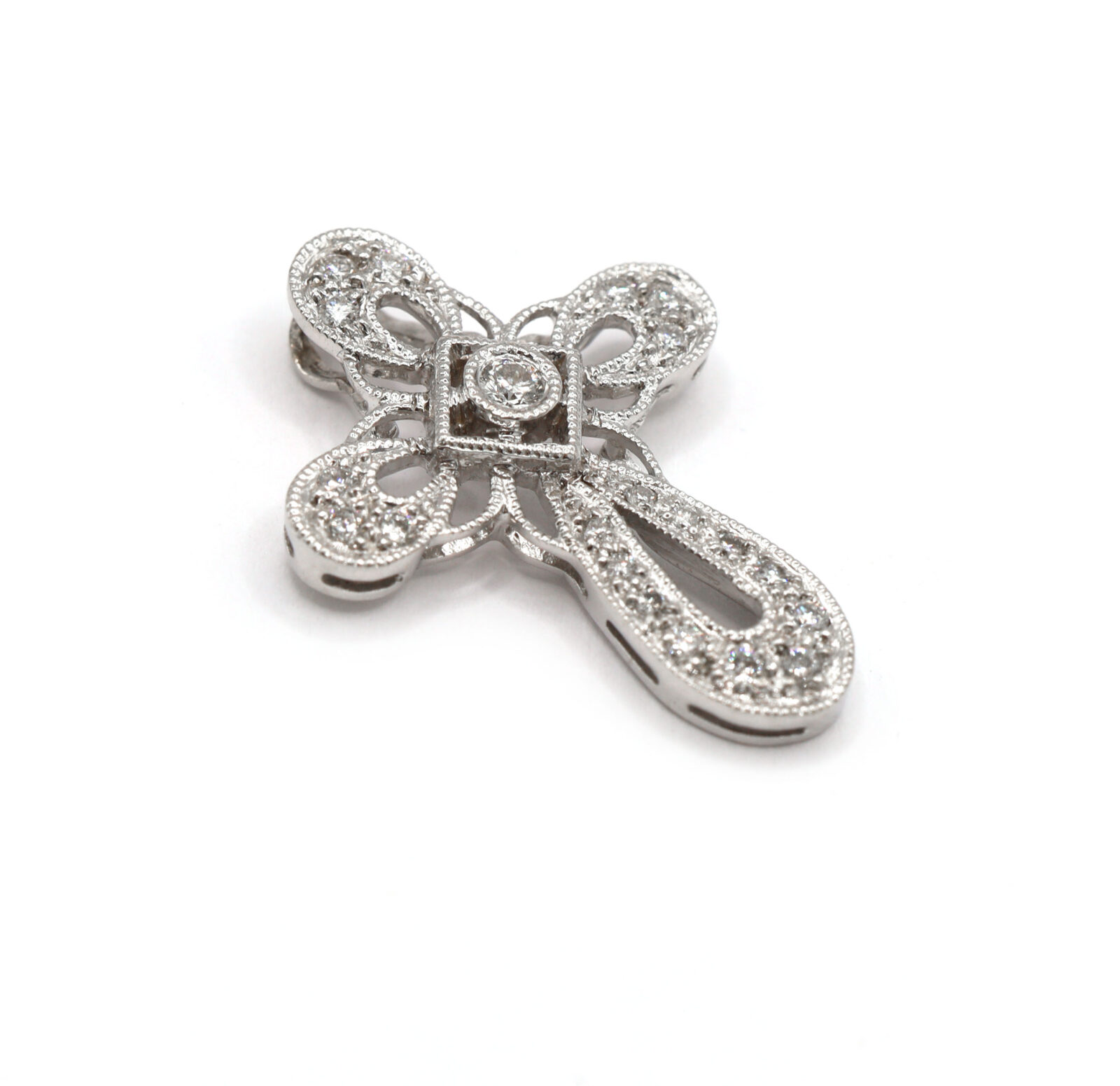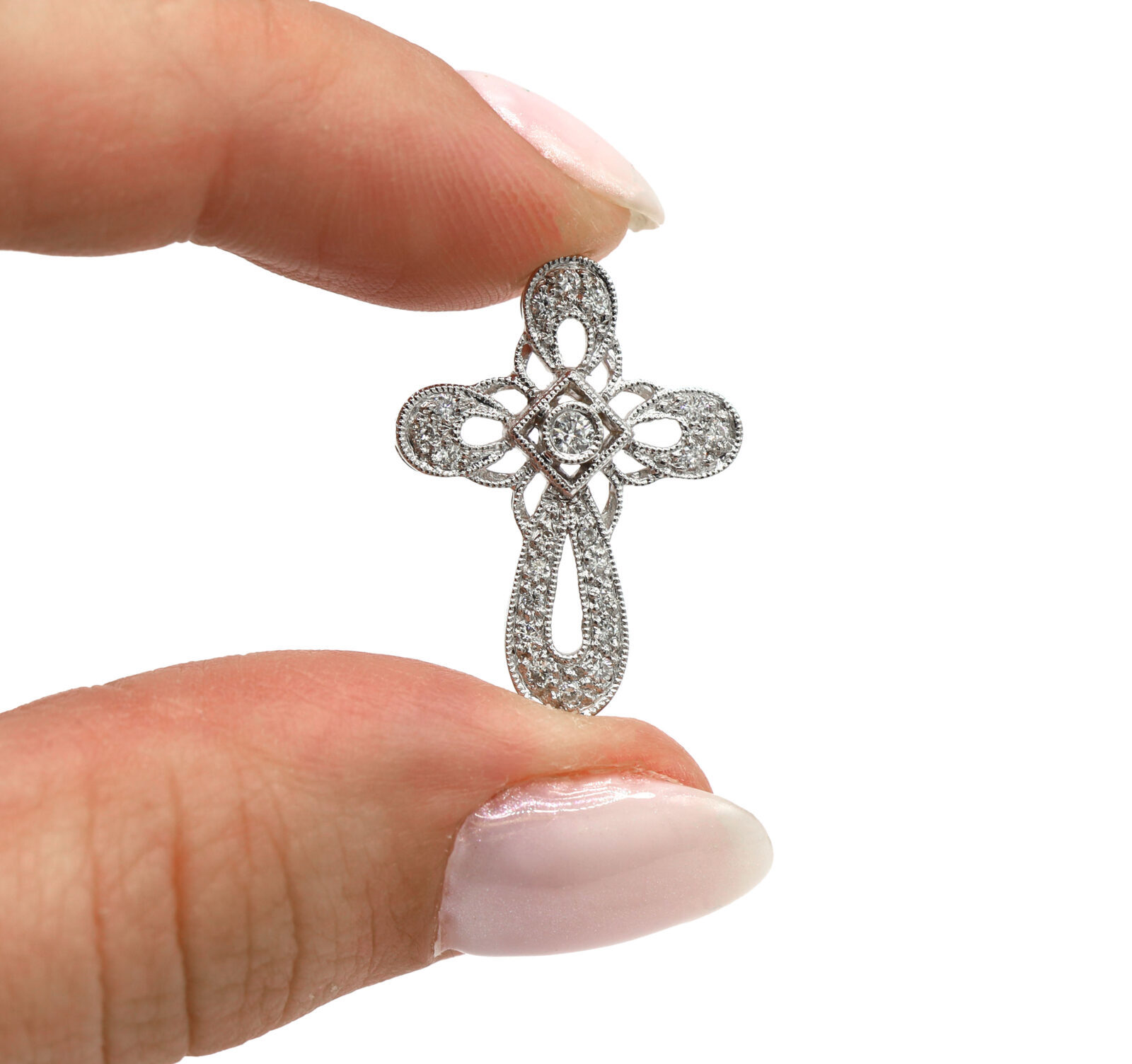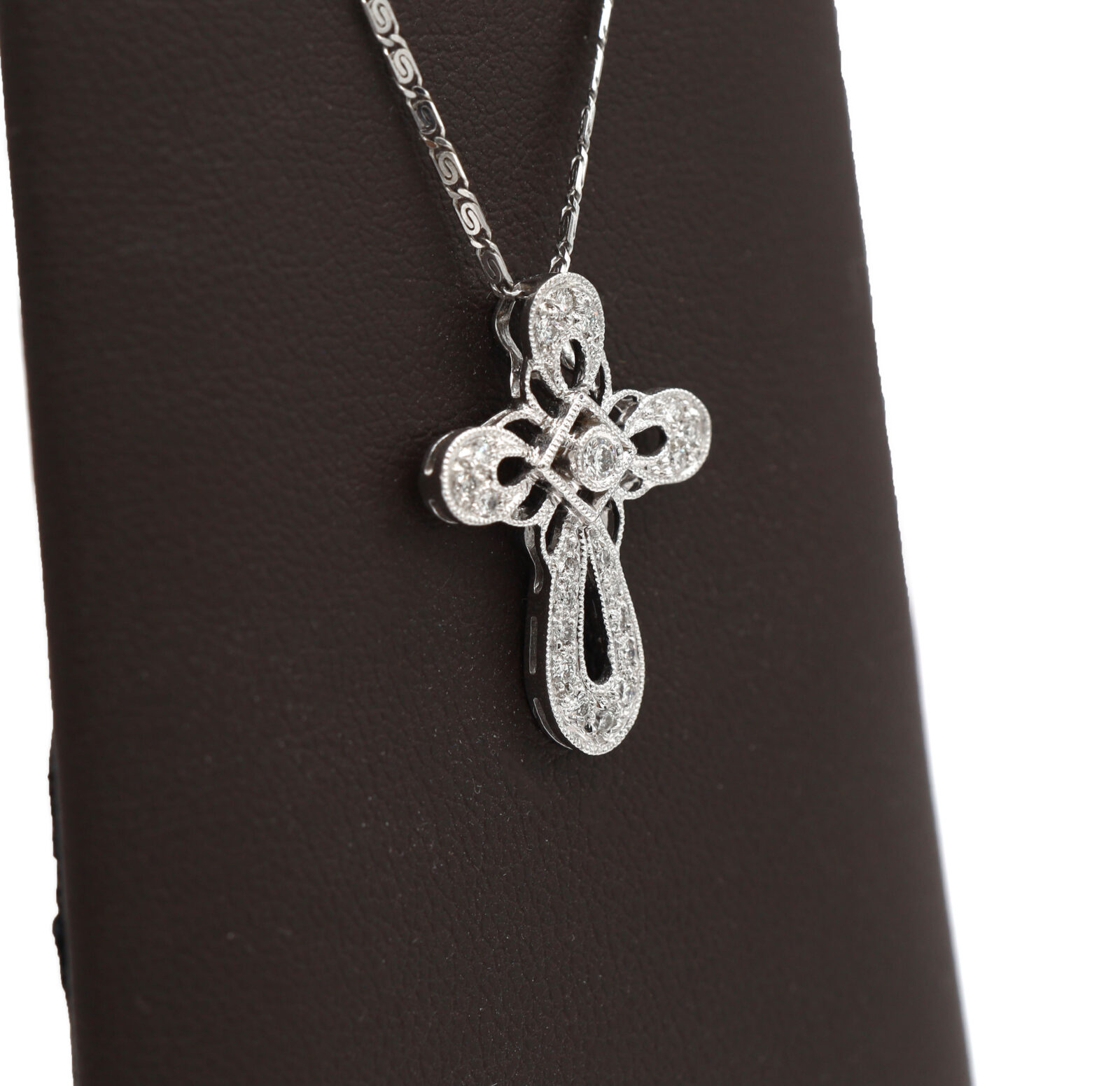 Material: 18k White Gold Gemstone: Natural Diamond Carat Weight: Approximately 0.27 Carat Clarity: VS2 Color: E/F Cut: Round Type: Cross Pendant Measurements: 22 x 17mm Weight: 2.2 Grams