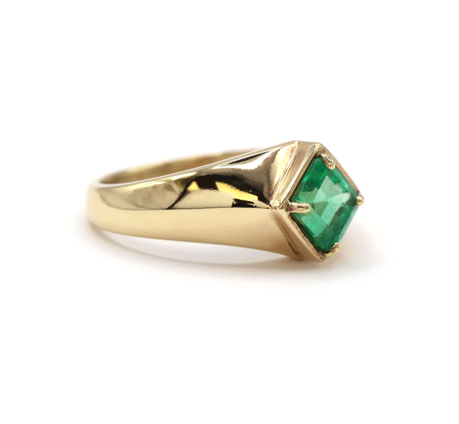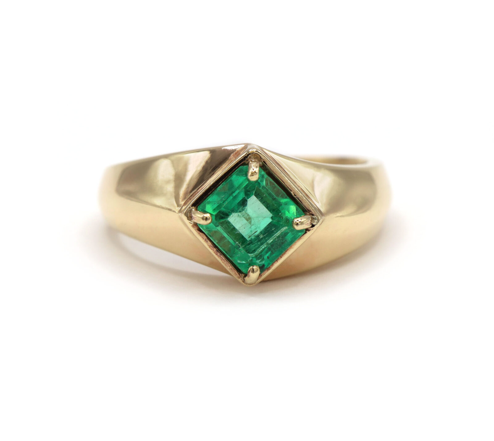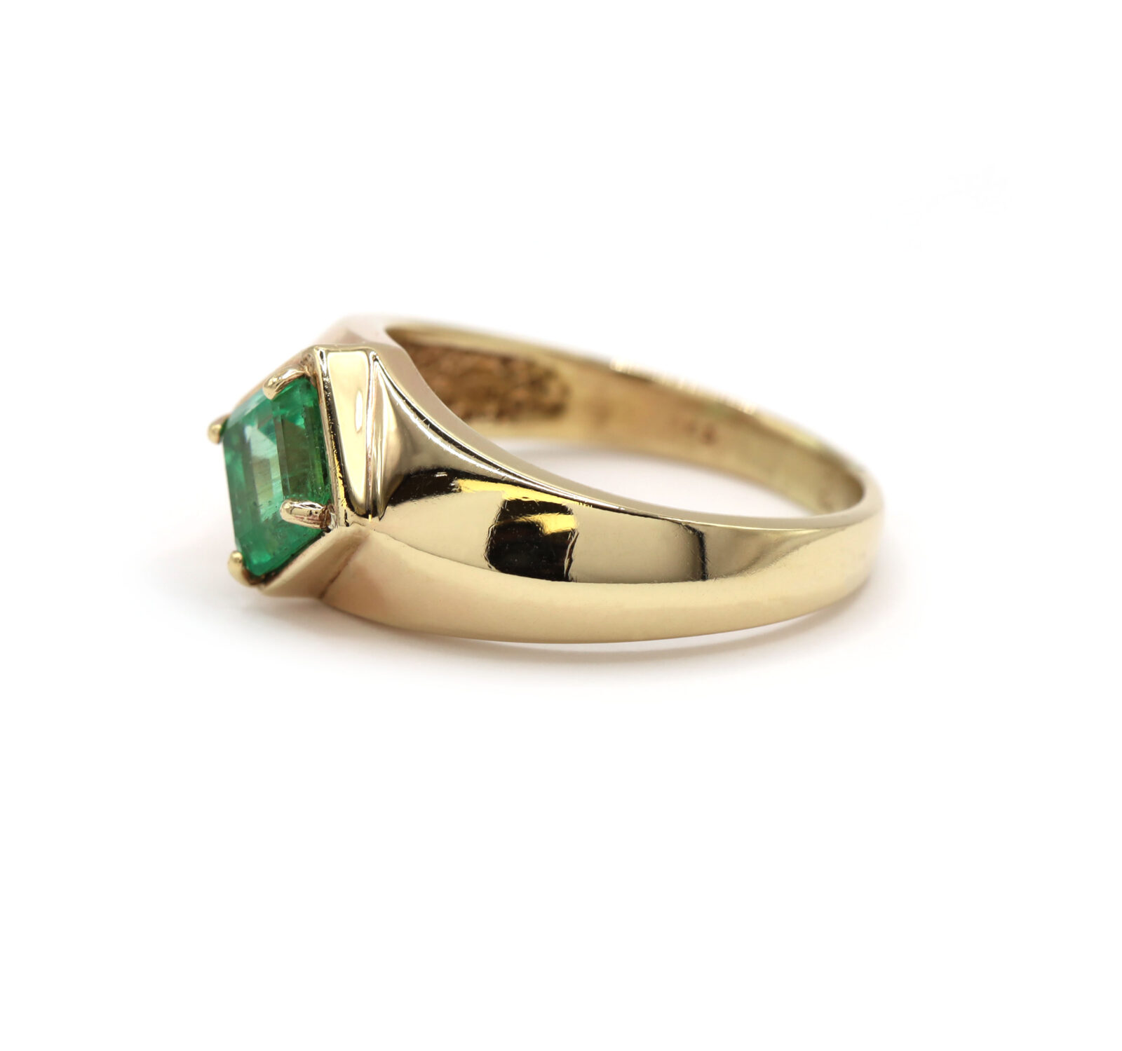 This sleek men’s ring holds a light green natural Emerald. The ring is crafted in 14k yellow gold, with a knife edged tapered shank to hold the emerald securely. The emerald comes with a written jeweler’s appraisal shown in the photos. Size: 12.75 Material: 14...