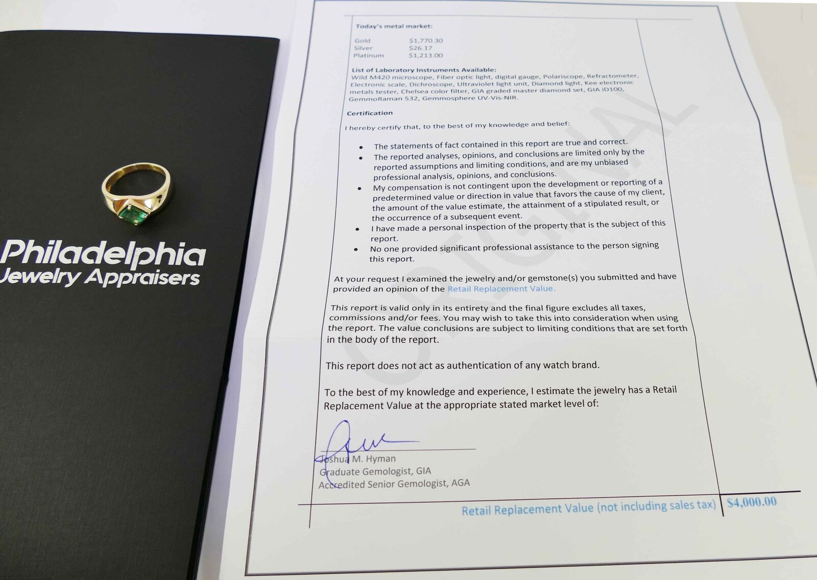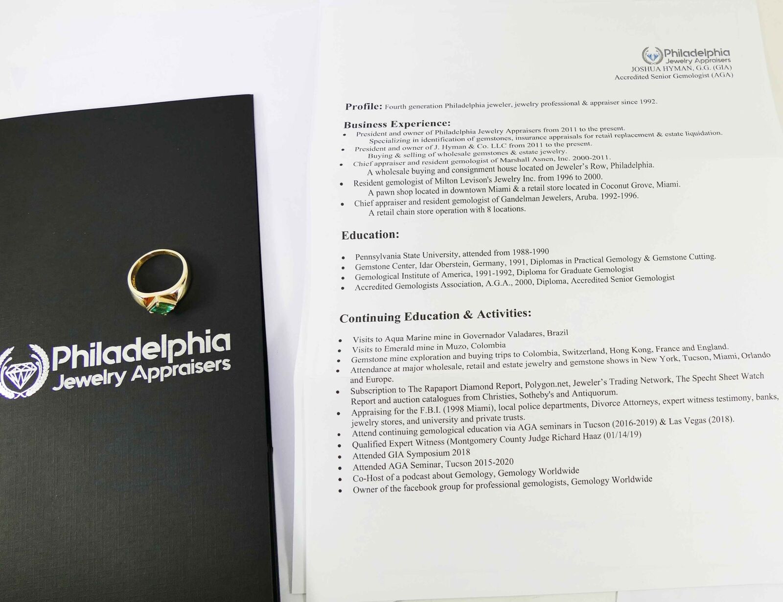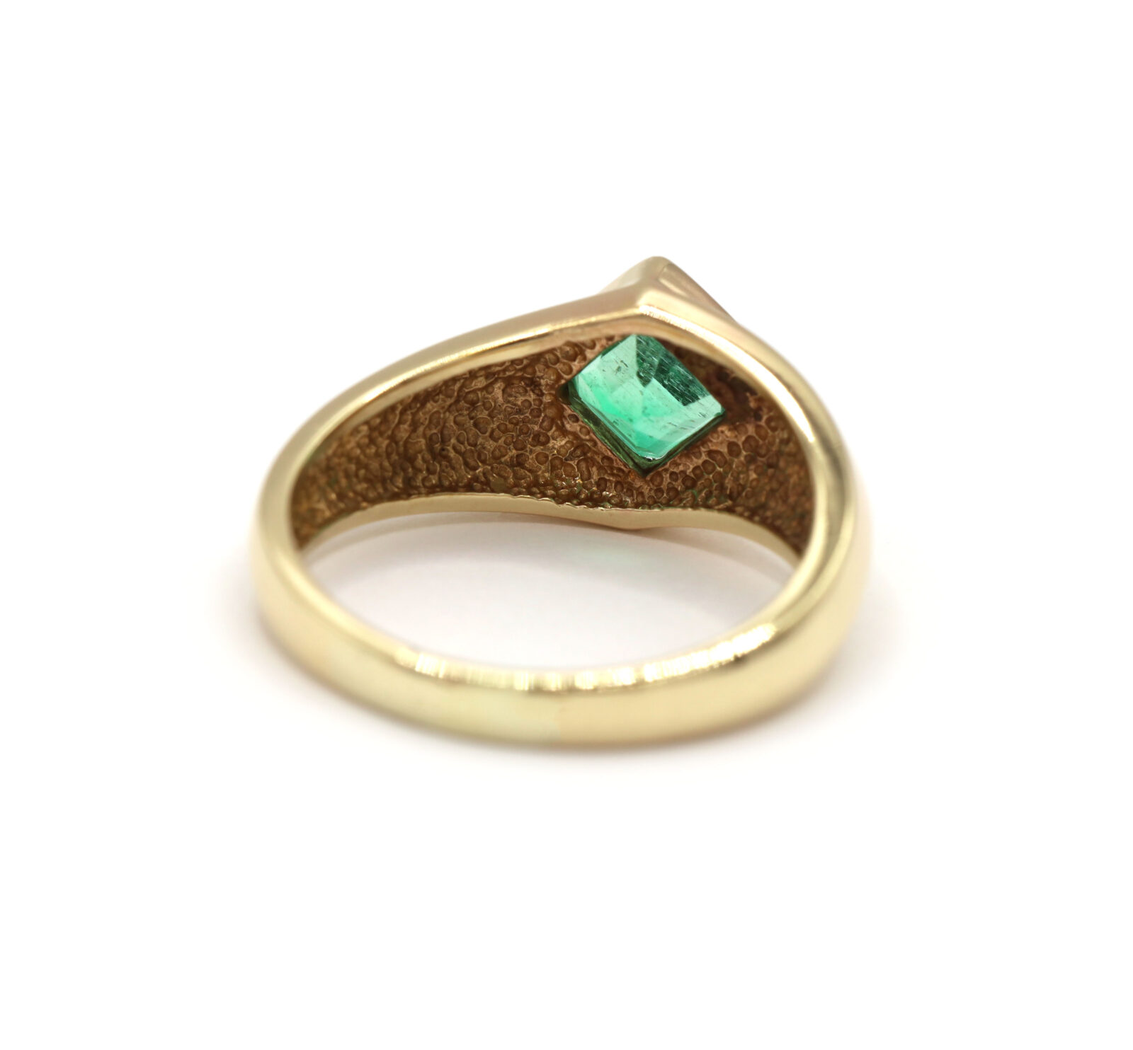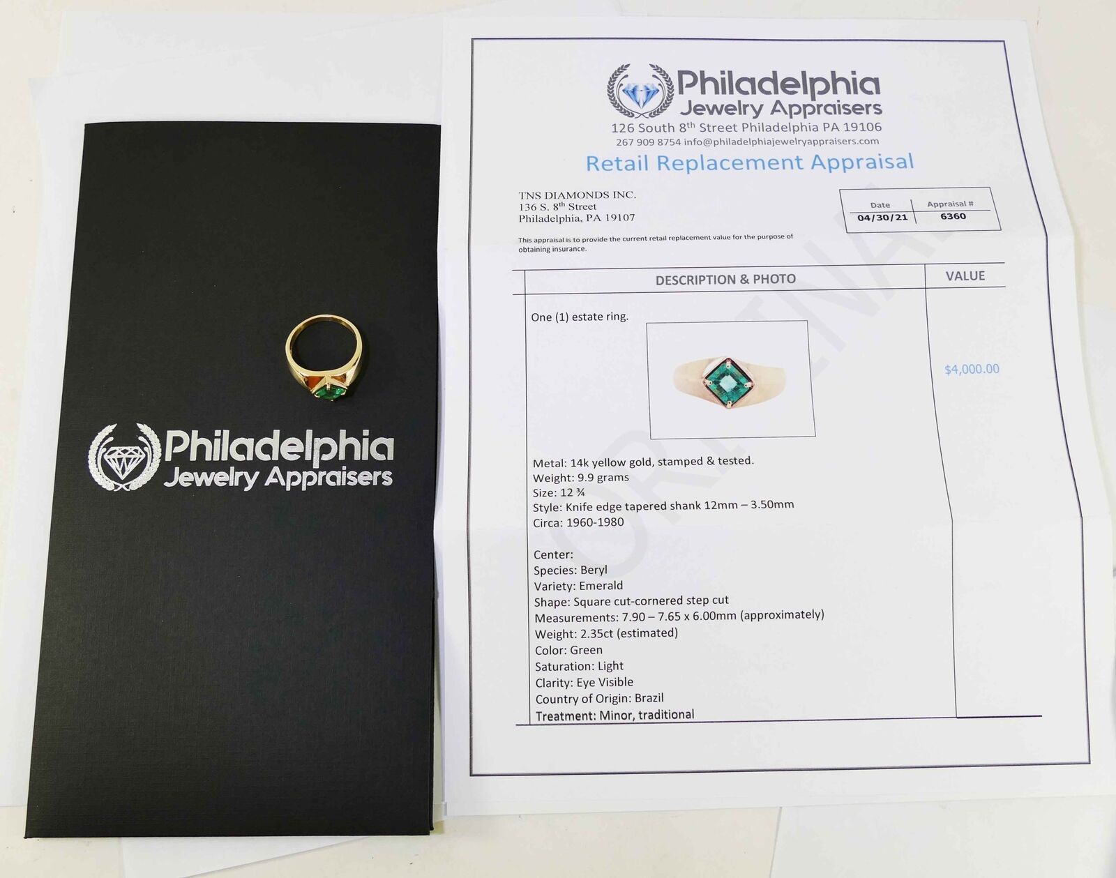This sleek men’s ring holds a light green natural Emerald. The ring is crafted in 14k yellow gold, with a knife edged tapered shank to hold the emerald securely. The emerald comes with a written jeweler’s appraisal shown in the photos. Size: 12.75 Material: 14...