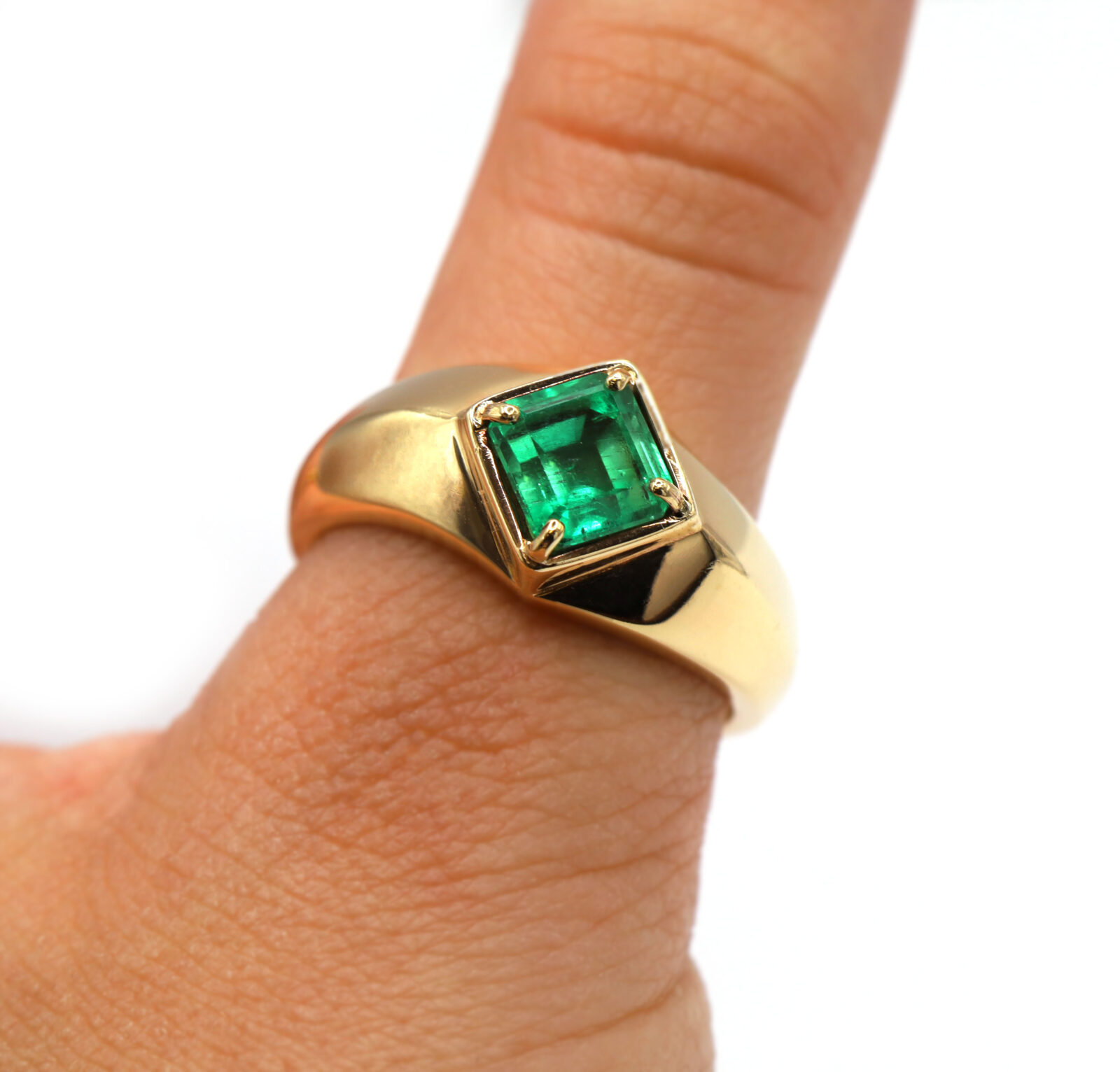 Read Morethis sleek men’s ring holds a light green natural emerald. The ring is crafted in 14k yellow gold, with a knife edged tapered shank to hold the emerald securely. The emerald comes with a written jeweler’s appraisal shown in the photos. Size: 12.75 material: 14k yellow gold gemstone: natural emerald gemstone carat weight: 2.35 carat cut: square cut cornered step cut color: green ring weight: 9.9 grams width of band: 3.2mm