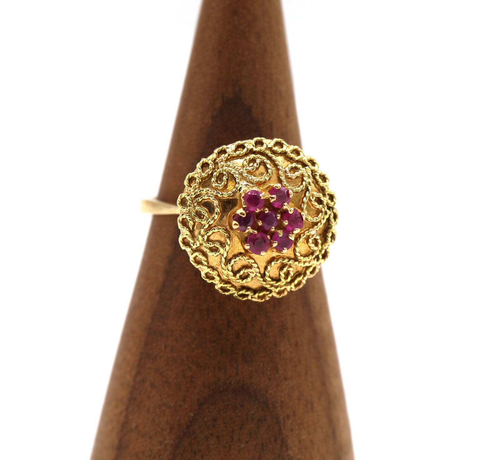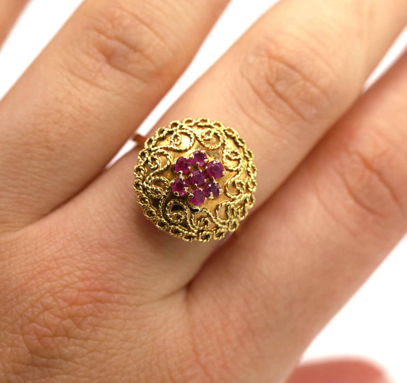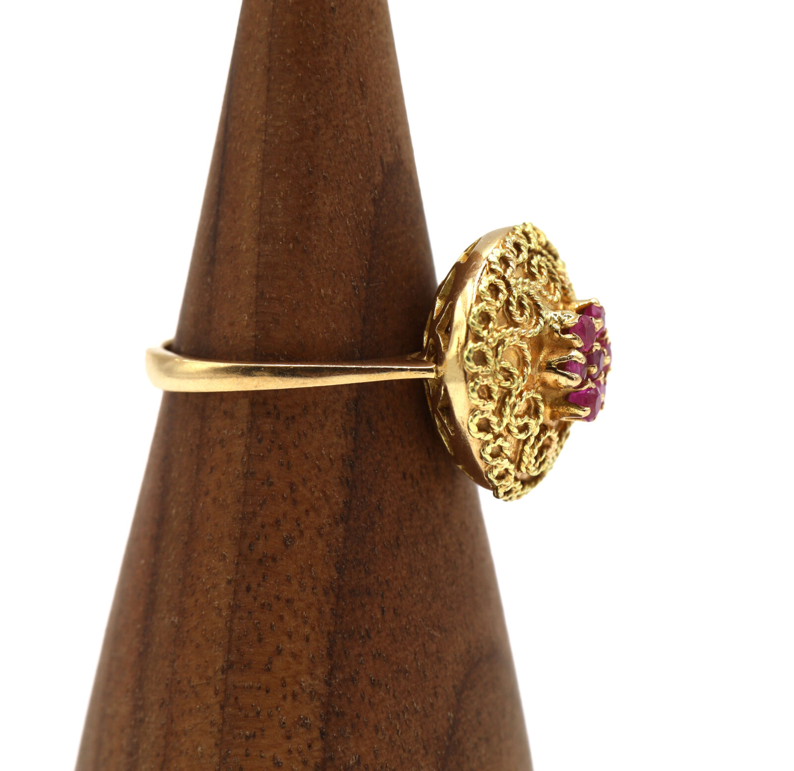 Material: 22k Yellow Gold Ring Size: 6.75 Width of Back: 2mm Front Width: 16.5mm Weight: 6.2 Grams Gemstone: Ruby Cut: Round Brilliant