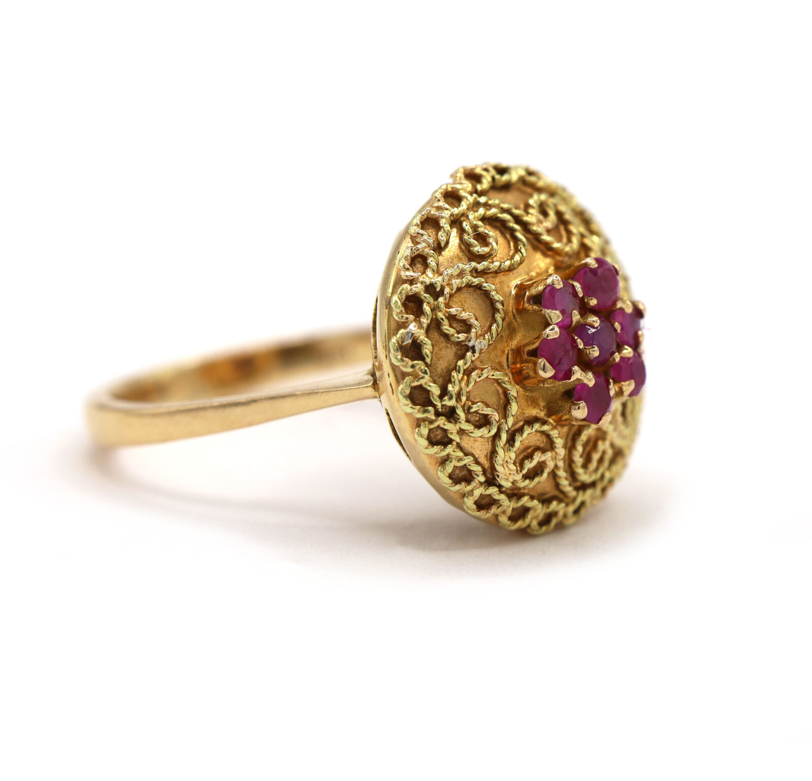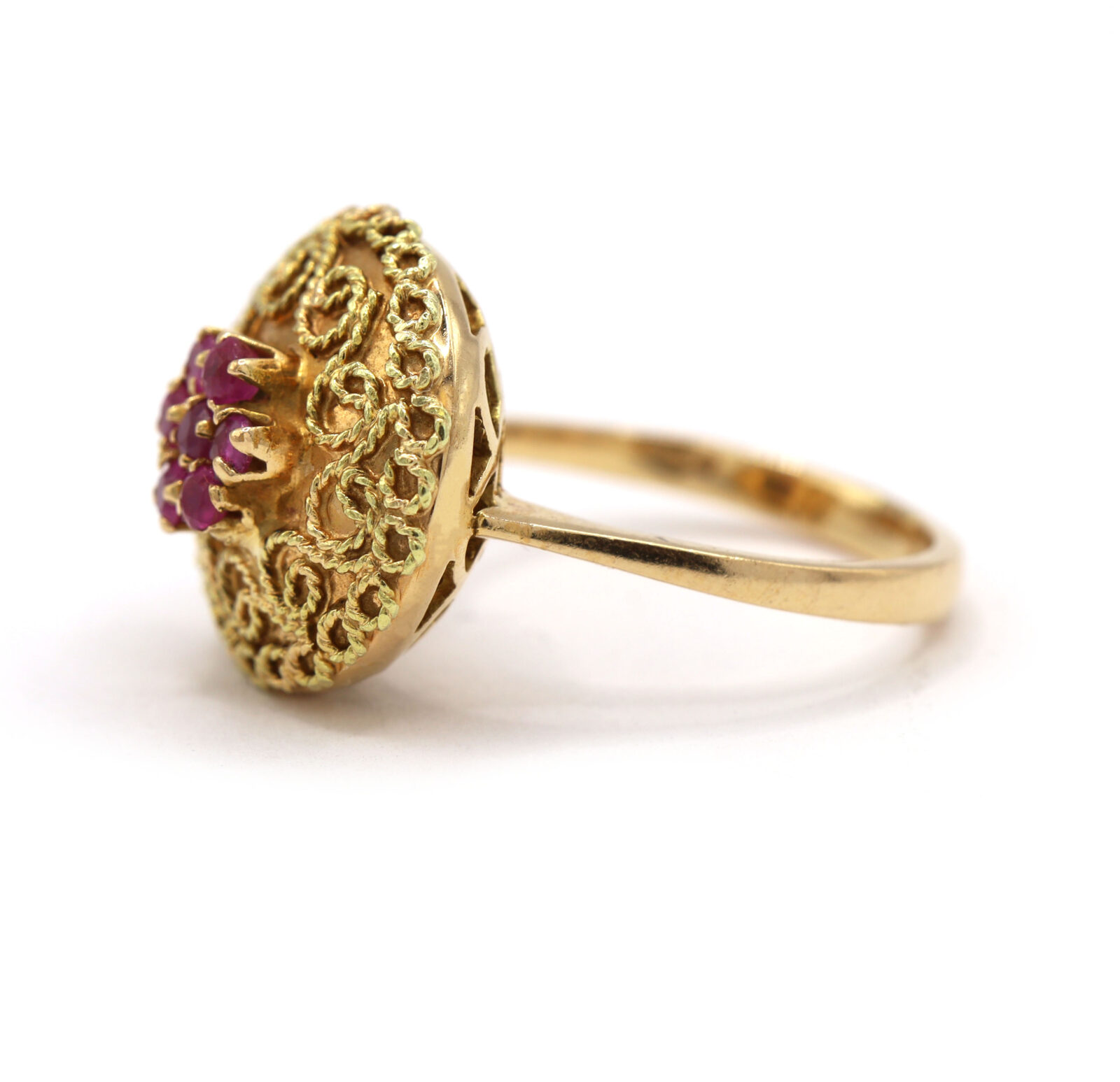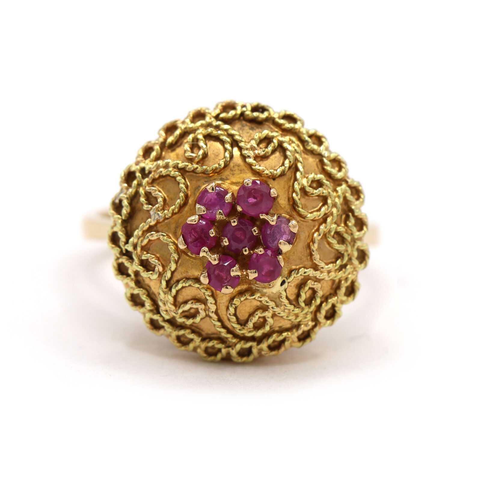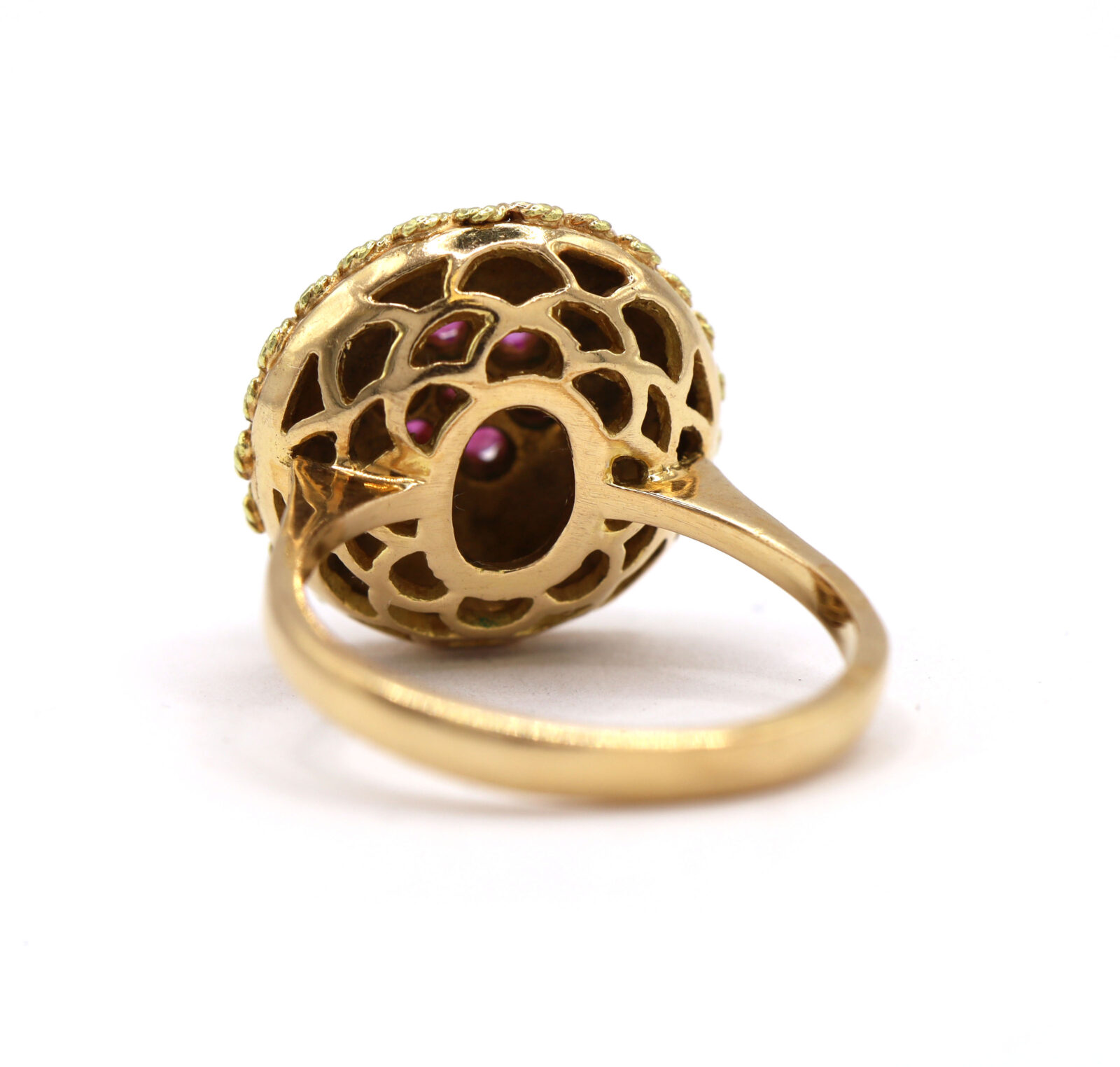Material: 22k Yellow Gold Ring Size: 6.75 Width of Back: 2mm Front Width: 16.5mm Weight: 6.2 Grams Gemstone: Ruby Cut: Round Brilliant