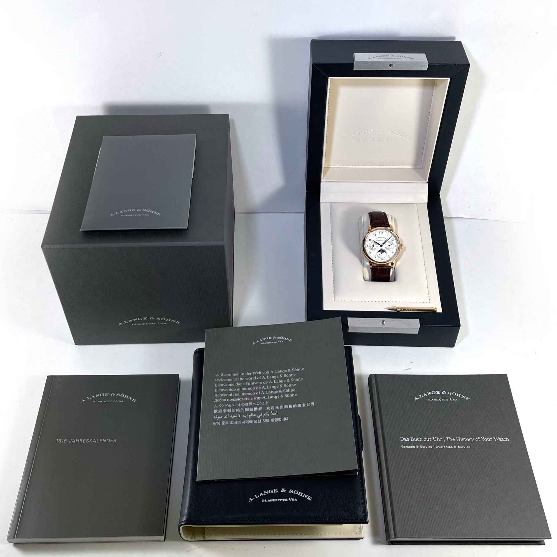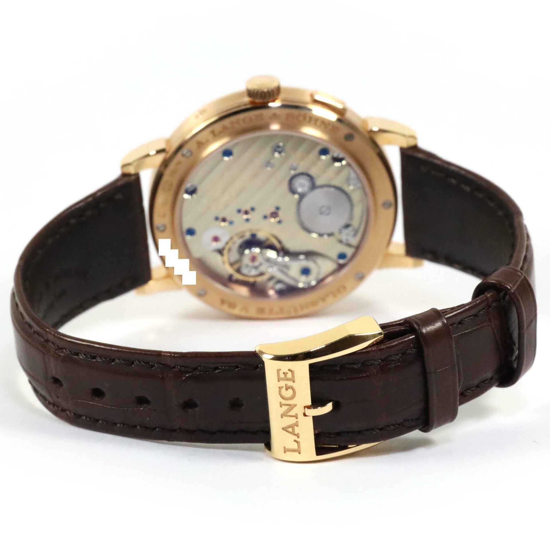 This A. Lange watch is new and comes with its microfiber cloth, box, booklets, and warranty booklet dated 2022 as shown in the pictures attached. This watch features a silver dial surrounding an 18k rose gold case on a le...