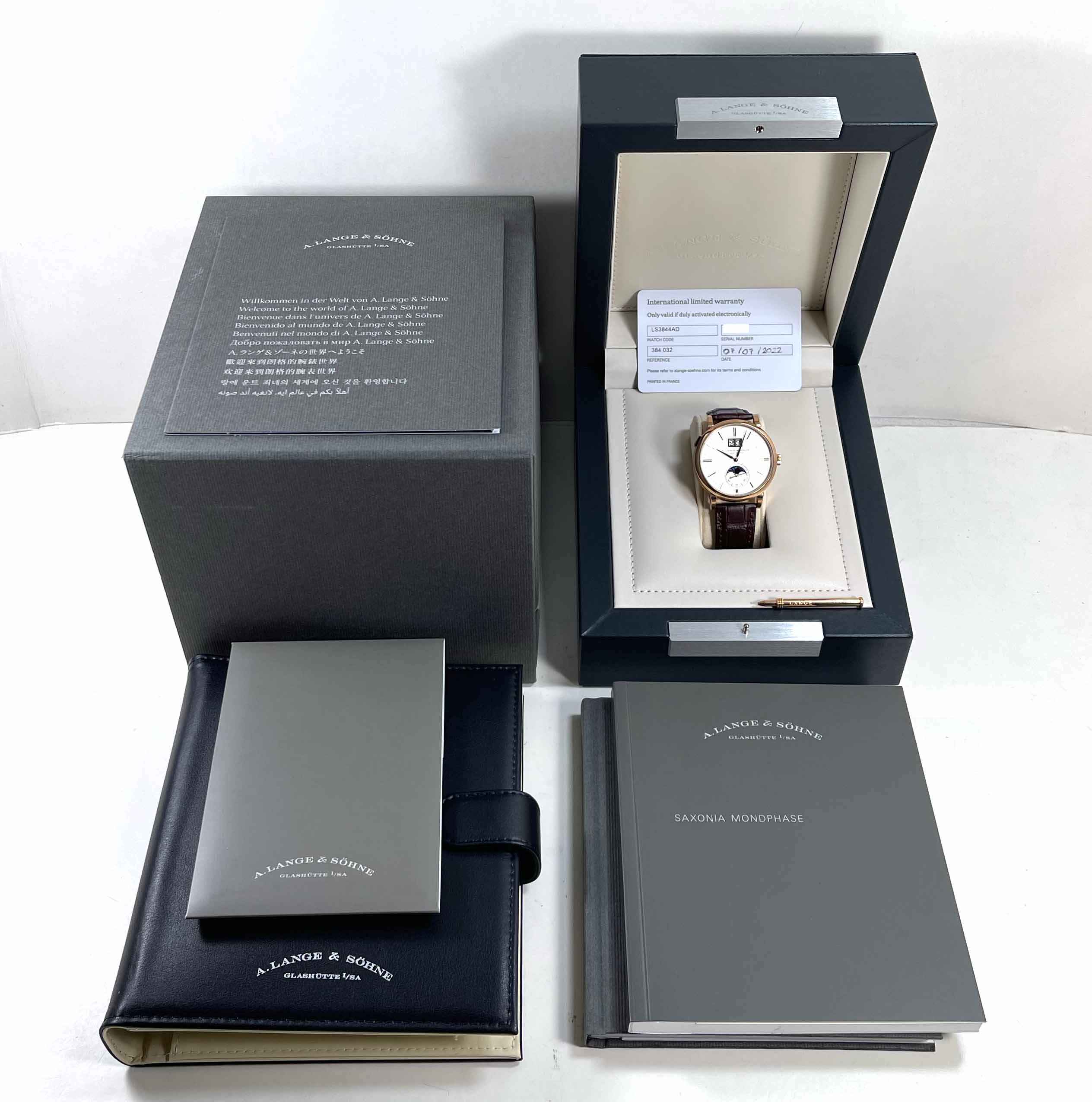 Read Morethis a. Lange saxonia is new with stickers on the case and comes with its box, papers, a. Lange tool, microfiber cloth, and warranty card dated july 7th, 2022. This watch features a 40mm 18k rose gold case that surrounds a silver dial displaying the a.lange outsize date and moon phase and comes on a brown leather strap. this watch is in stock and available to ship immediately!