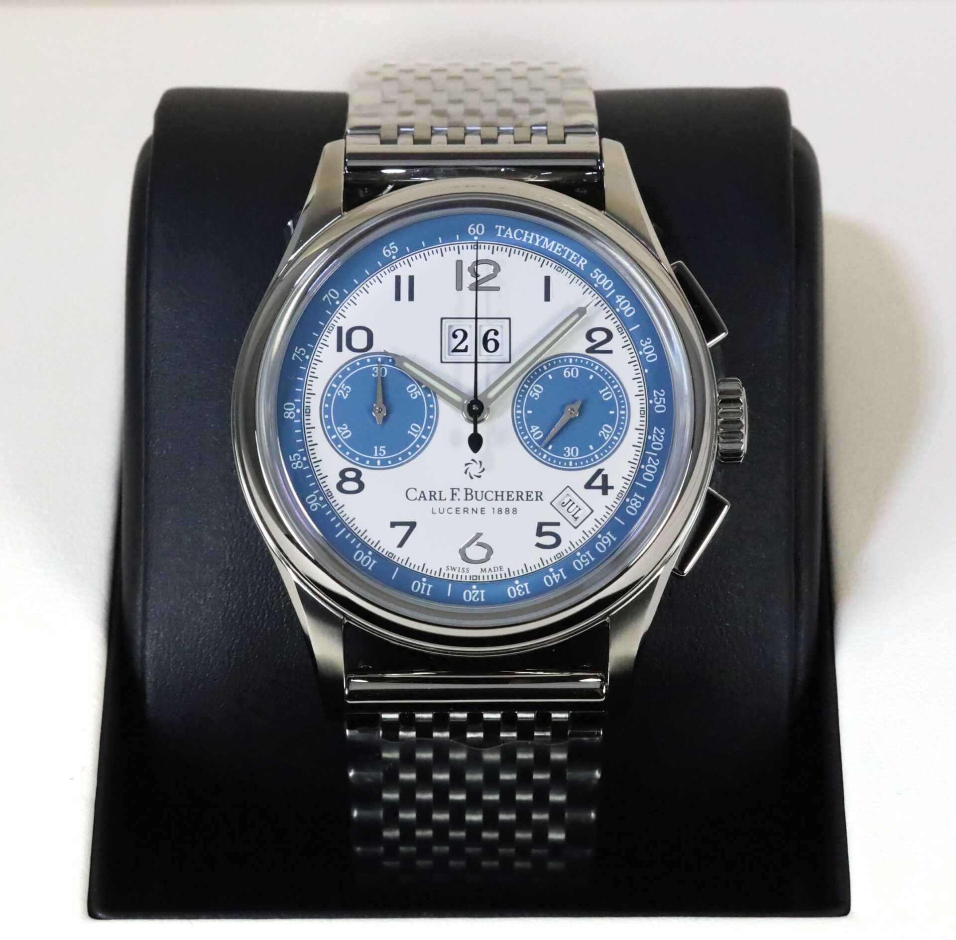 This Carl F. Bucherer watch is new with full stickers as shown in photos attached. This watch comes with box, booklets, one additional CB branded bracelet, and warranty...