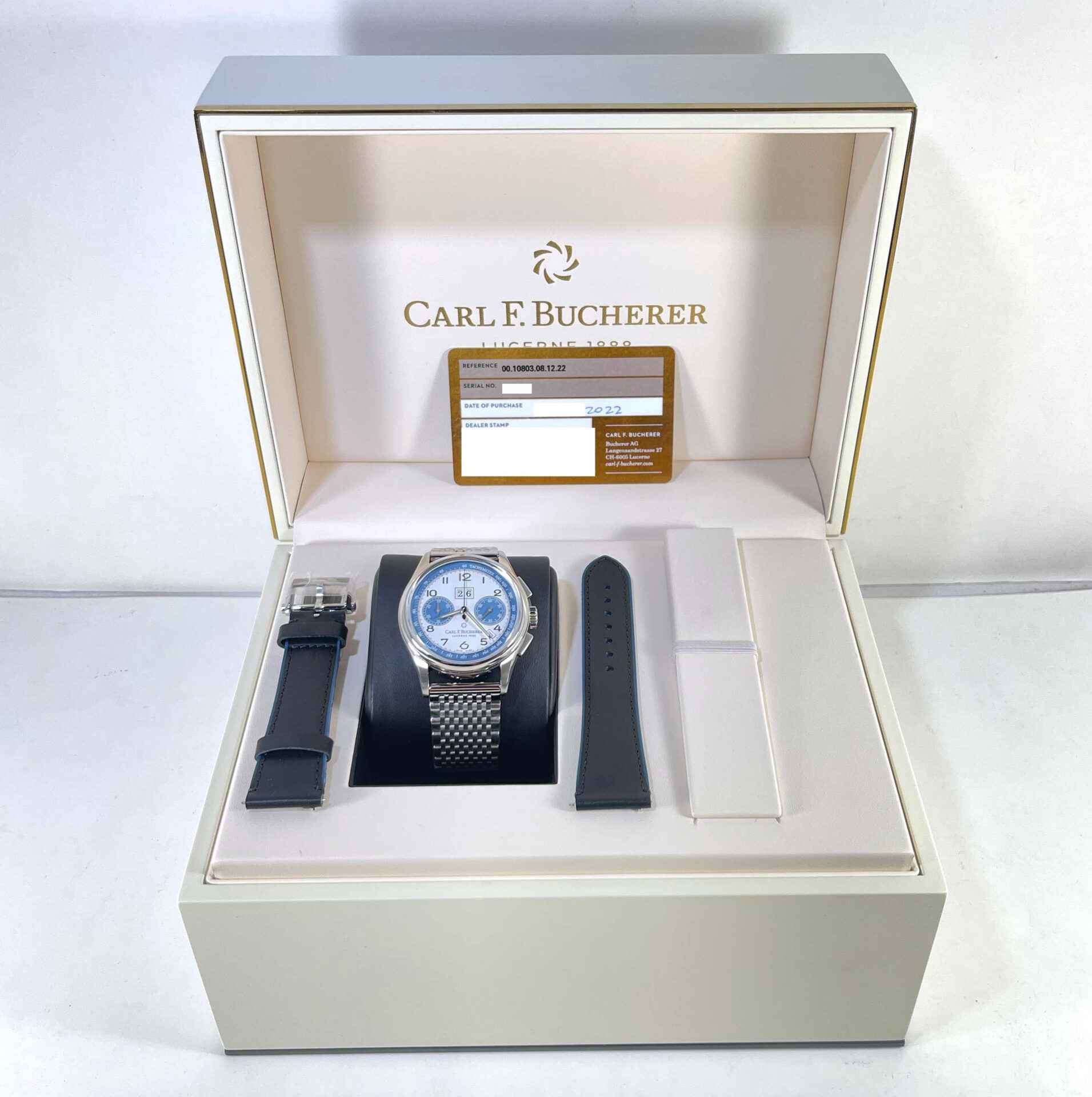 Read Morethis carl f. Bucherer watch is new with full stickers as shown in photos attached. This watch comes with box, booklets, one additional cb branded bracelet, and warranty card dated 2022. this watch is in stock and available to ship immediately!