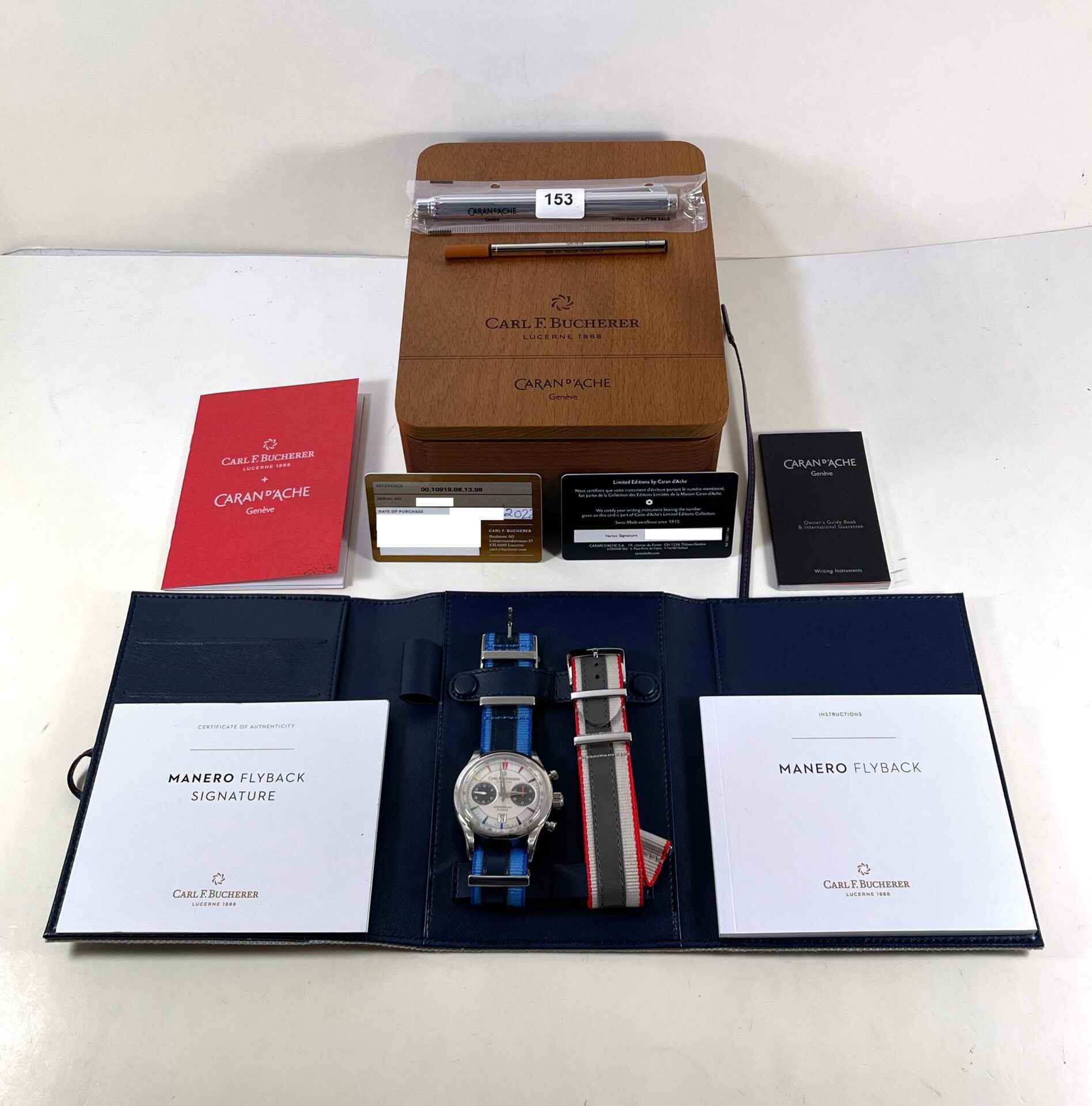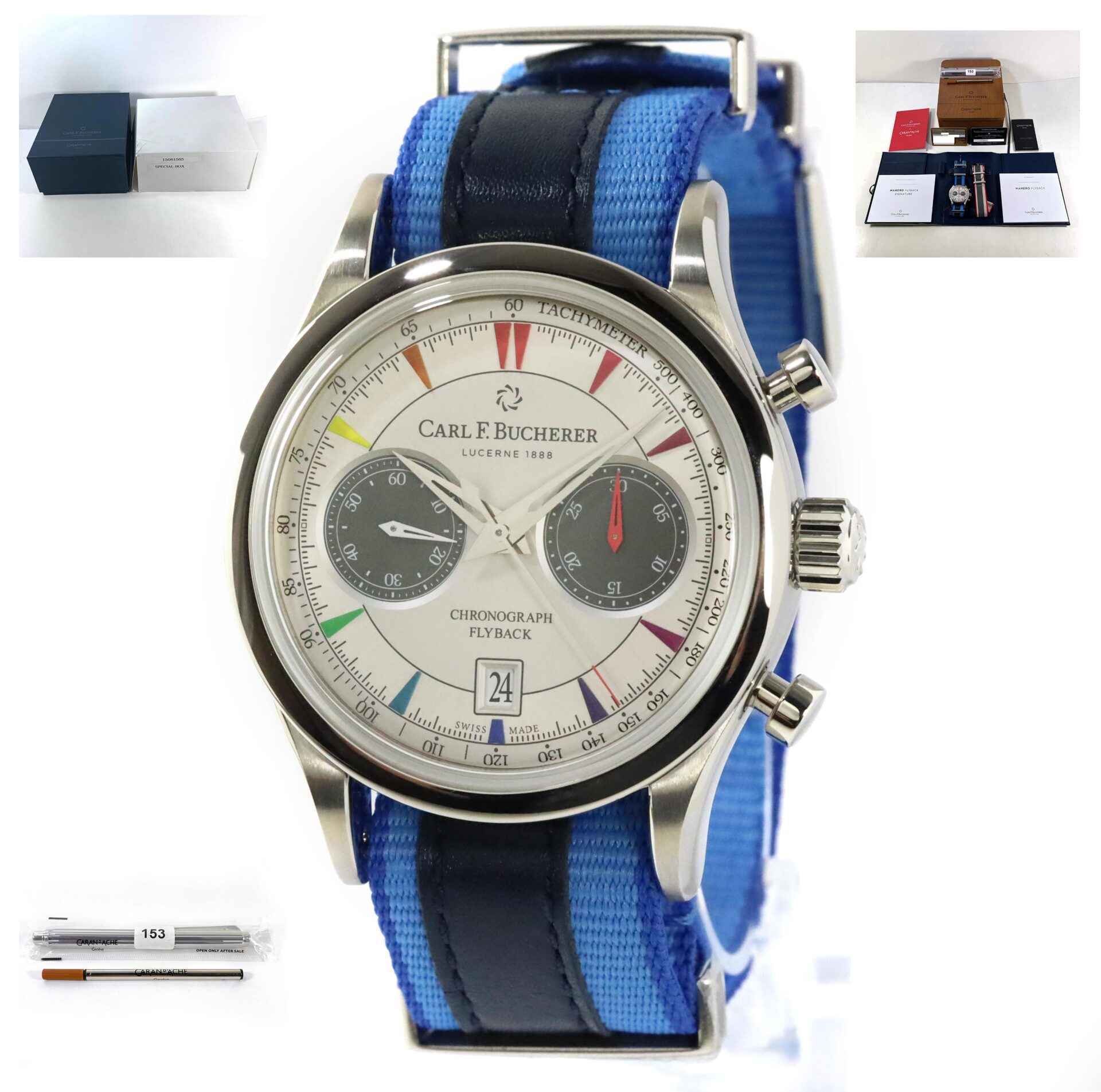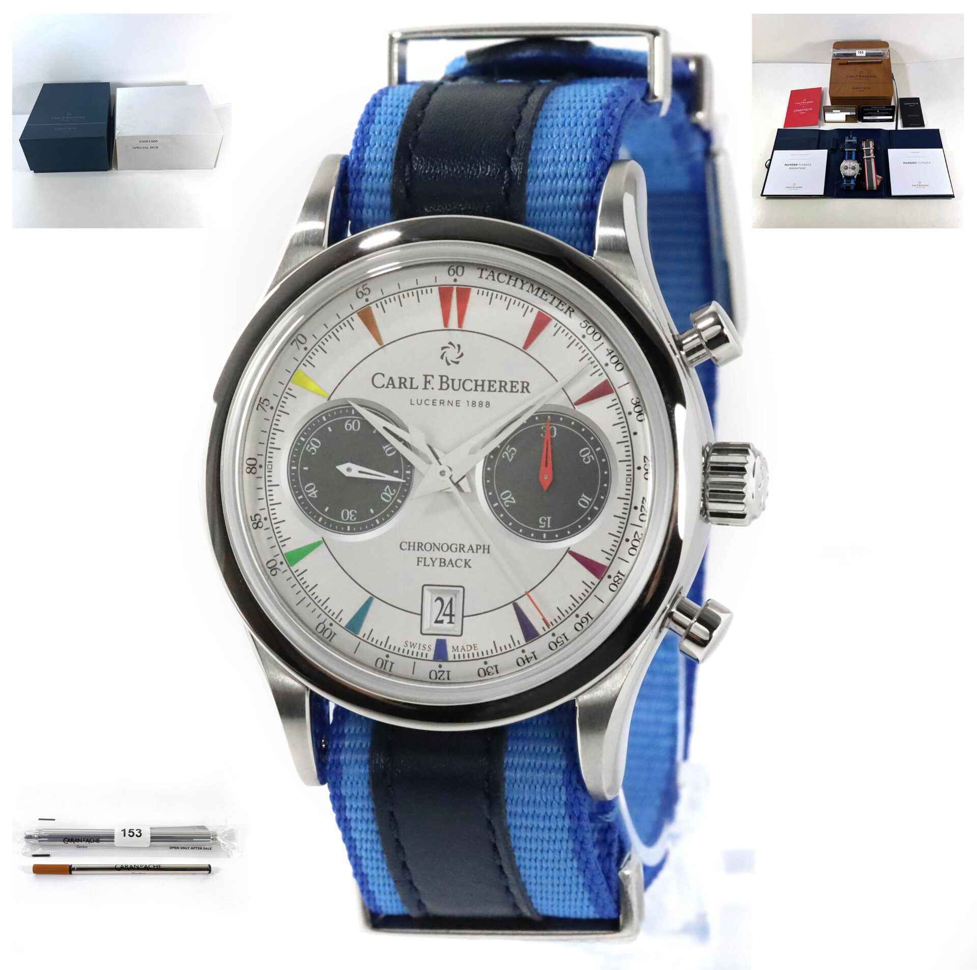 Read Morethis carl f. Bucherer watch is new and has stickers still on the bracelet as shown in photos attached. This watch comes with box, booklets, one additional strap, travel case, caran d’ache signature rollerball pen equipped with a black rollerball cartridge, and warranty cards dated 2022. this watch is in stock and available to ship immediately!