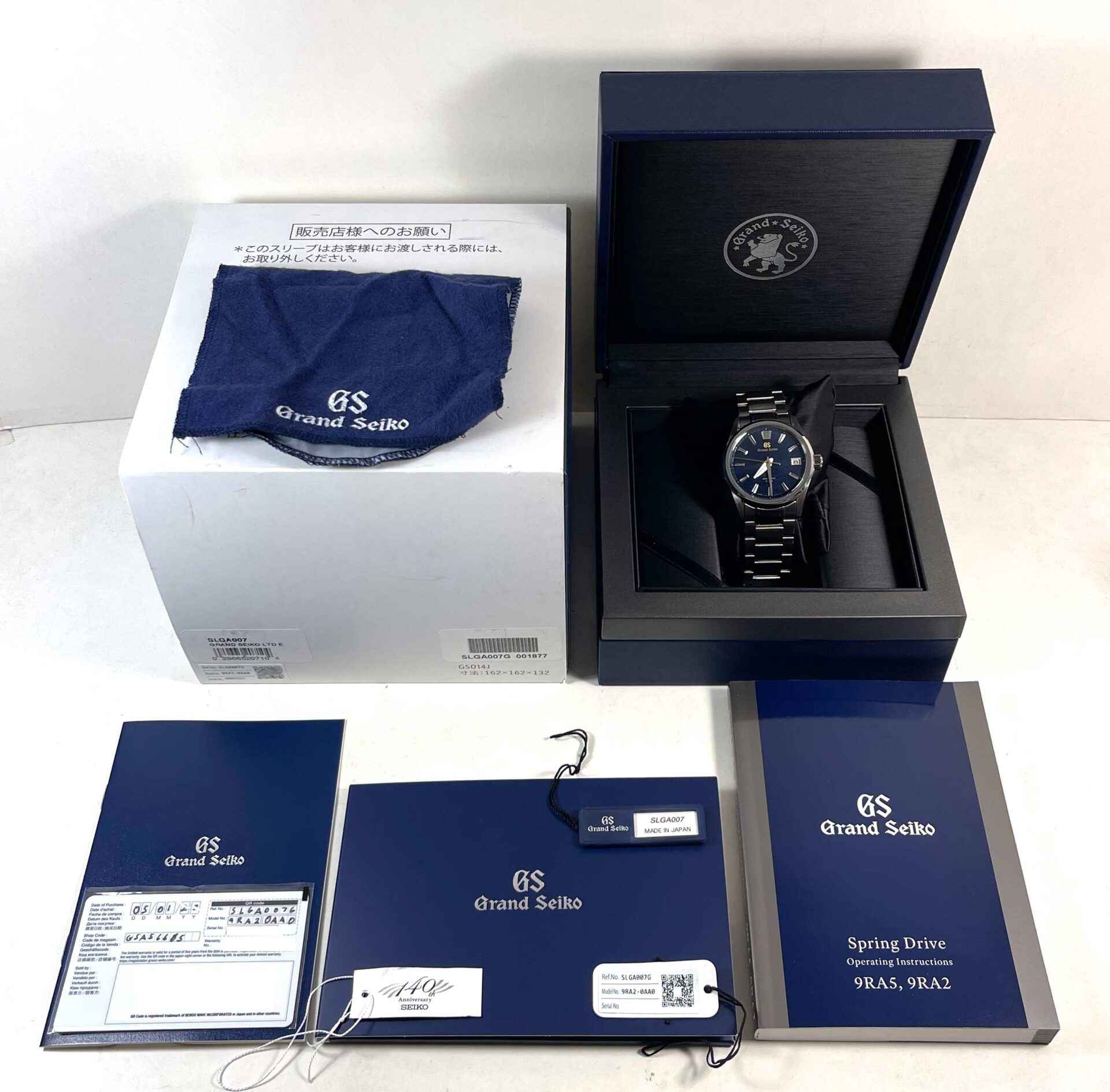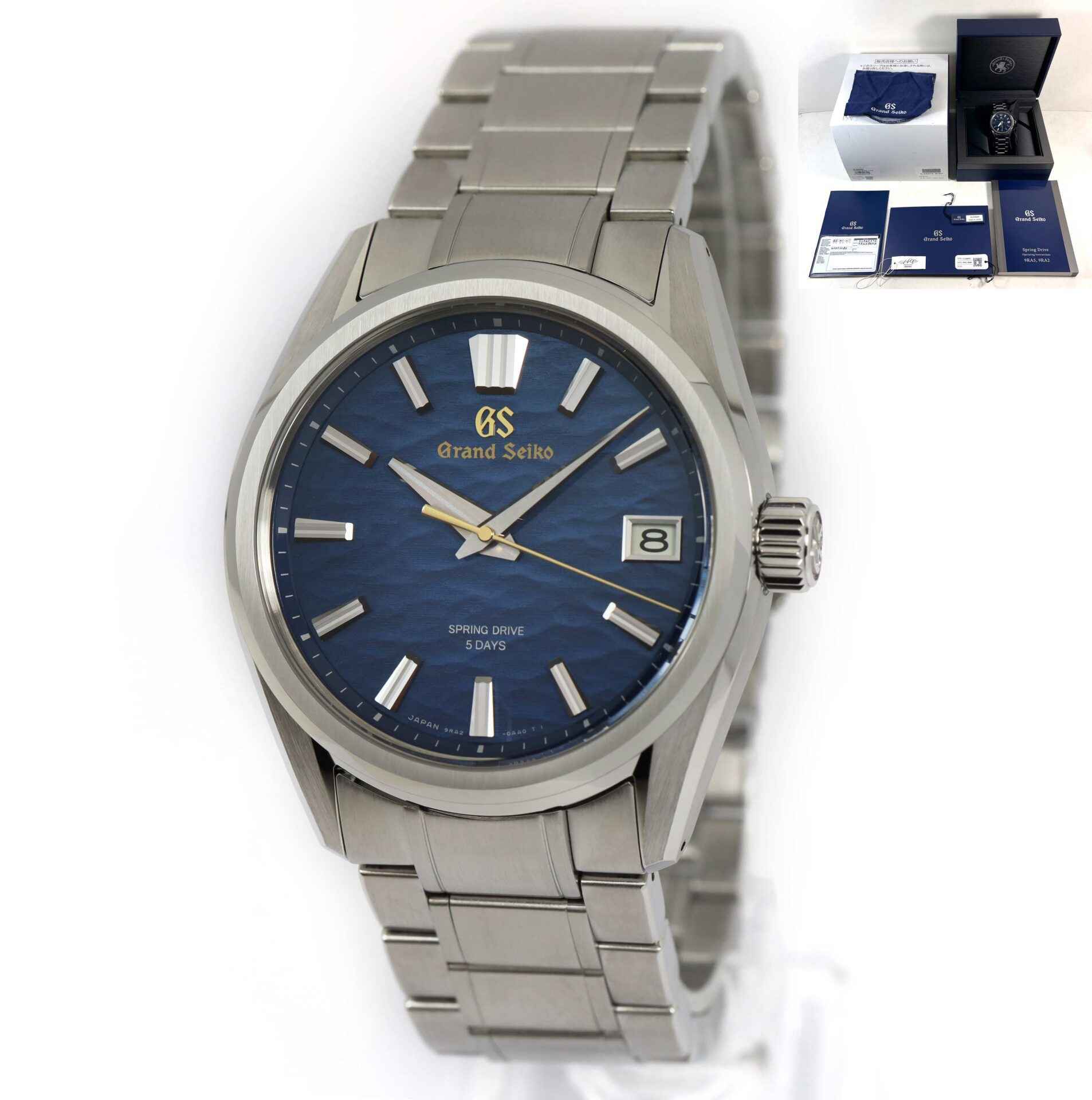 This Grand Seiko watch is new and comes with its box, booklets, hang tags, and warranty card dated January 5th, 2022. This watch features a 40mm stainless steel case that surrounds a blue patterned dial and comes on a st...