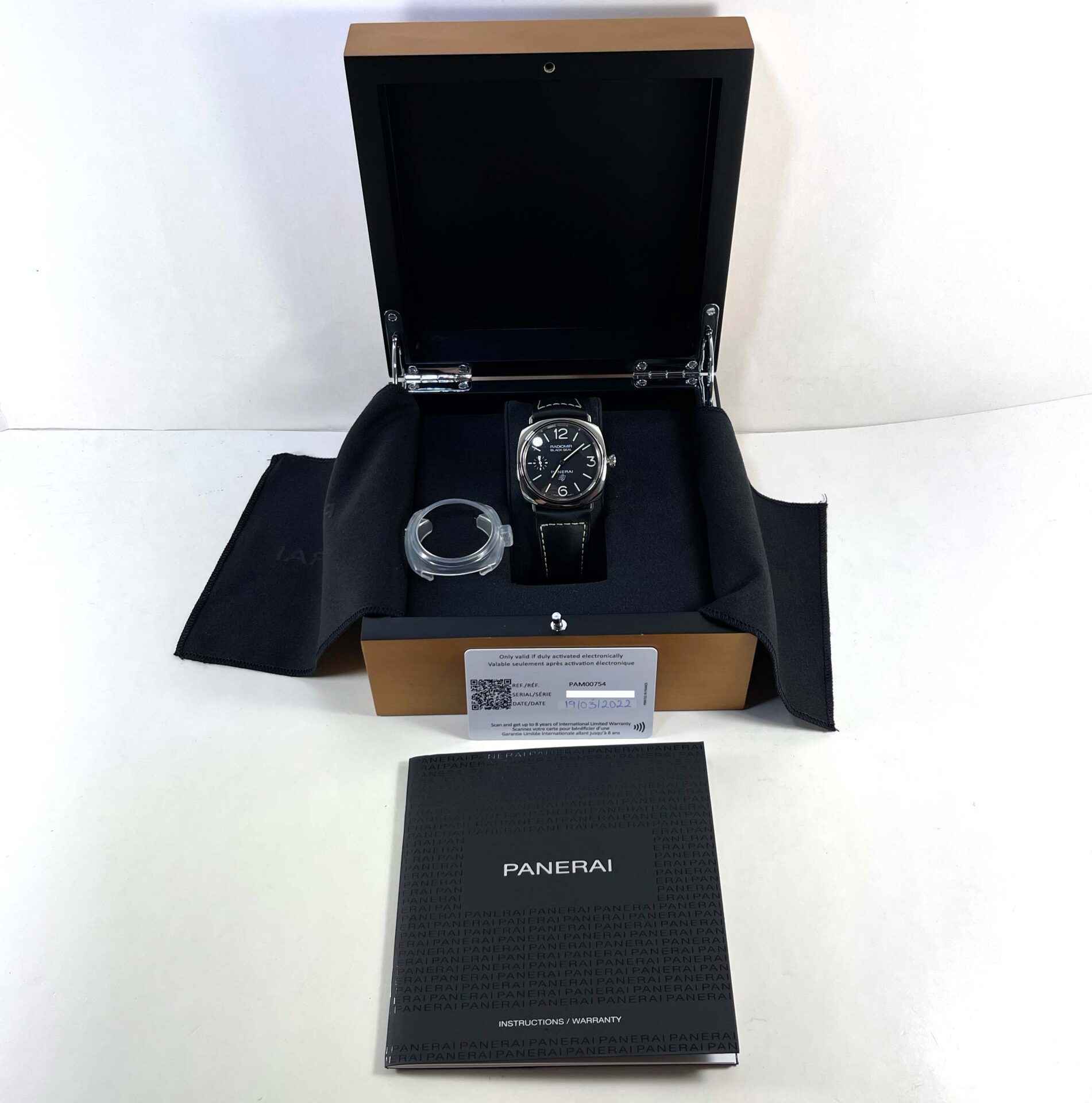 this panerai is new and comes with box, papers, bezel protector, and warranty card dated for 2022. This panerai is in stock and available to ship immediately!