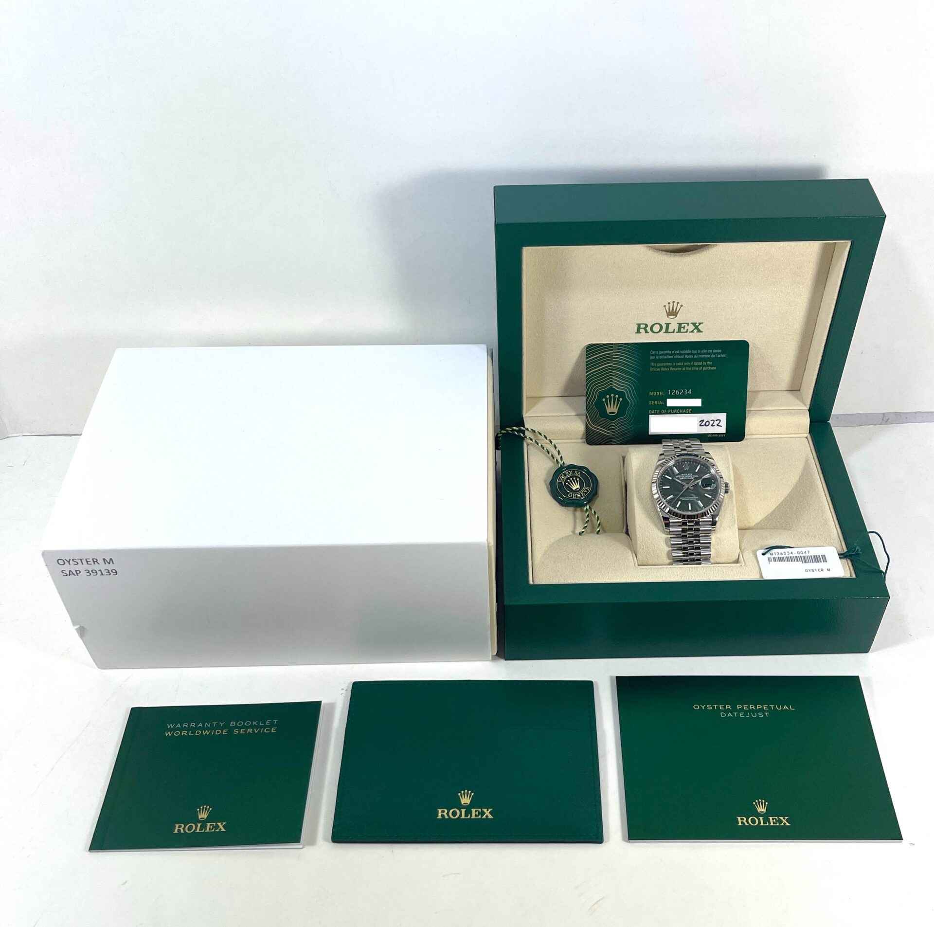 Read Morethis rolex is new and comes with box, papers, hang tags, and warranty card dated may 28th, 2022. This watch features a green motif palm dial with a stainless-steel fluted bezel on a steel jubilee band. This watch is in stock and available to ship immediately!