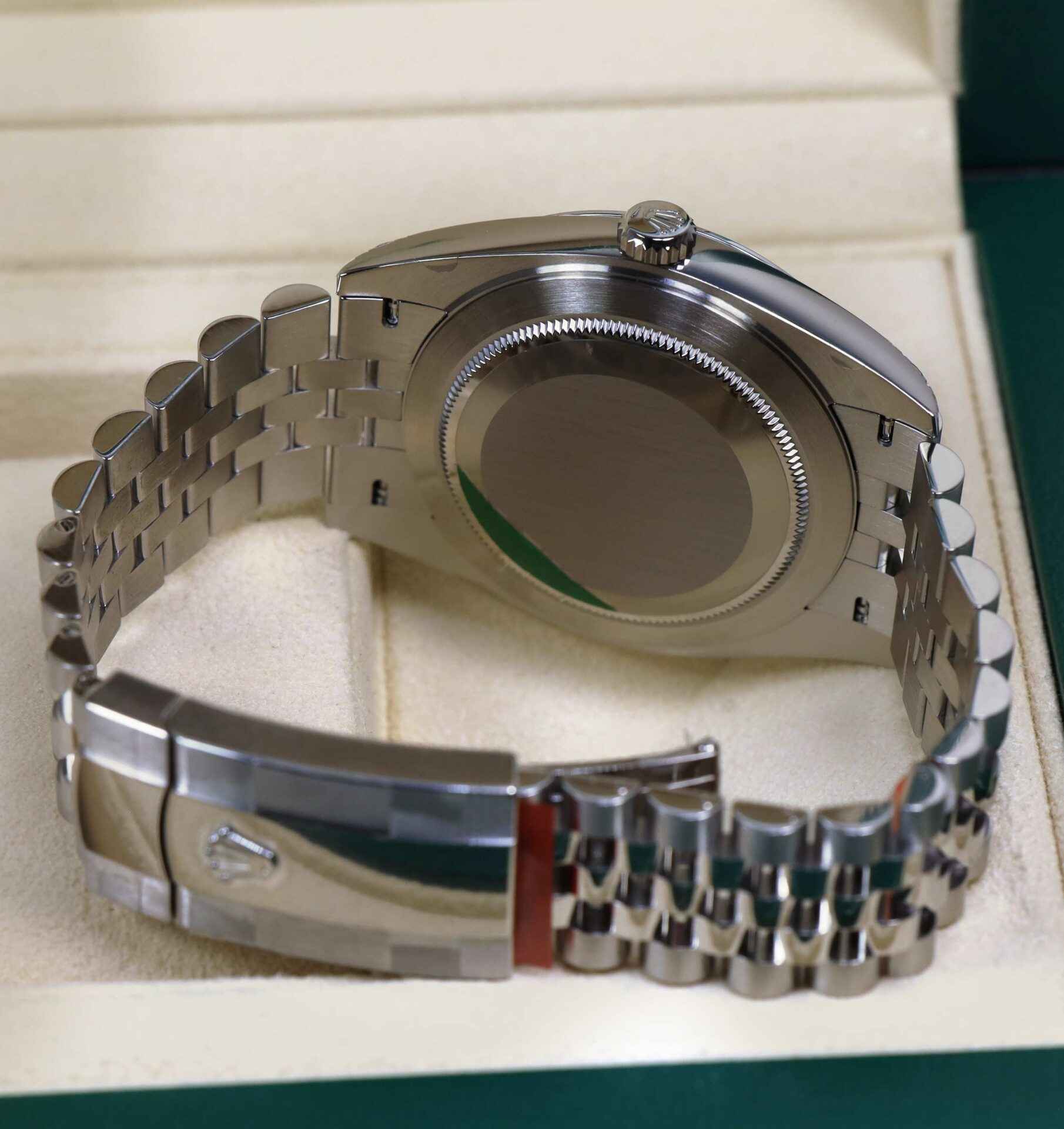 This Rolex is new and comes with box, papers, hang tags, and warranty card dated May 28th, 2022. This watch features a Green Motif Palm Dial with a stainless-steel fluted bezel on a steel jubilee band. This watch is in st...