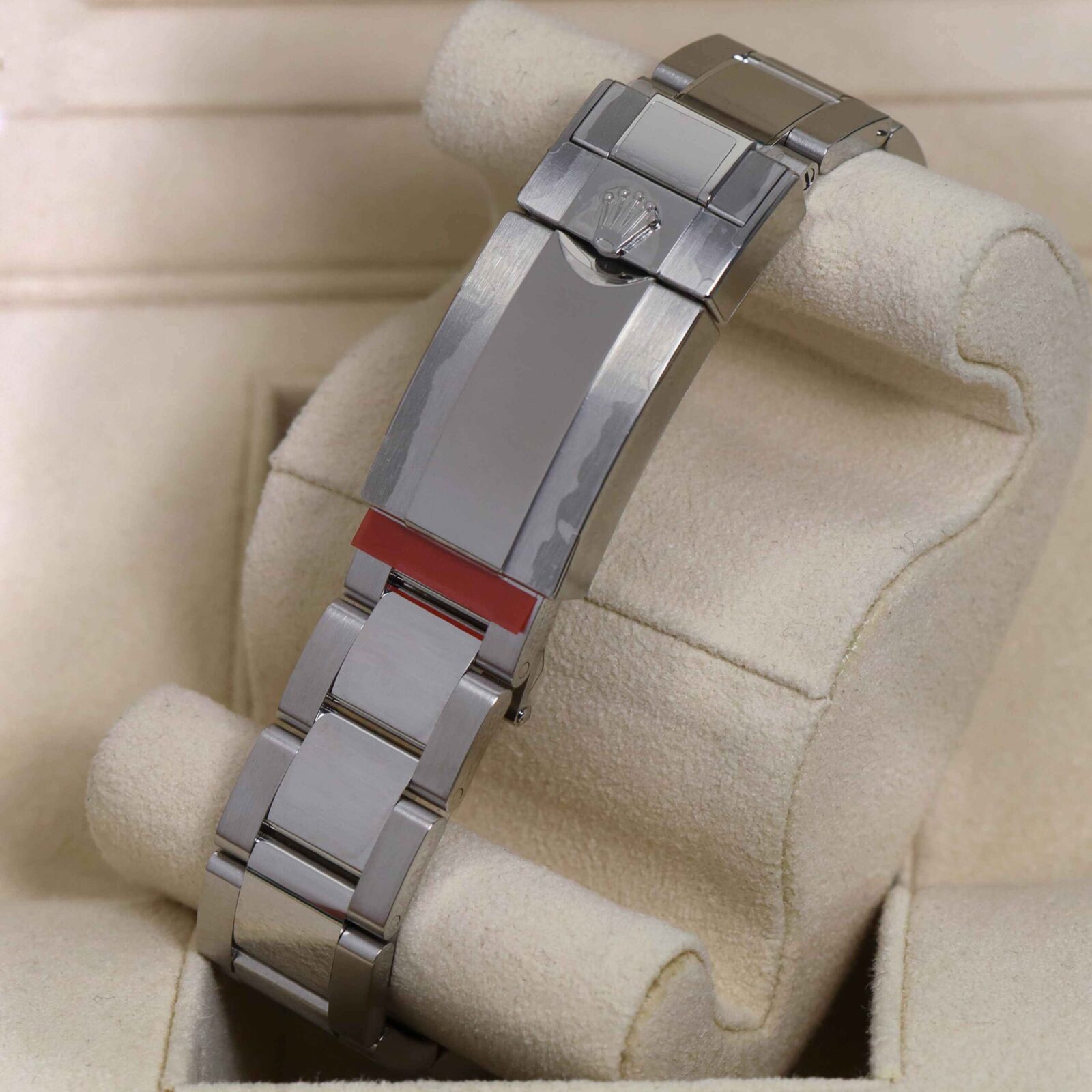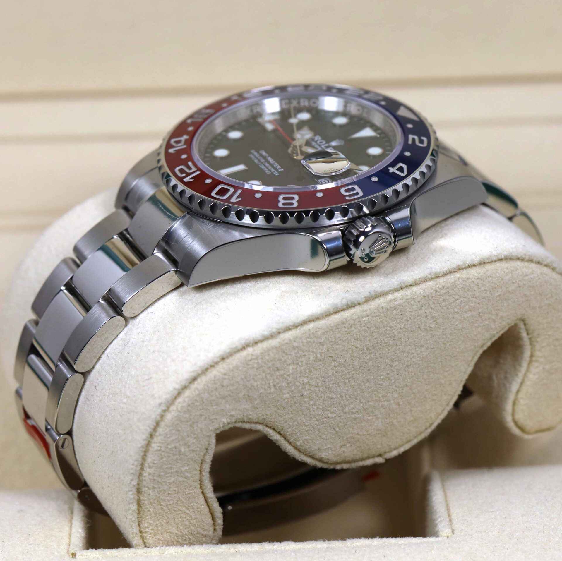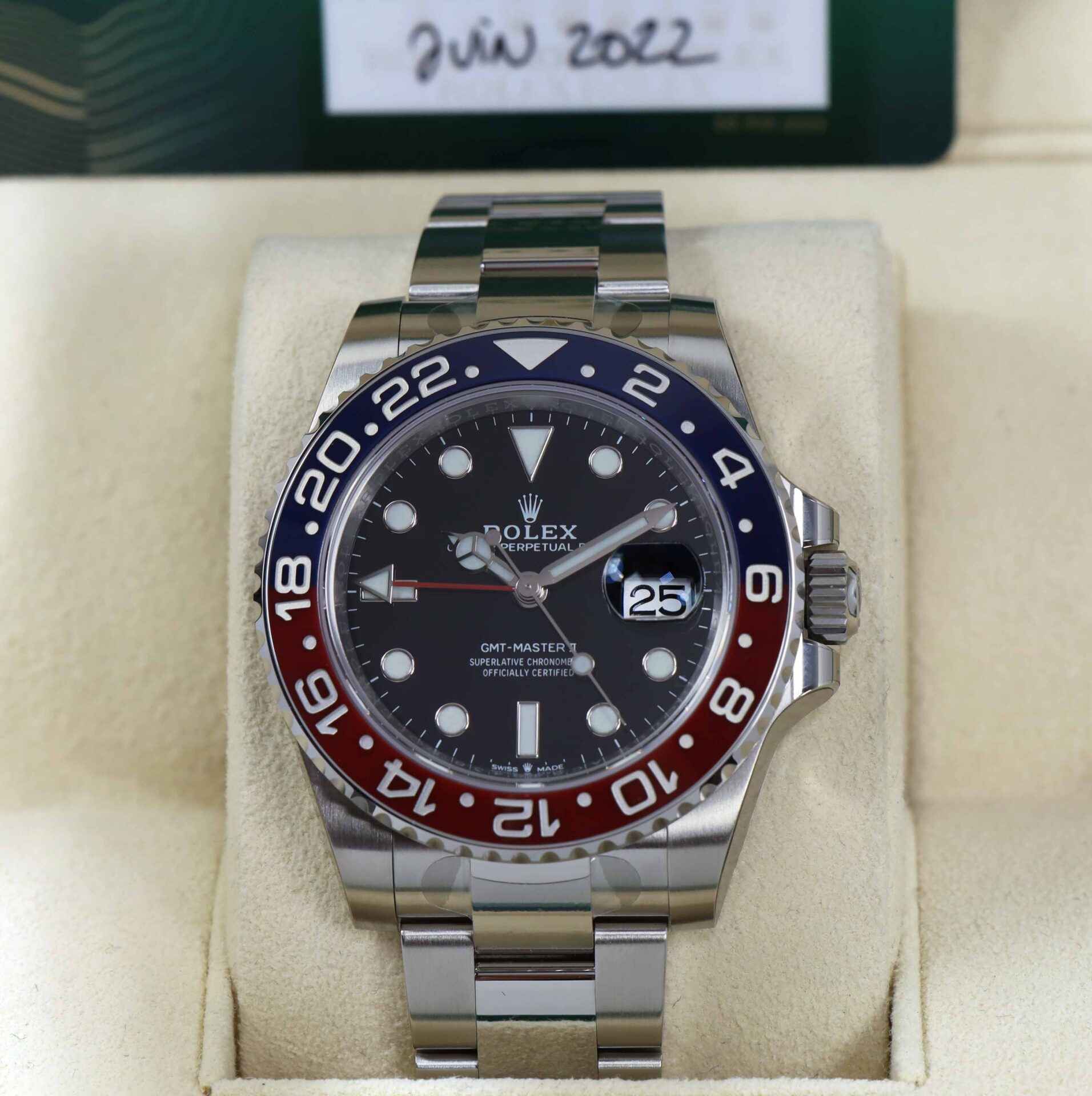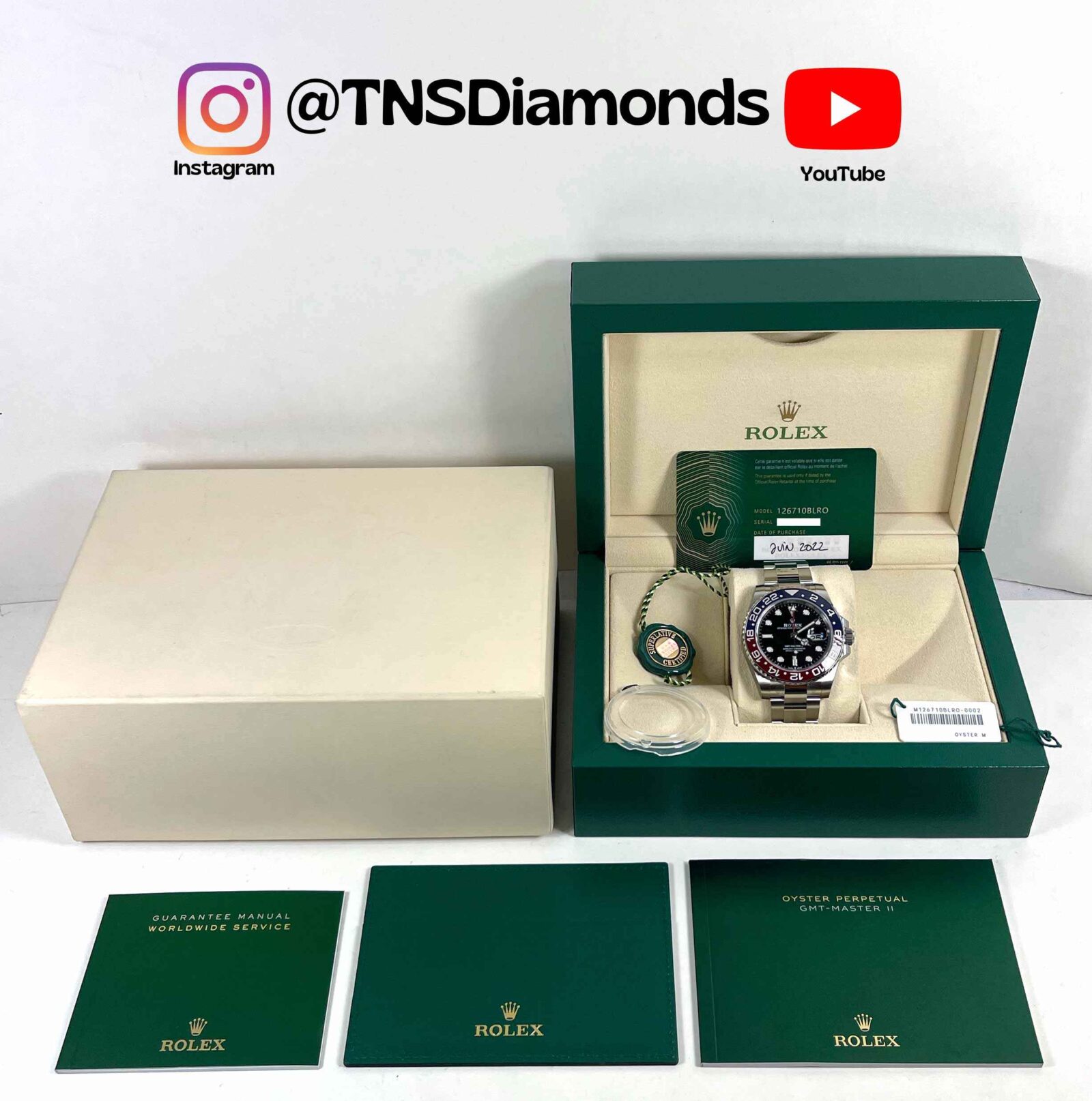This Rolex Pepsi is new with full stickers and comes with box, papers, hang tags, bezel protector, and warranty card dated 2022. This Rolex is in stock and available to ship immediately!
