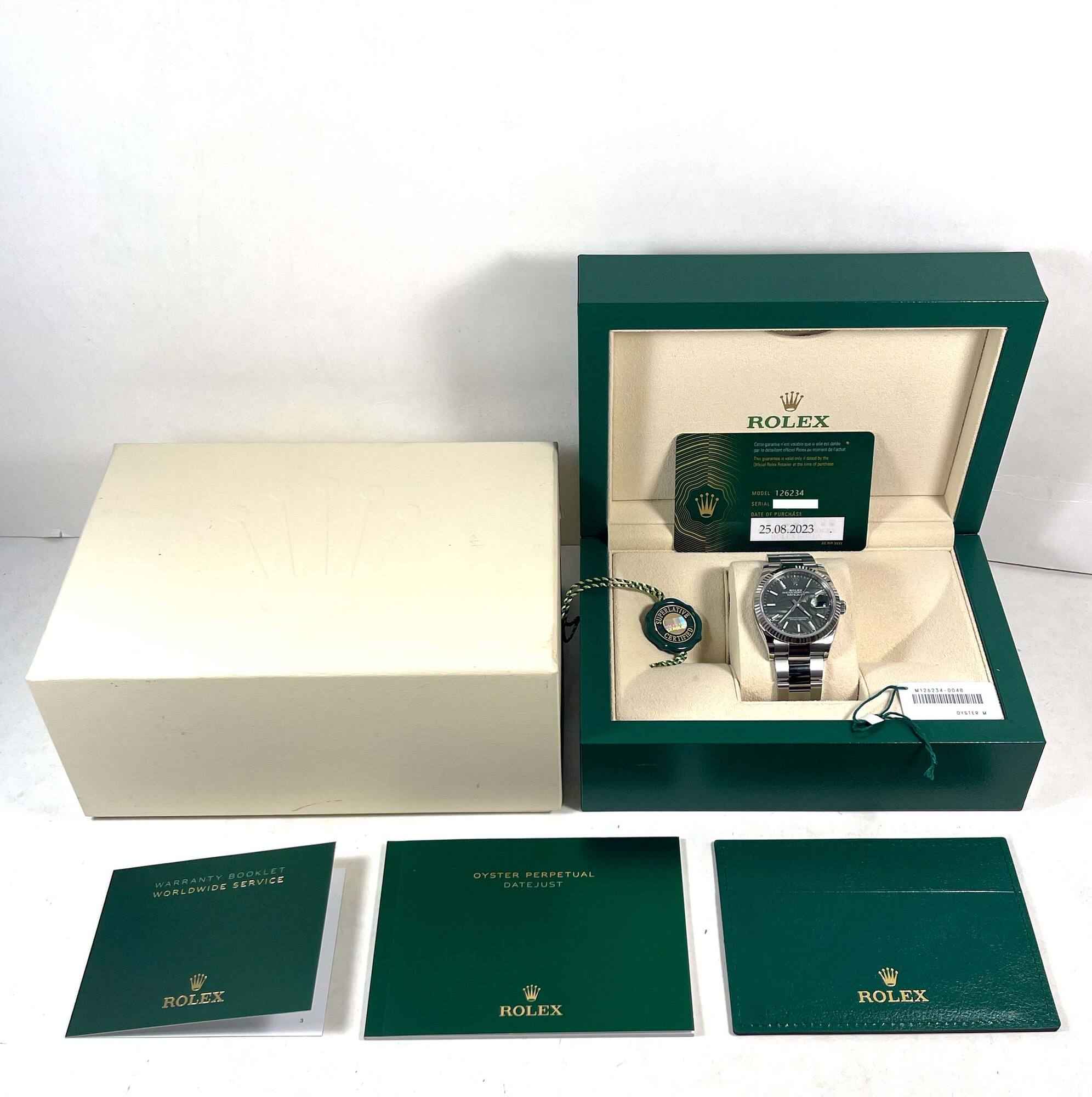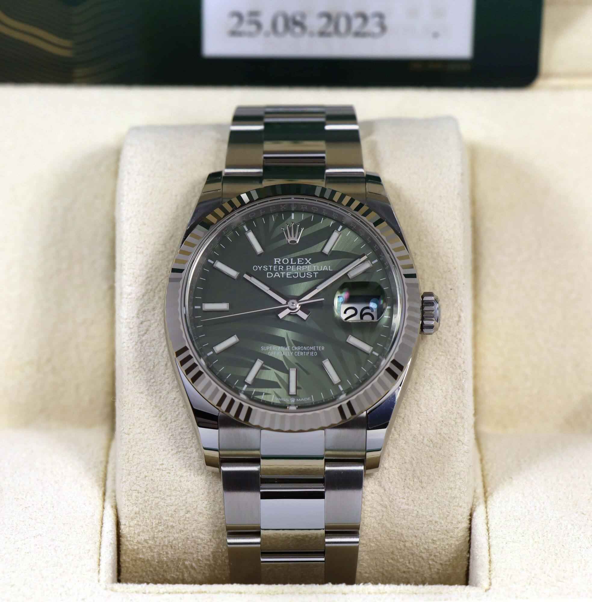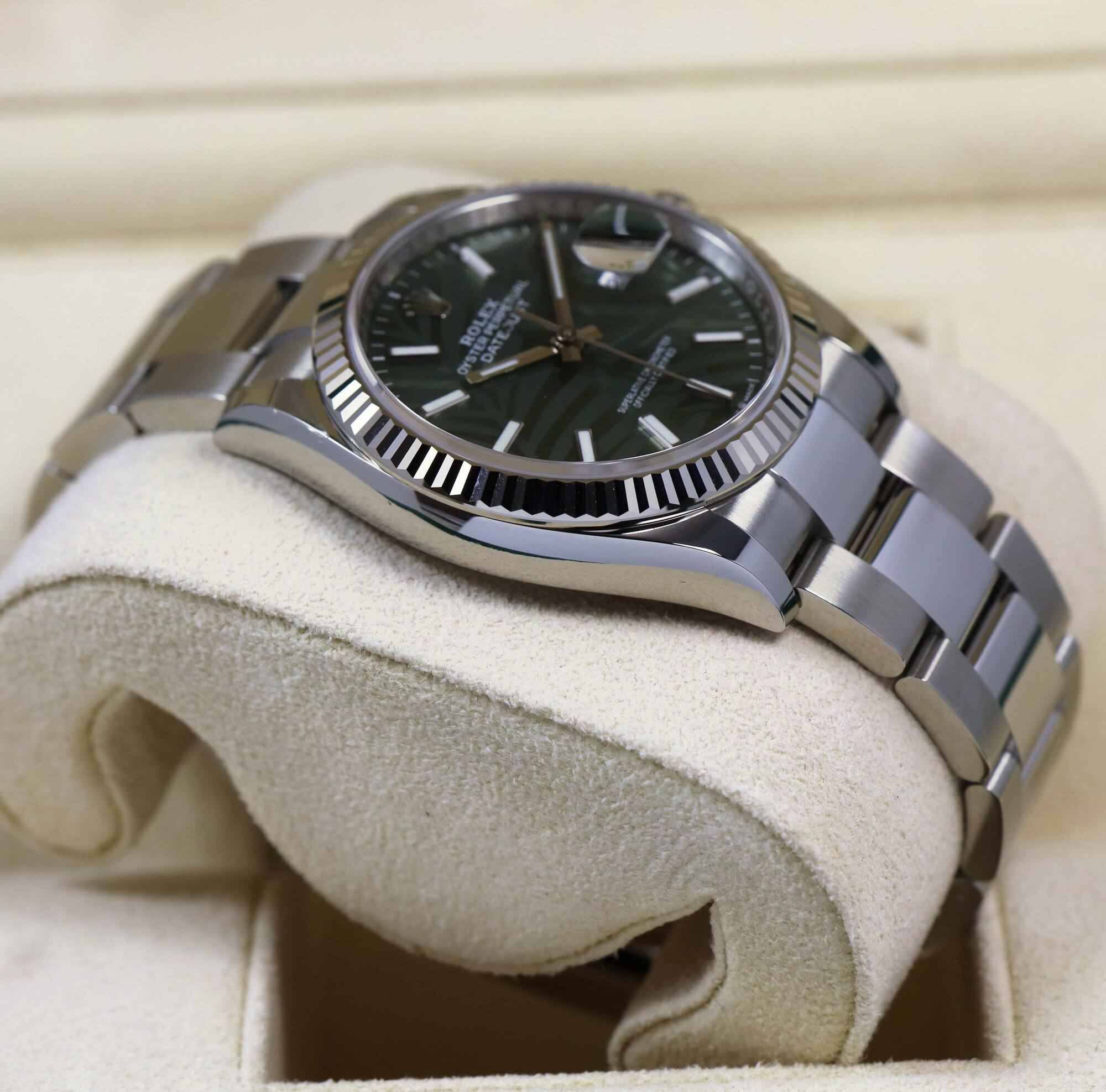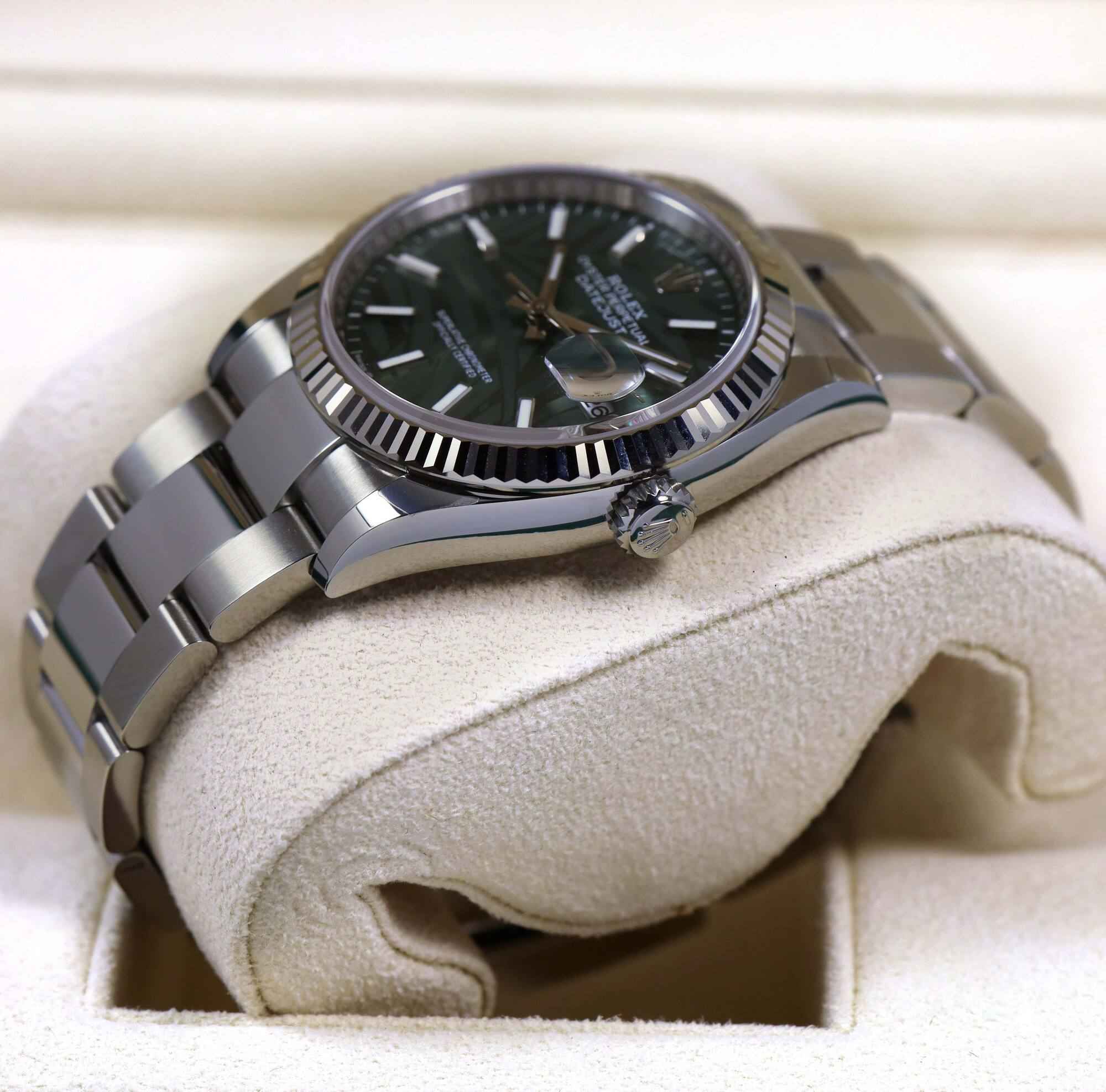 THIS ROLEX IS NEW AND COMES WITH ITS BOX, BOOKLETS, BOTH HANG TAGS, AND WARRANTY CARD DATED AUGUST 25TH, 2023 AS SHOWN IN THE PICTURES ATTACHED. THIS WATCH FEATURES A 36MM STAINLESS STEEL CASE THAT SURROUNDS A GREEN MOTIF PALM DIAL WITH A FLUTED BEZEL AND C...