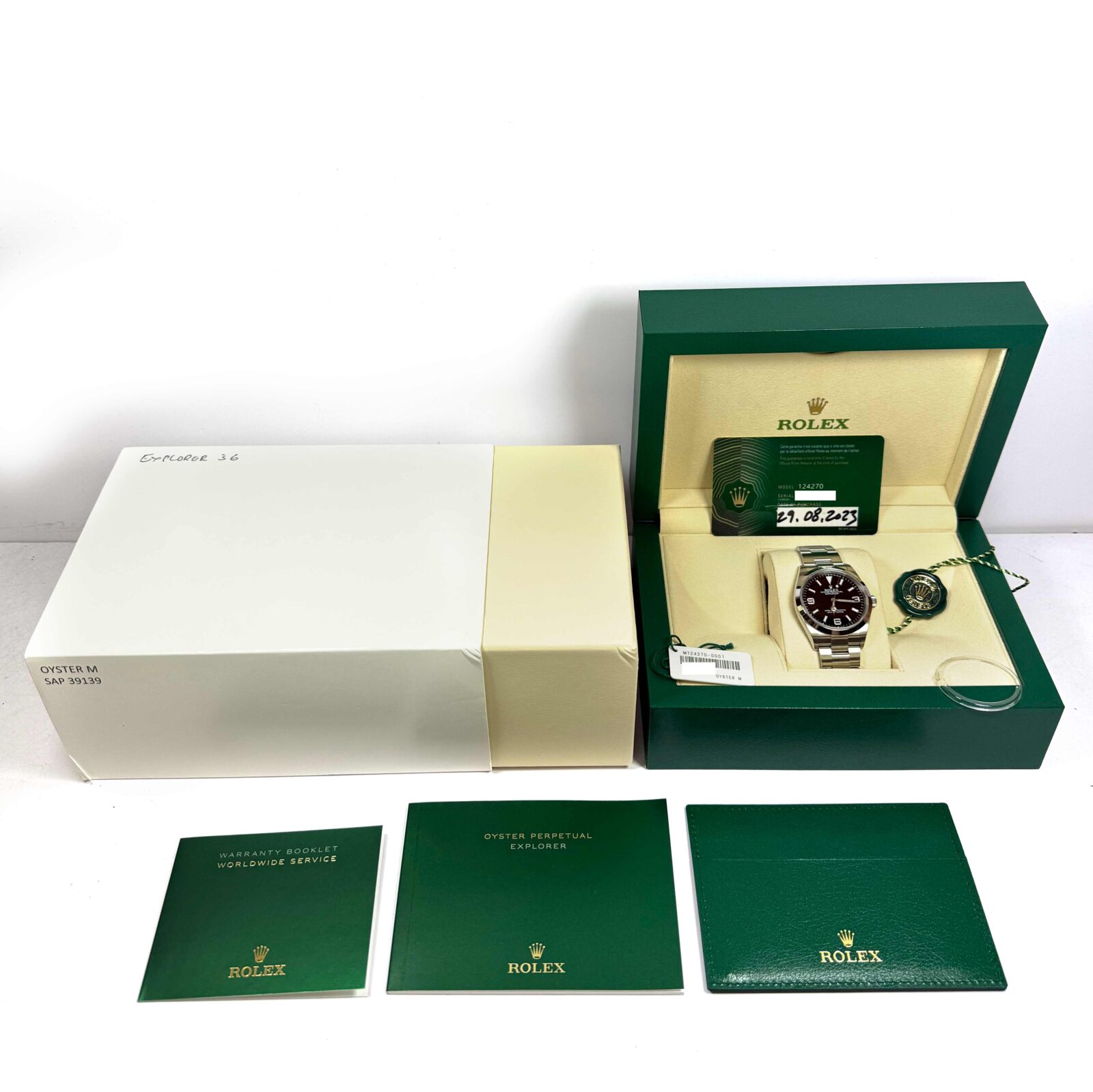 this rolex is new and comes with its box, booklets, bezel protector, both hang tags, and warranty card dateed august 29th, 2023 as shown in the pictures attached. This watch is in stock and available to ship immediately!