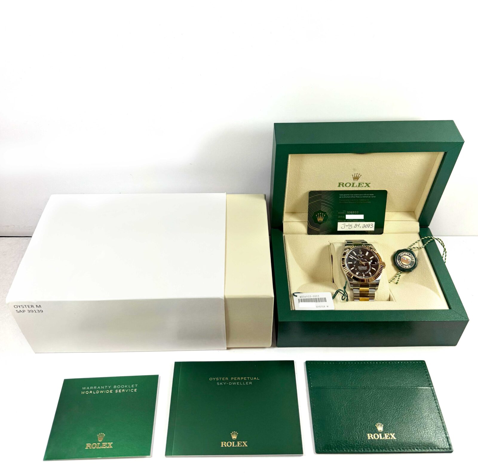 This Rolex is new with some stickers and comes with its box, booklets, both hang tags, and warranty card dated July 24th, 2023 as shown in the pictures attached. This watch is in stock and available to ship immediately!