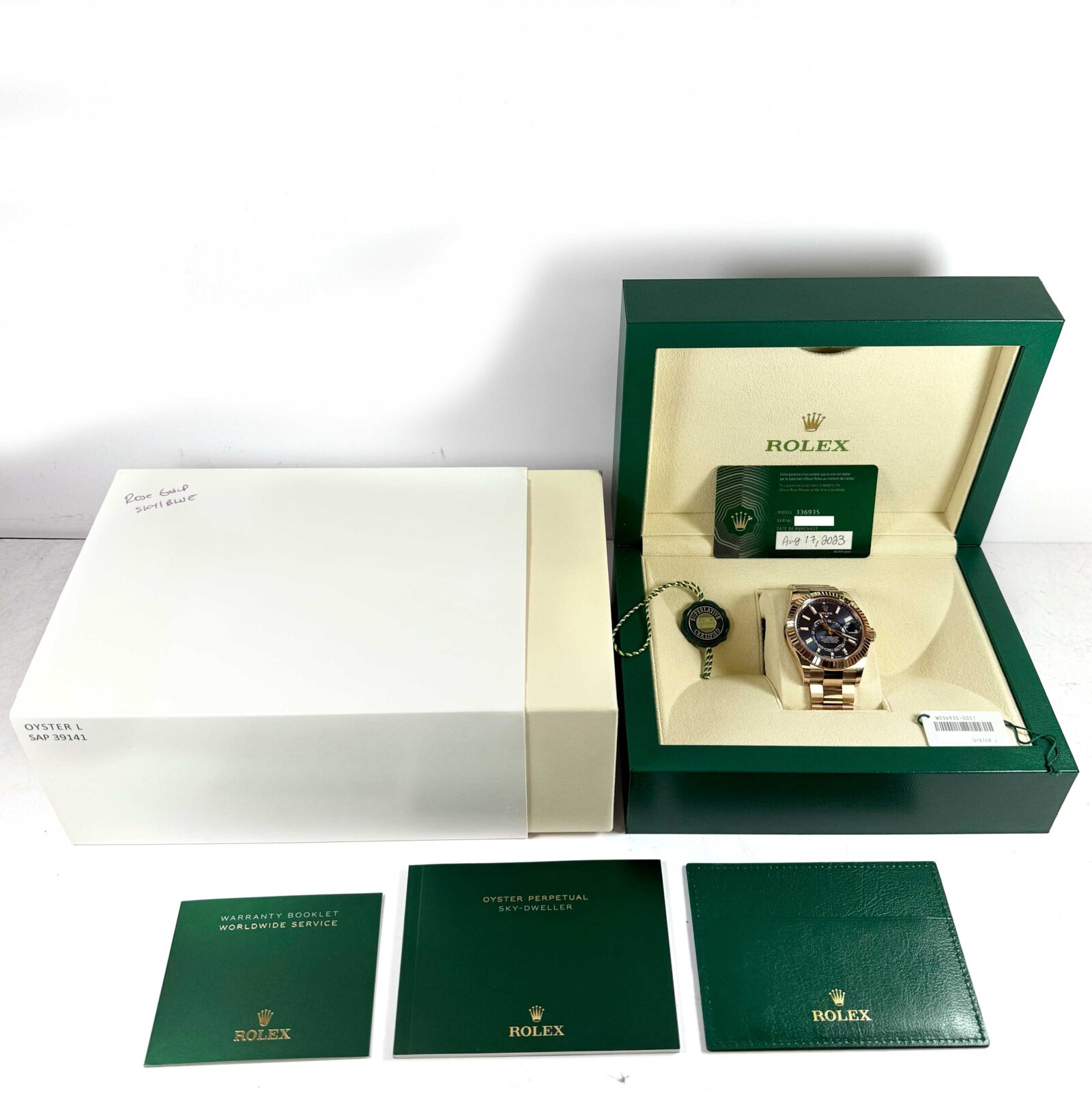 This Rolex is new and comes with its box, booklets, both hang tags, and warranty card dated August 17th, 2023 as shown in the pictures attached. This watch is in stock and available to ship immediately!
